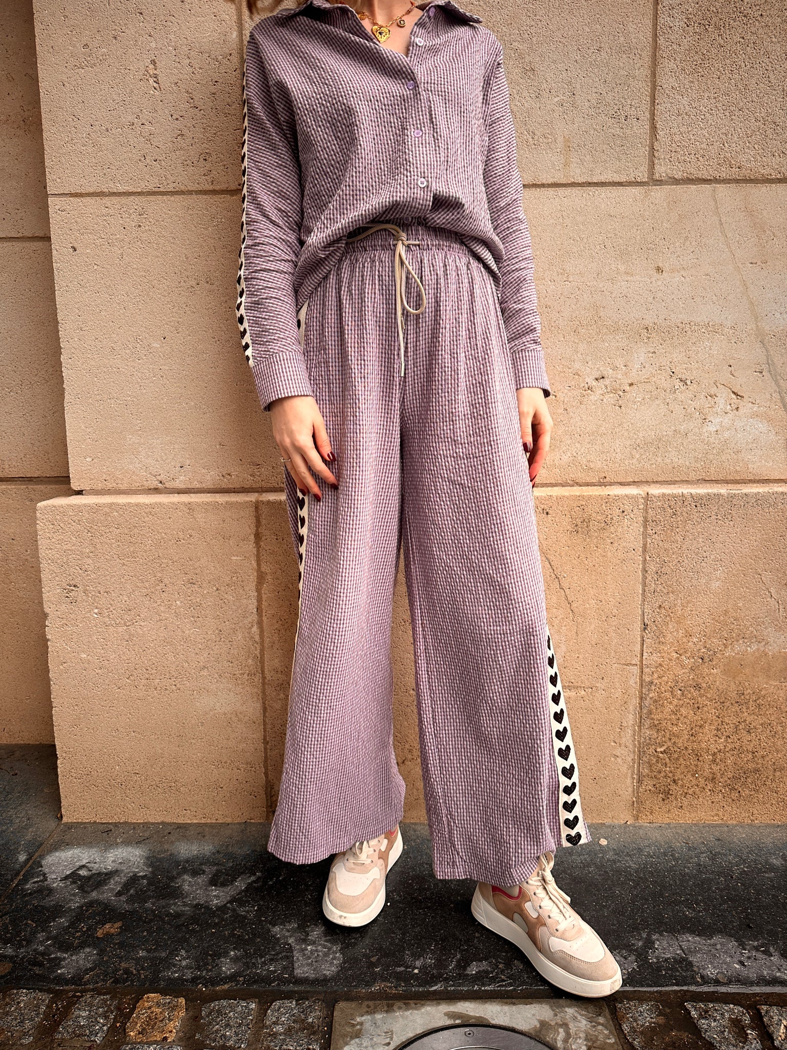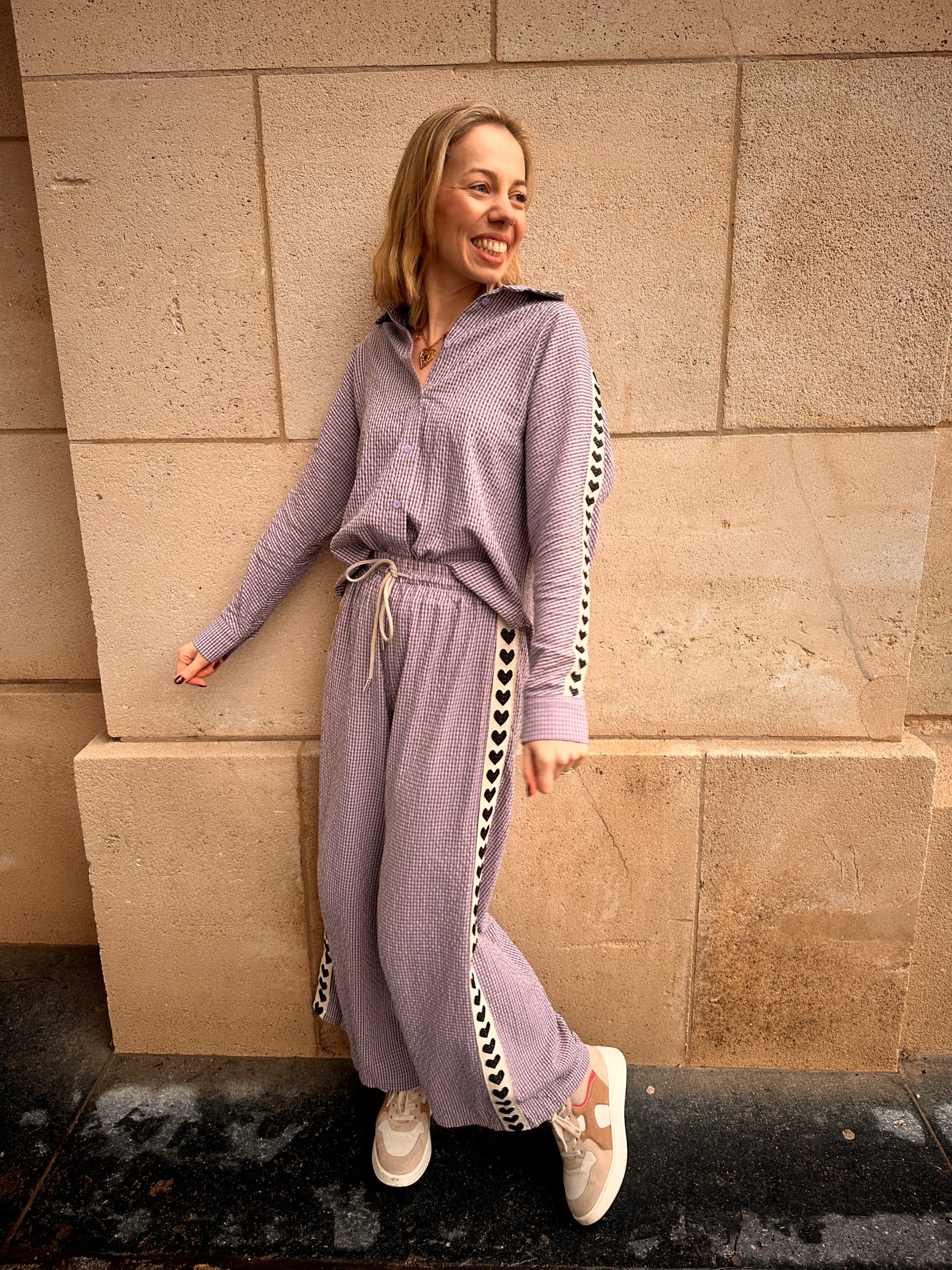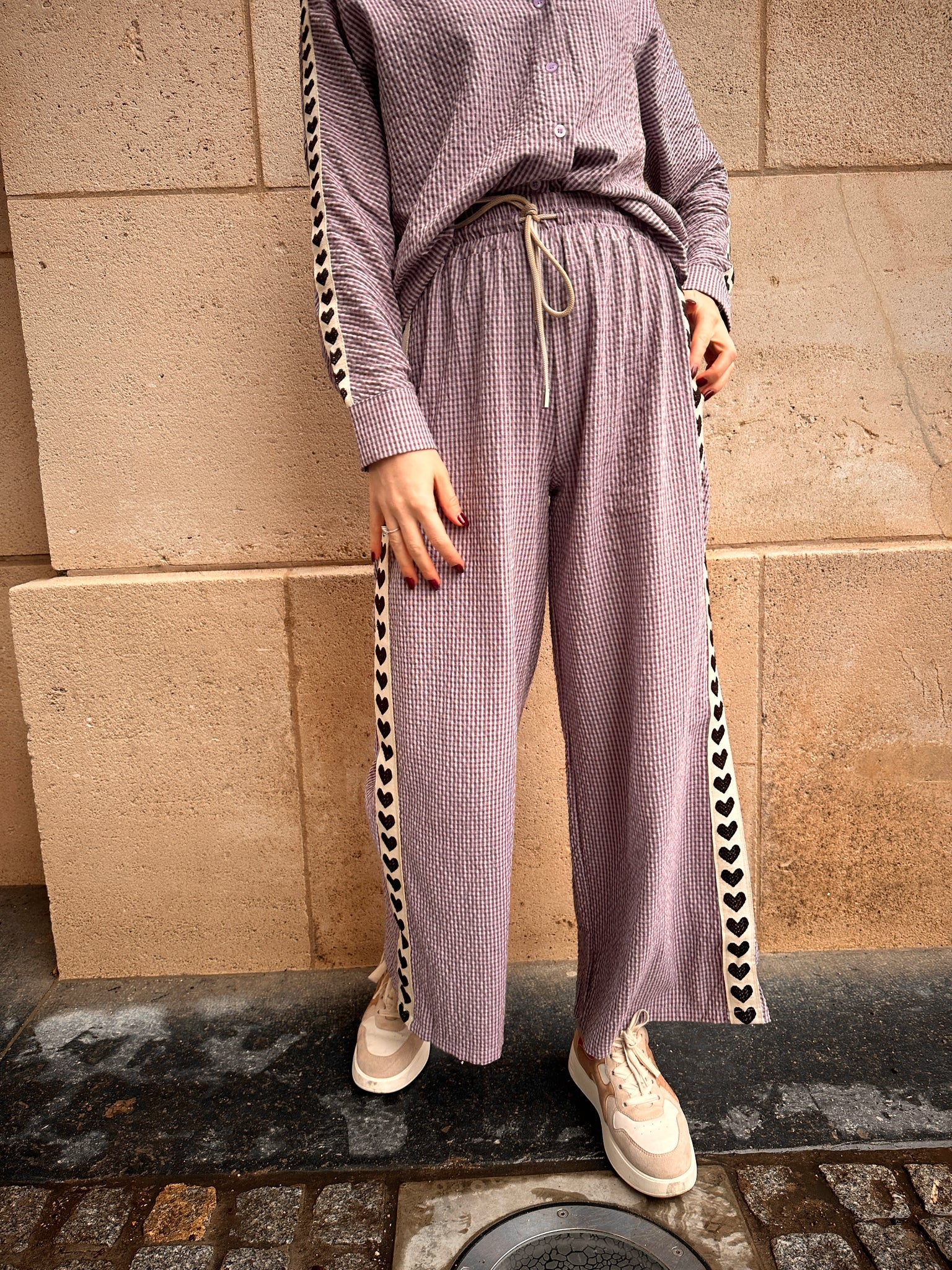 Maak kennis met jouw nieuwe favoriete broek: losse, geruite stof in warme bruin-lila tinten, met een comfortabele rekker en koordje voor de perfecte pasvorm. Het gouden bandje met zwarte hartjes aan beide zijden van de voorkant geeft een subtiel, speels accent dat elke outfit meteen vrolijk maakt.