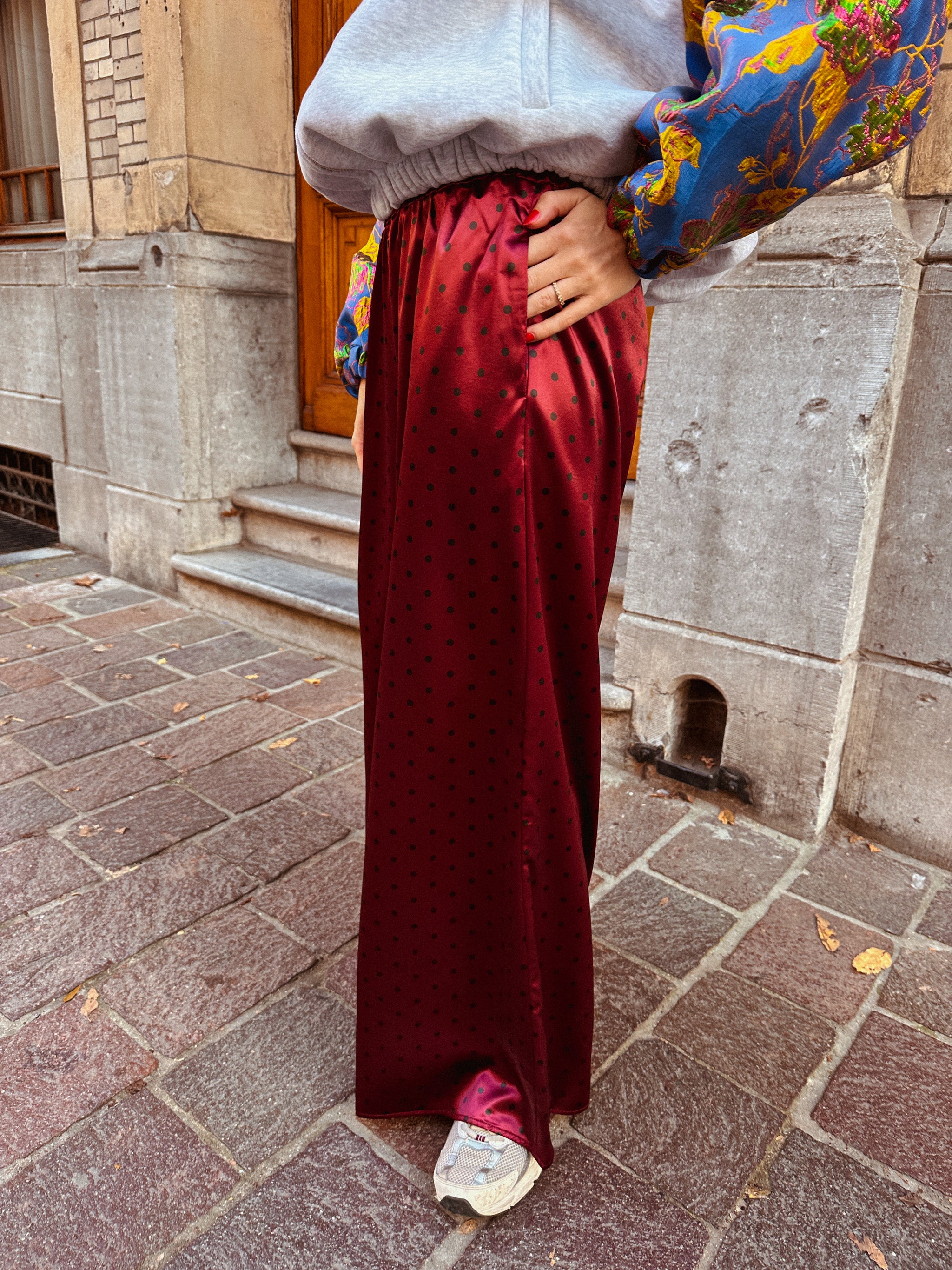 Hoe leuk is deze wijnrode polka dot rode satijnen broek? Ik was al fan van satijnen rokken dus deze broek sprong echt meteen in het oog. Heel comy met de elastiek in de taille en de losse snit.