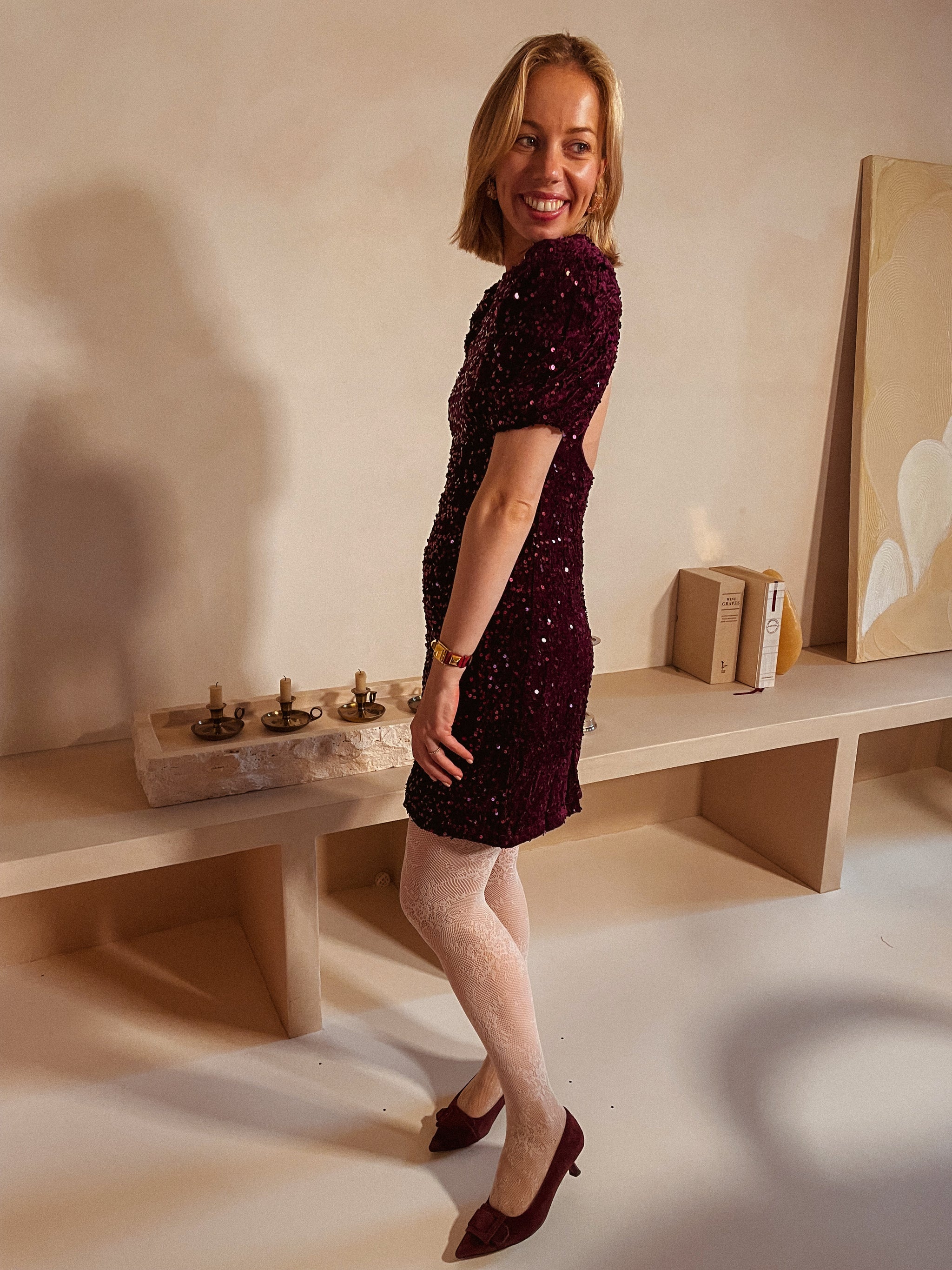 Steal the spotlight in deze korte paarse jurk met glinsterende pailletten. De korte mouwen zorgen voor een elegante touch, terwijl de open rug een sexy en gedurfde twist geeft. Perfect voor feestjes, gala’s of een sprankelende avond uit, deze jurk laat je stralen bij elke beweging.