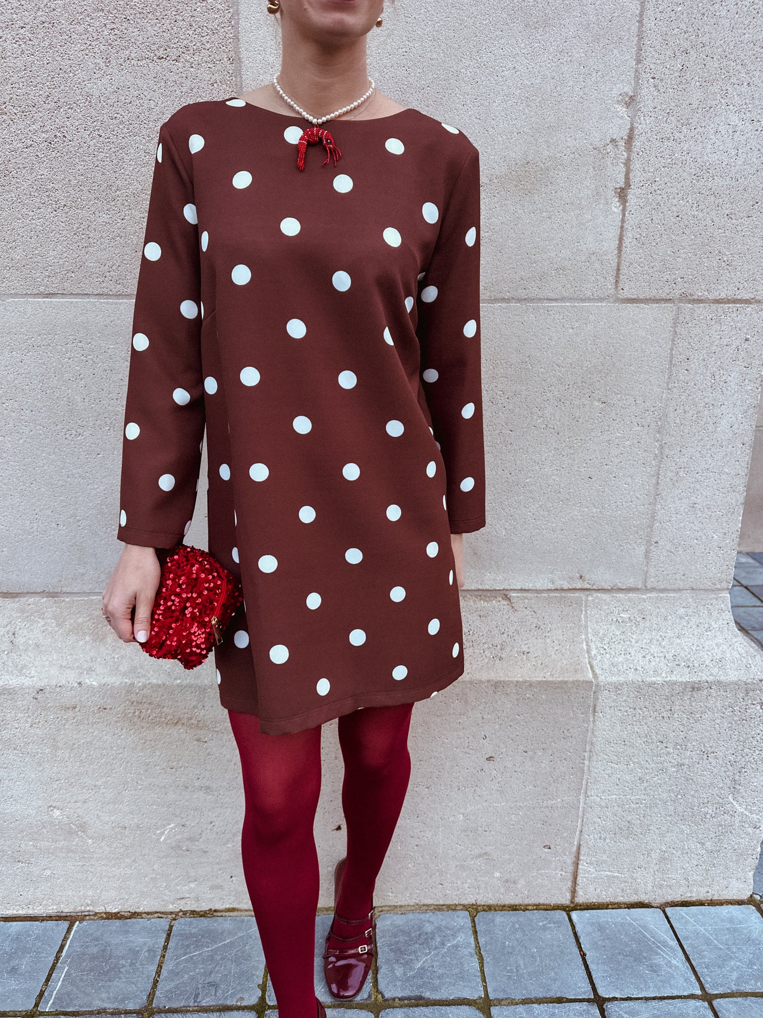 Dit bruine kleedje met witte stippen verrast met een diep uitgesneden V-rug en een grote strik voor een romantische touch.