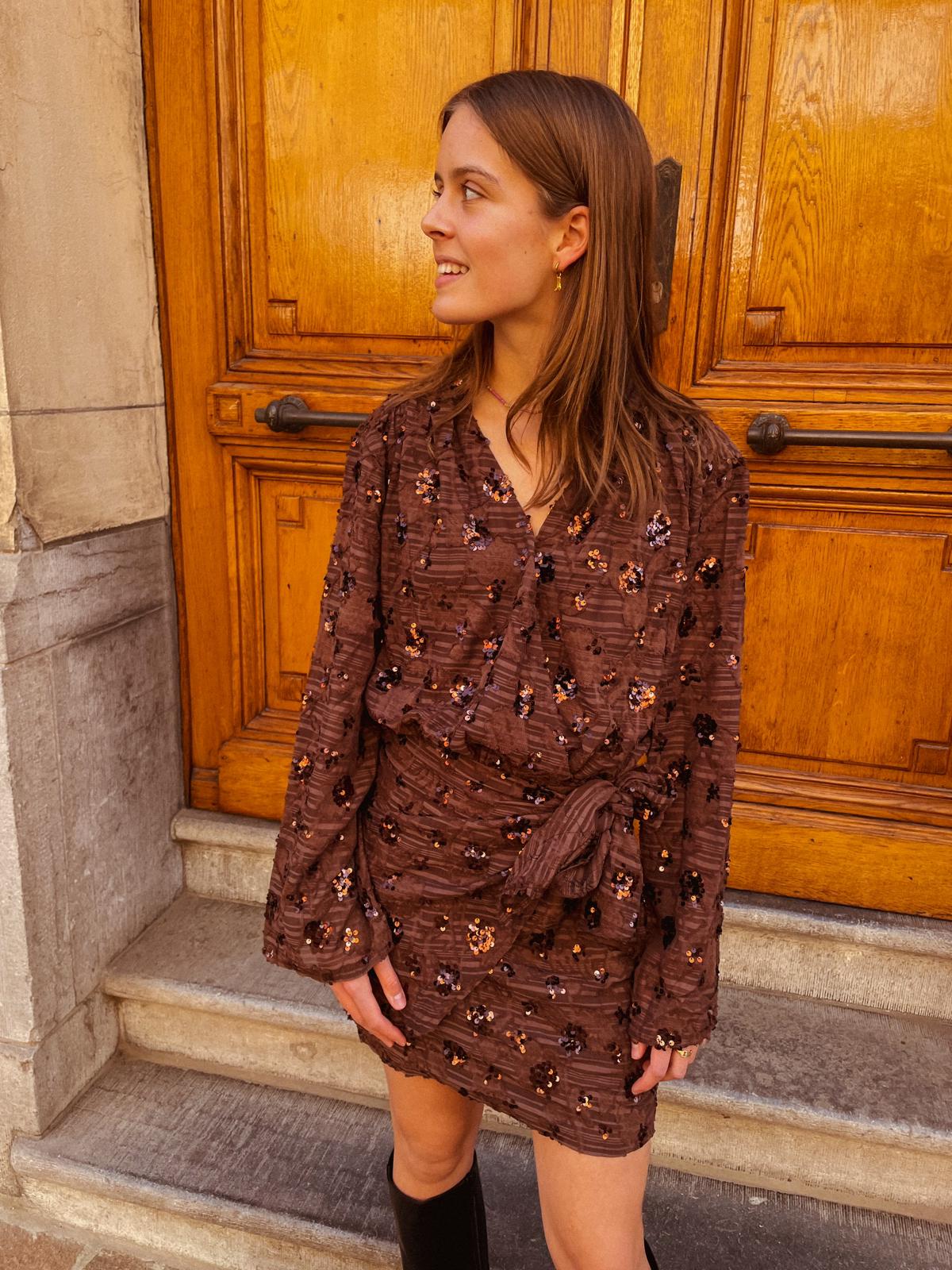 Feestelijk bruin kleedje met pailletten, volledig gevoerd en voorzien van een ritssluiting aan de zijkant. De overslag zorgt voor een elegante decolleté en een flatterend silhouet.
