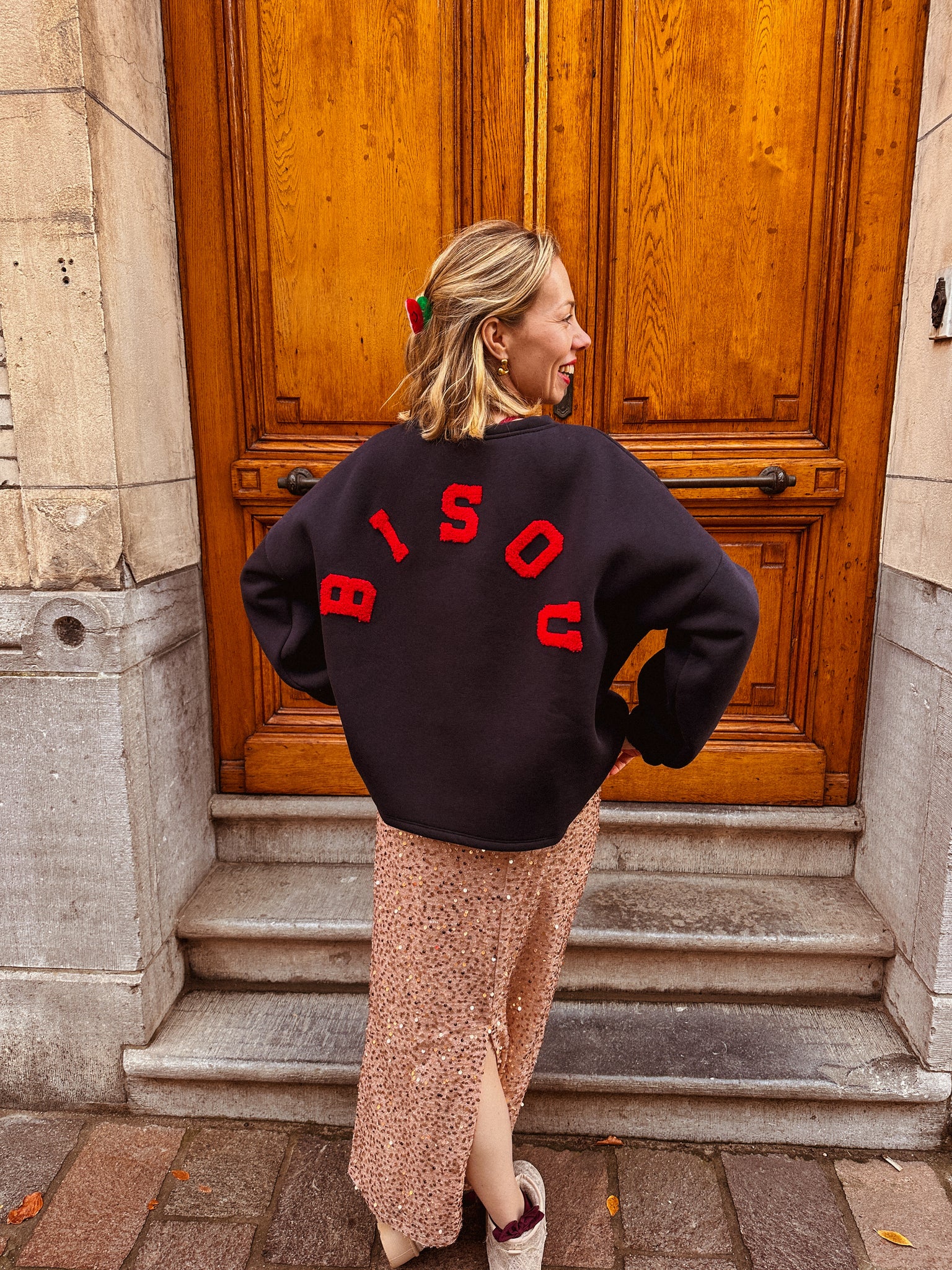 Deze oversized blauwe sweater met rode “bisou”-letters is pure cozy vibes.