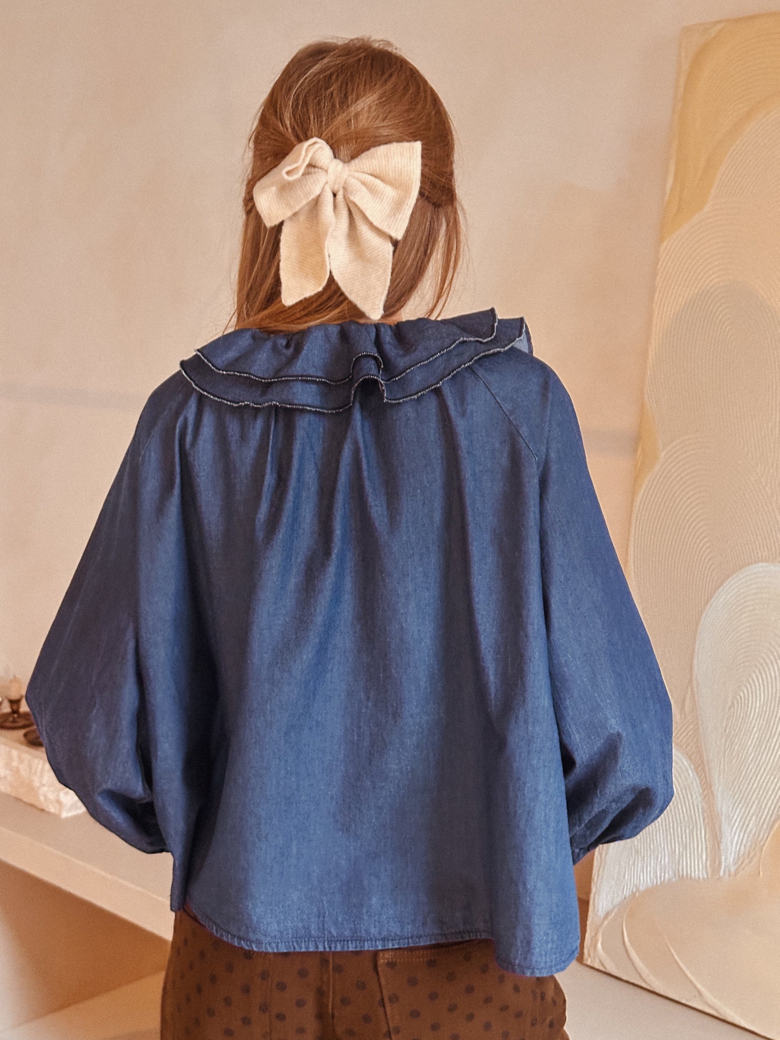 Dit donker denim bloesje combineert casual cool met een vleugje drama queen energy. De grote strik aan de voorkant en de mooie ronde hals met subtiele franjes maken het een uniek statement piece dat je outfit meteen stylish maakt. Perfect voor werk, brunch of een avondje uit.