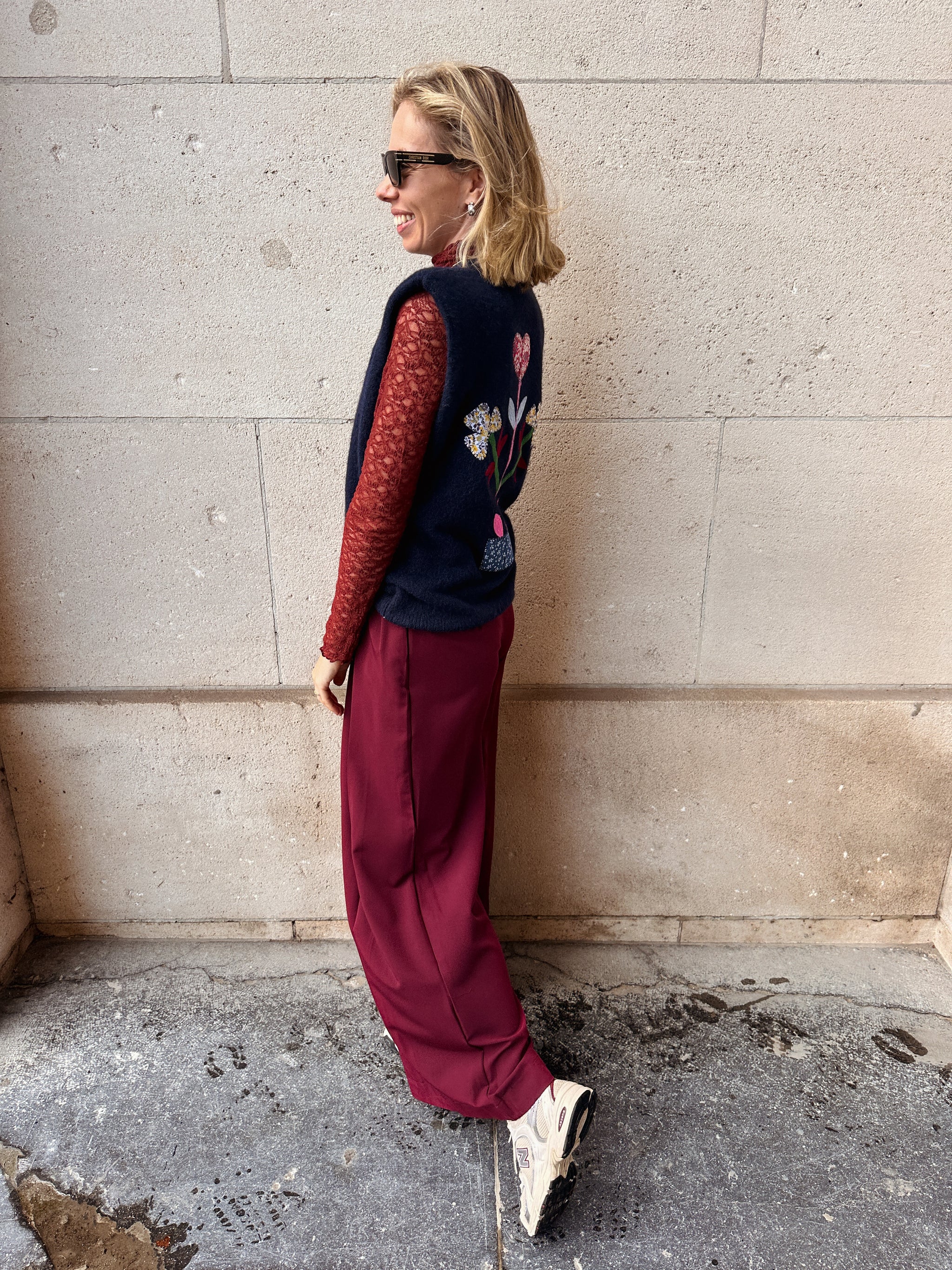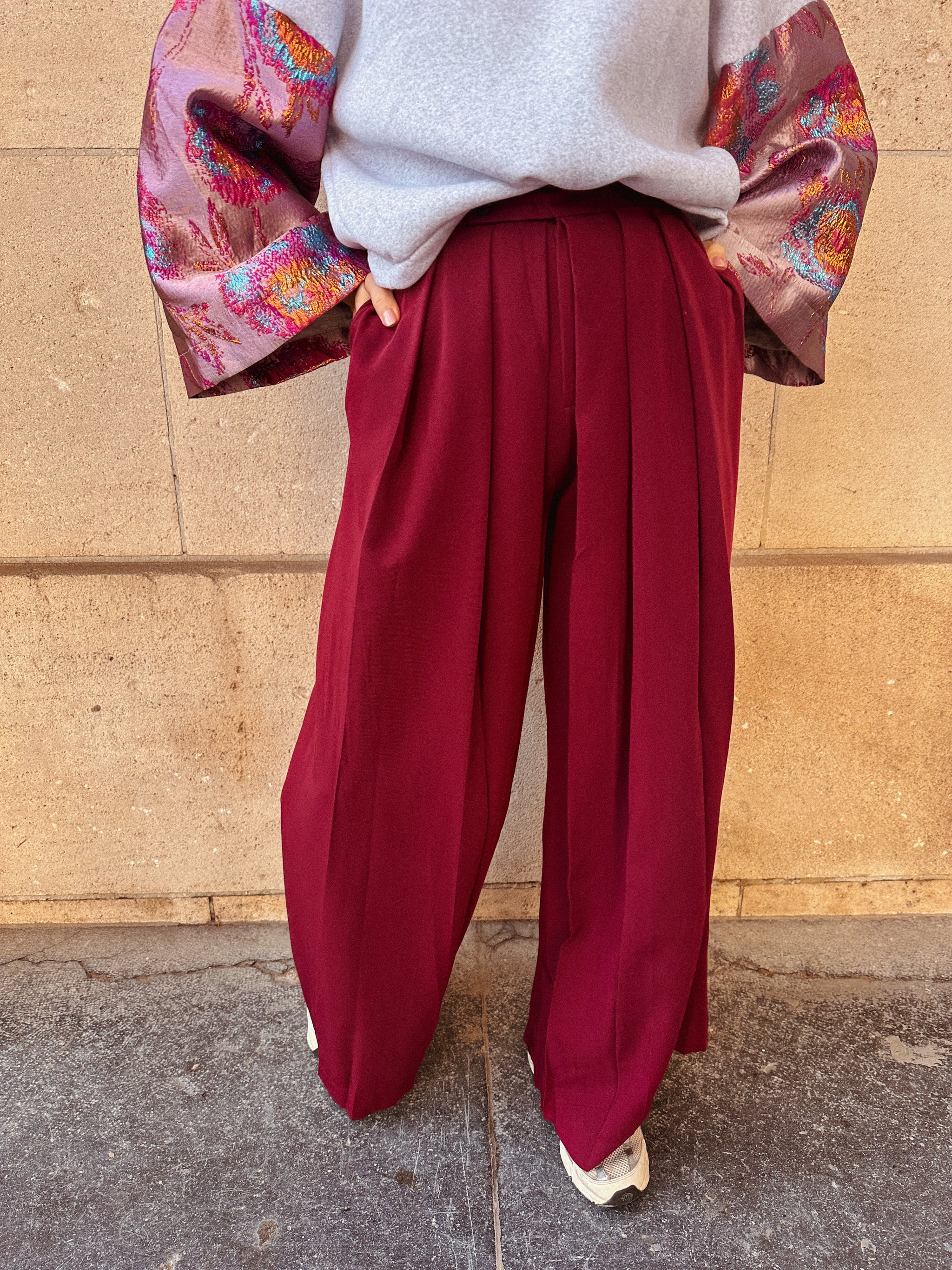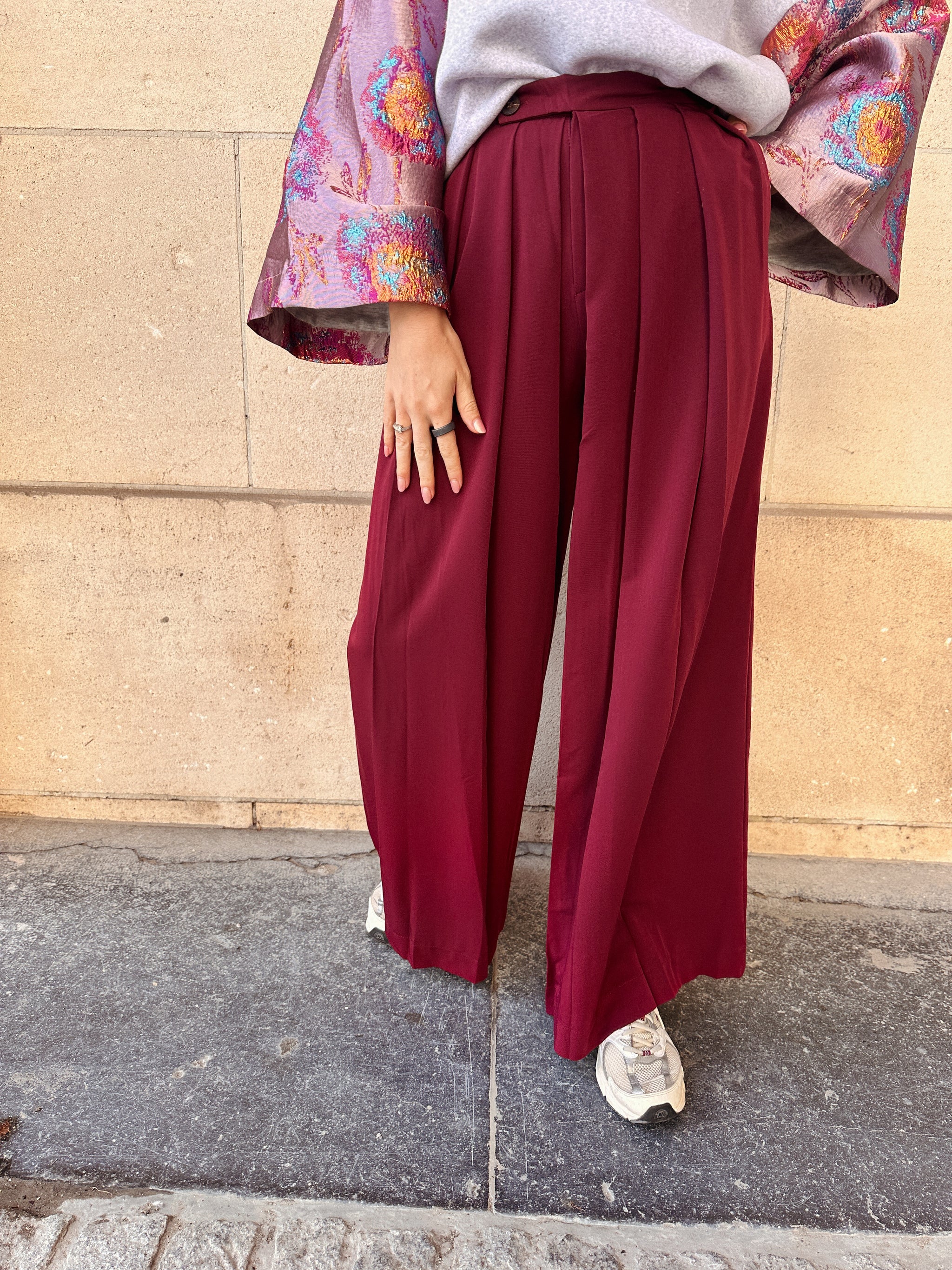 De Mila broek in warm bordeaux is het perfecte statementstuk voor dit seizoen. Het wijde model met elegante plooien geeft volume op de juiste plekken, terwijl de aangesnoerde taille je figuur mooi benadrukt.