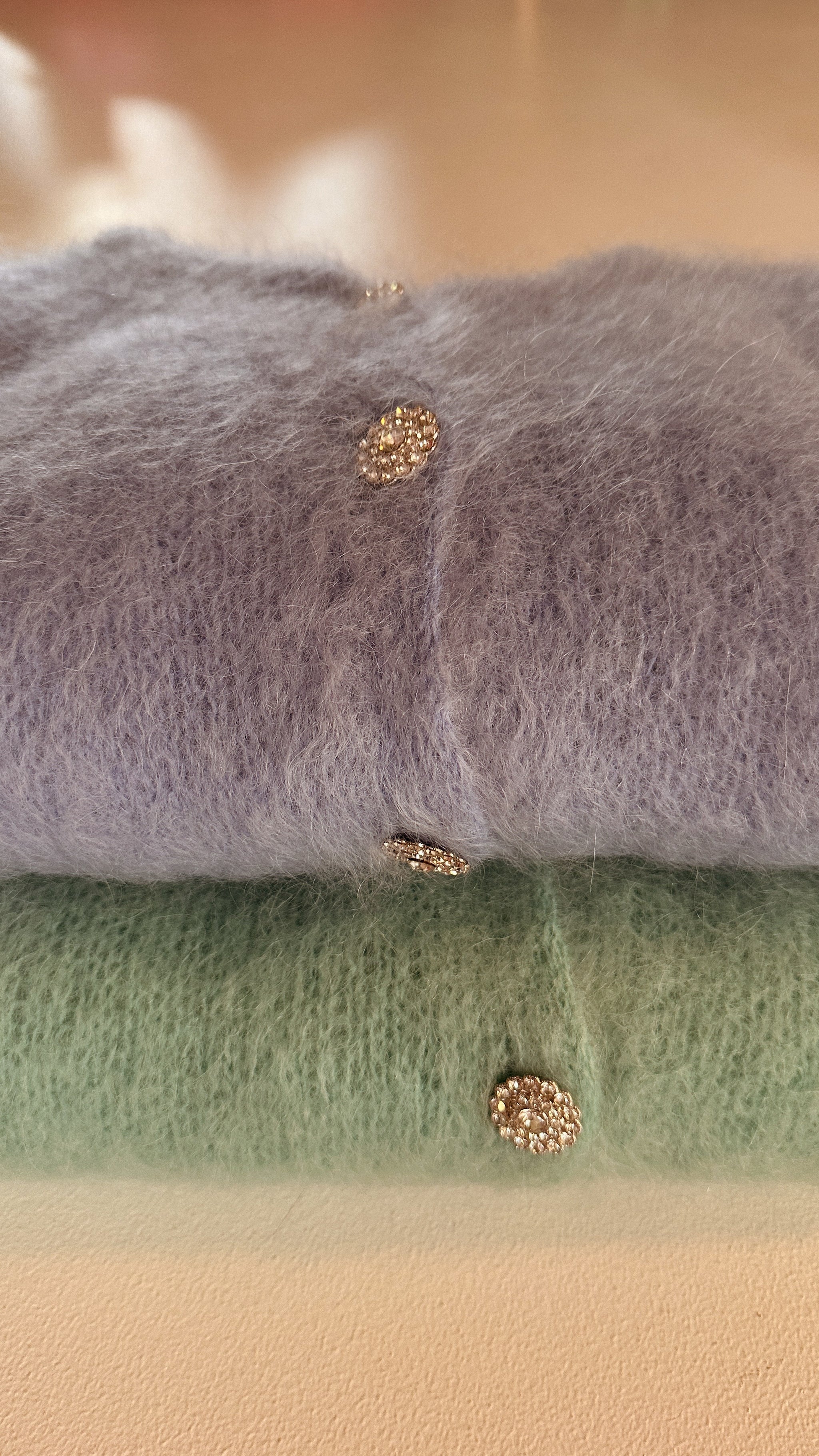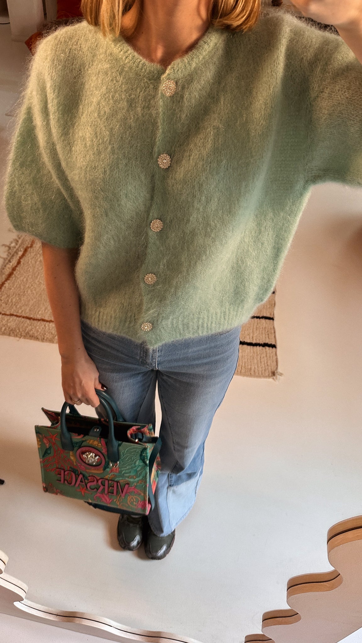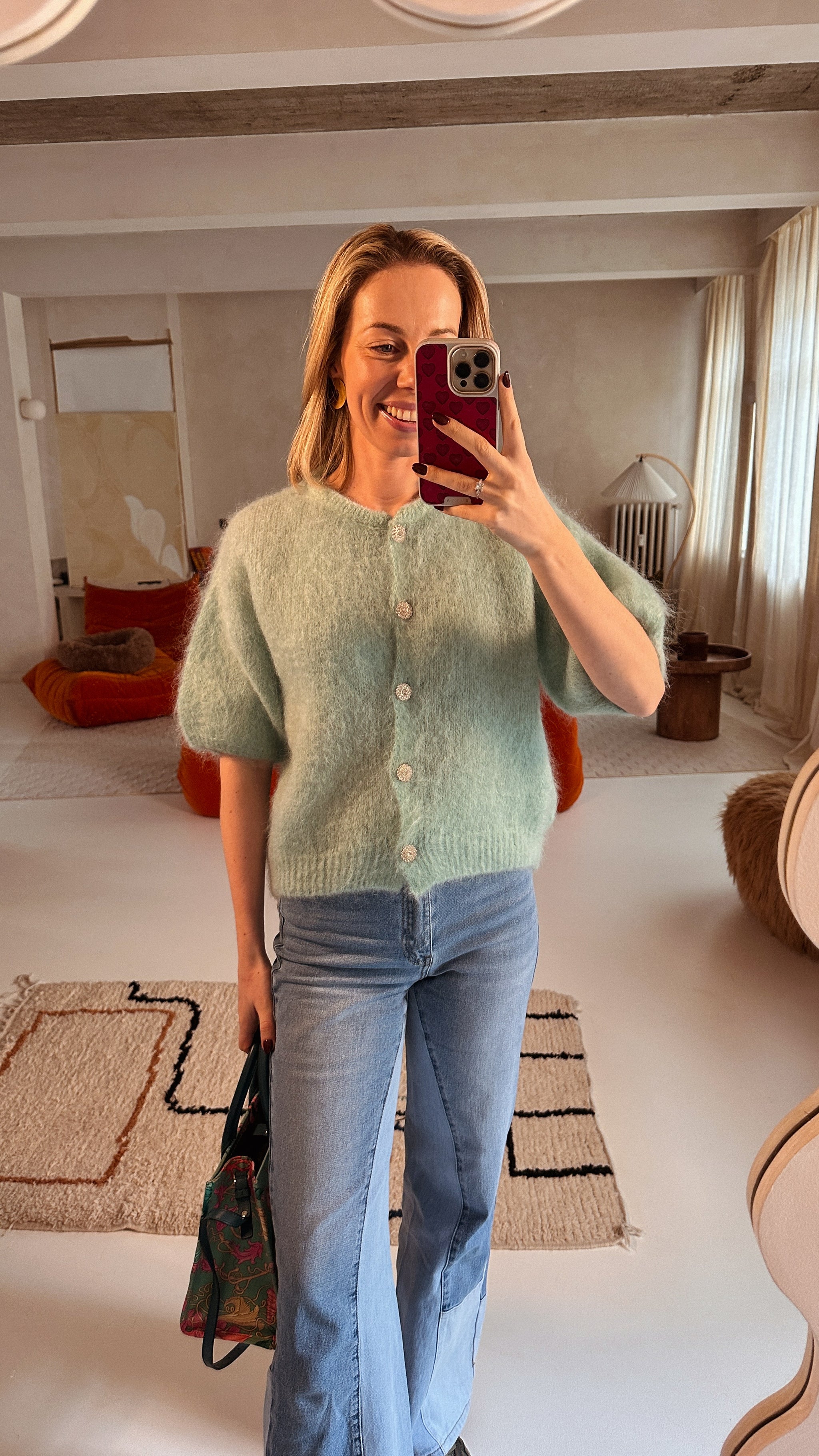 Deze zachte wollen trui in 80% kid-mohair in mintgroene kleur combineert comfort met verfijnde details. De korte mouwen maken het een perfect tussenseizoensitem, terwijl de mooie knopen met sprankelende strass-steentjes een subtiele, luxe touch geven. Een tijdloos en chic kledingstuk dat moeiteloos casual en elegant kan worden gestyled.