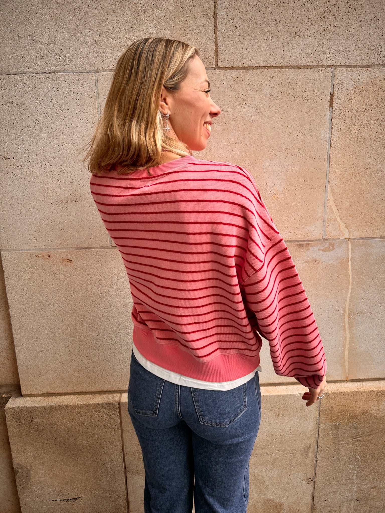 Deze zachte trui straalt puur Happiness uit! De speelse roze/burgundy gestreepte trui en het frisse t-shirt randje onderaan geven de trui een vrolijke, zonnige look. Comfy, lief en onweerstaanbaar leuk. Een echte feel-good favoriet