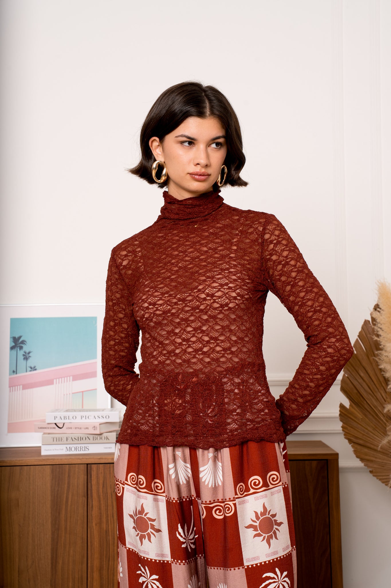 De Olivia top is een verfijnde toevoeging aan je garderobe. Deze bordeaux kanten top met lange mouwen is vrouwelijk, licht en perfect voor laagjes. De rekbare stof zorgt voor een comfortabele pasvorm die mooi aansluit.