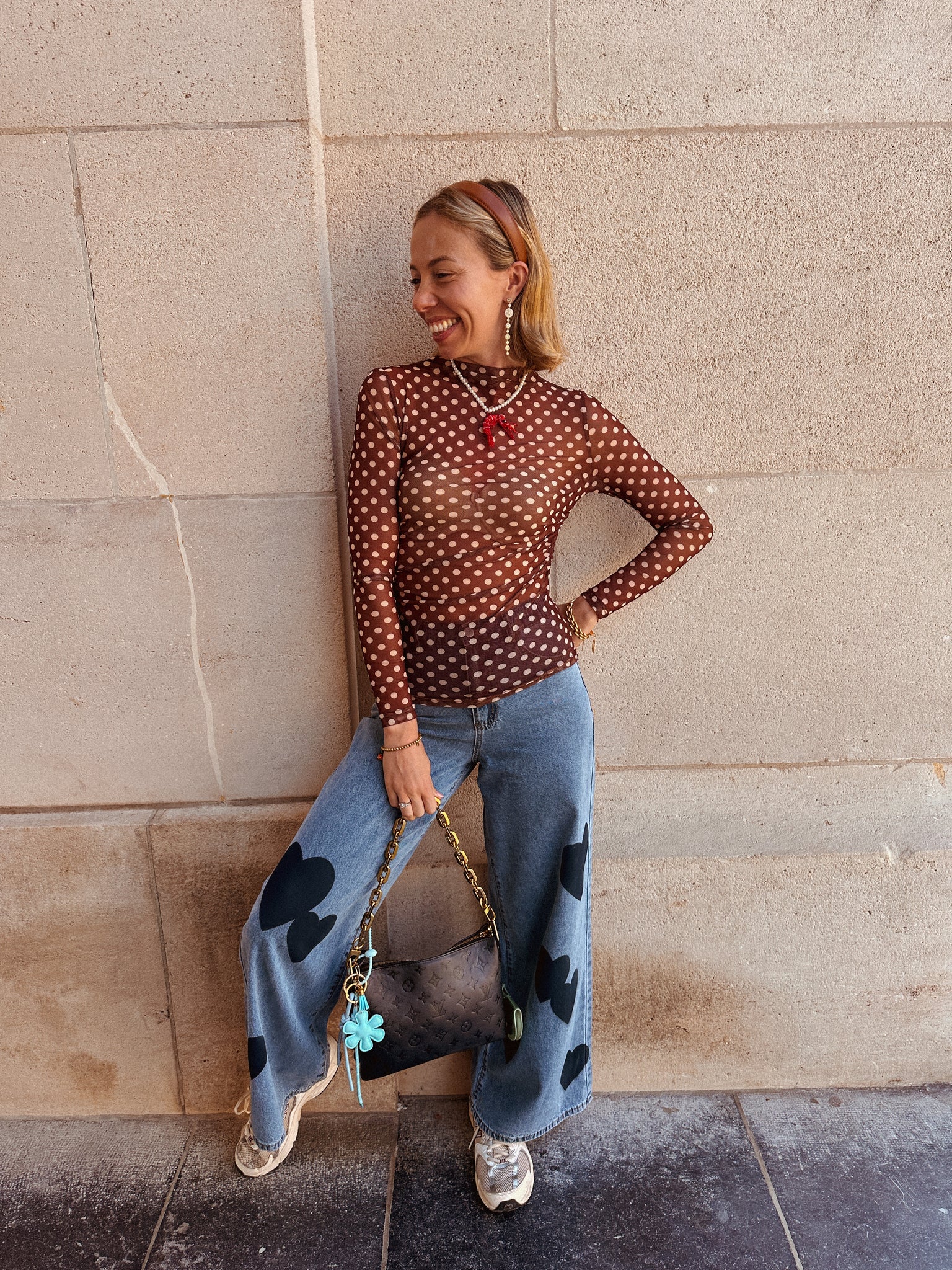 De Polka top komt in een warme bruine tint met die iconische stipjesprint waar we maar geen genoeg van krijgen.