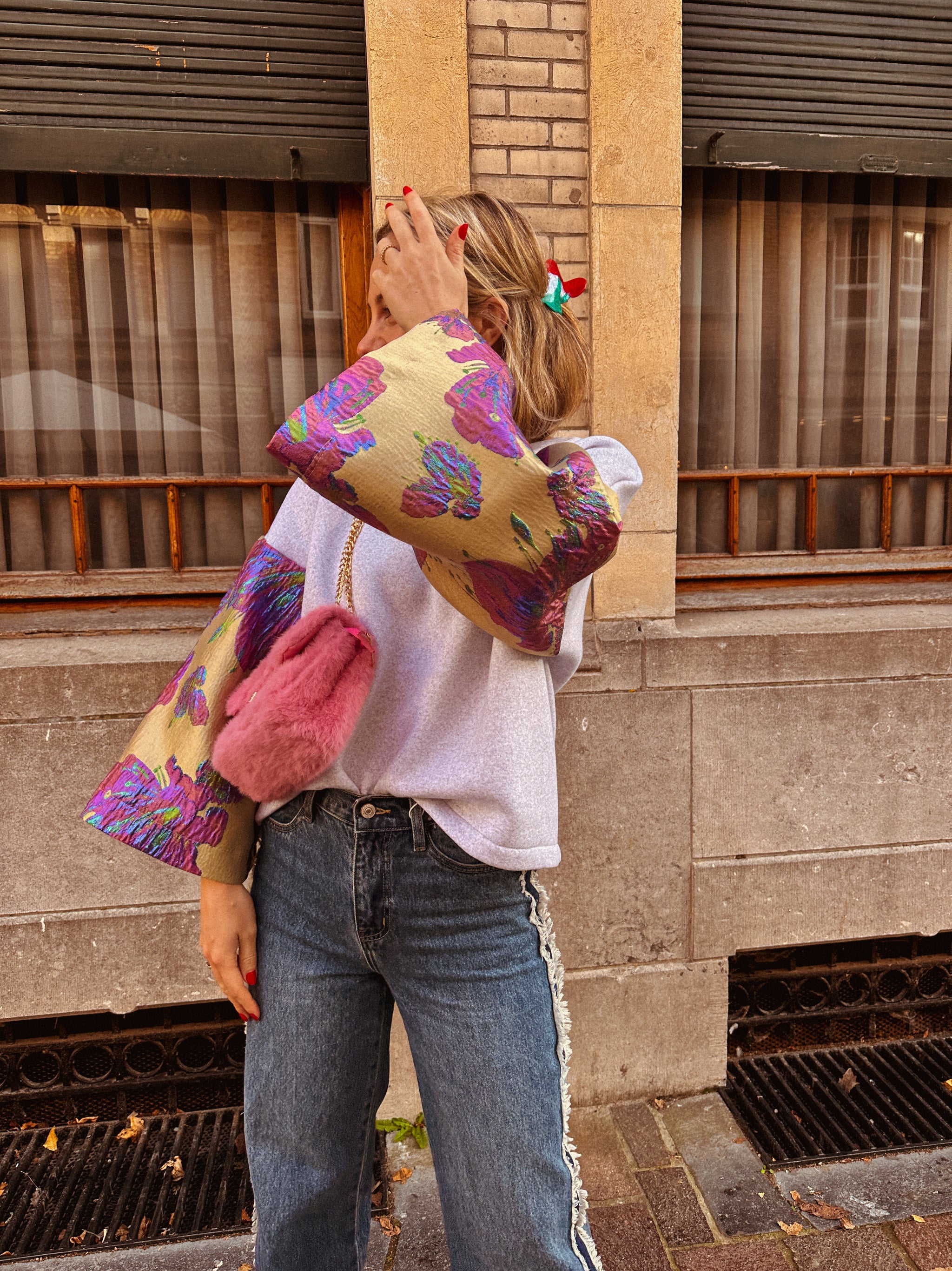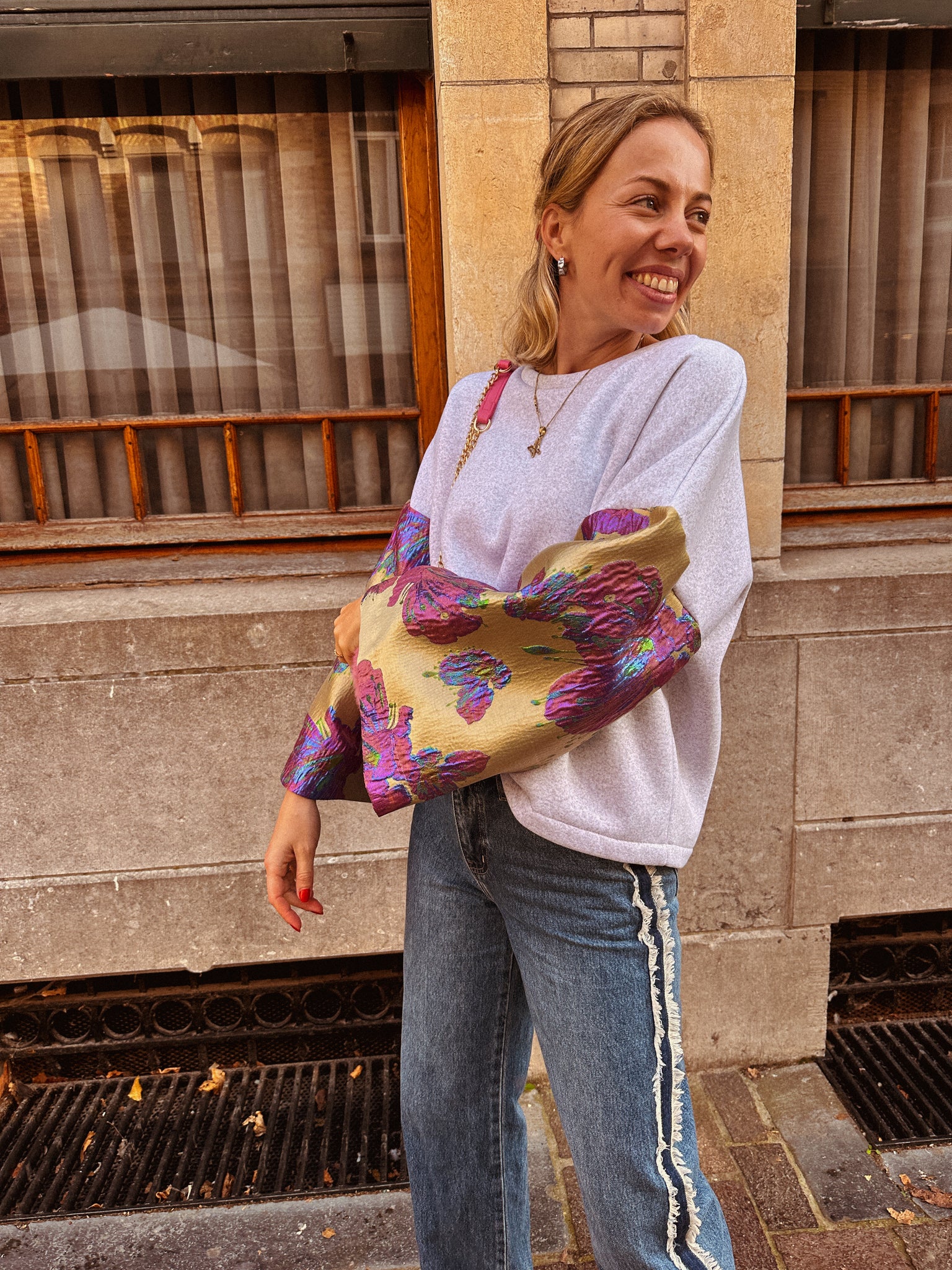 Zoek je een sweater die jouw outfit meteen afmaakt en comfy is? Dan is het deze wel! Deze zachtgrijze sweater met goud/gele mouwen en roze bloemenprint is een echt pareltje. De fleece in de sweater houdt je dan weer lekker warm.
