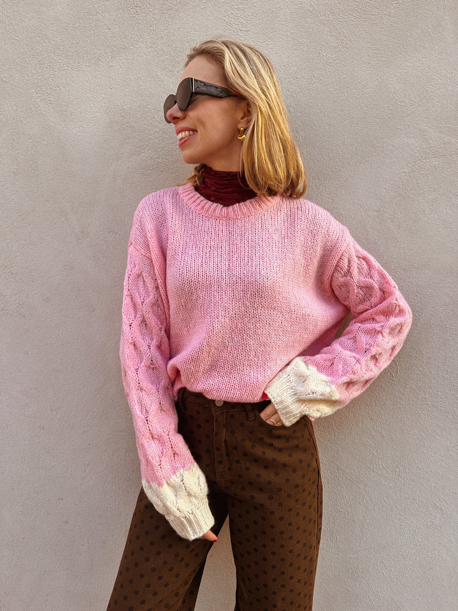 De Fenna trui is een knit om blij van te worden: een oversized model met een mooi gebreid motief, in zacht roze met een subtiel wit detail aan de mouwen. De ronde kraag en afhangende mouwen geven het die effortless cozy look. Perfect voor elke happy mood day.