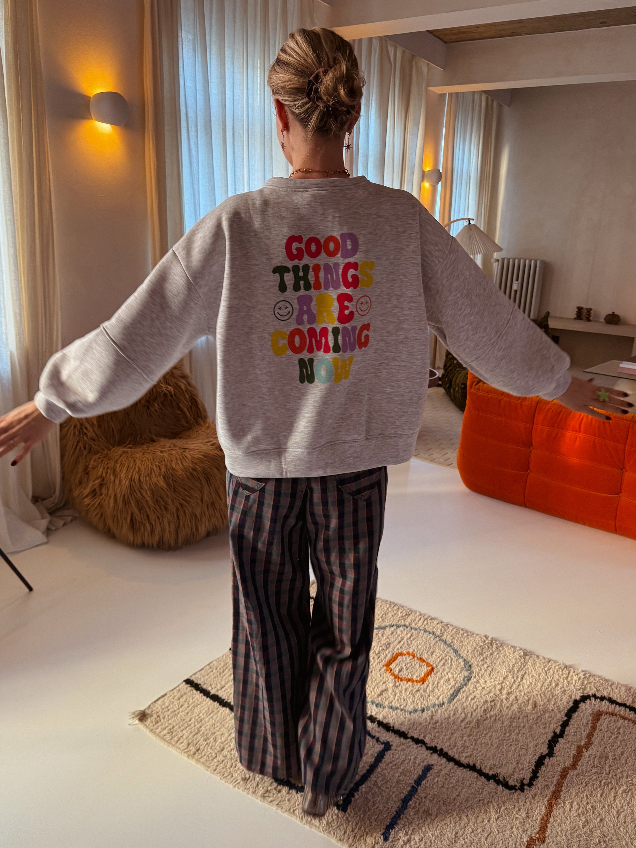 Deze zachte grijze sweater combineert comfort met een flinke dosis positieve vibes. Op de rug staat de inspirerende tekst “all good things are coming” en op de mouw een speelse reminder: “life isn’t perfect but your outfit can be.”