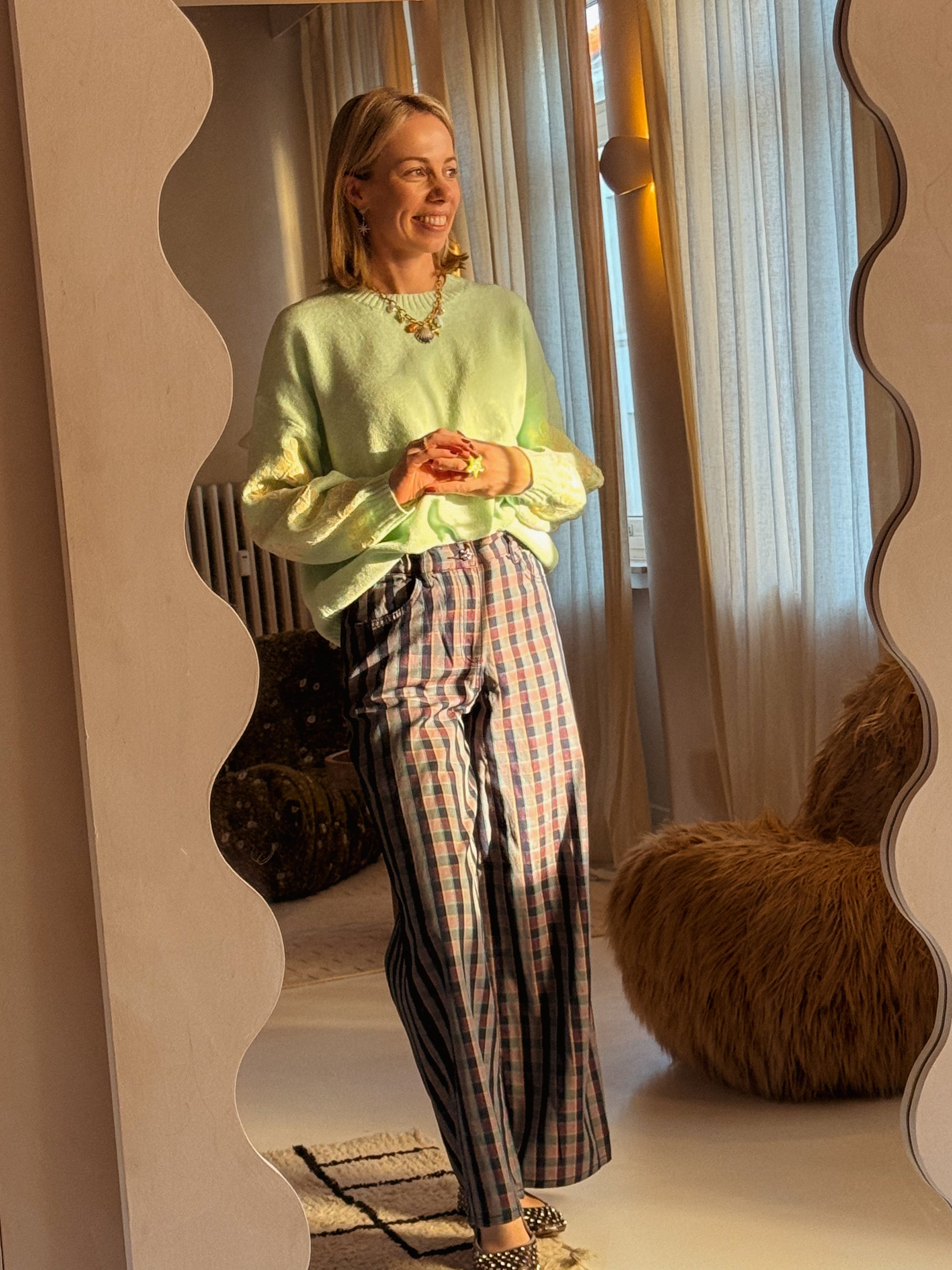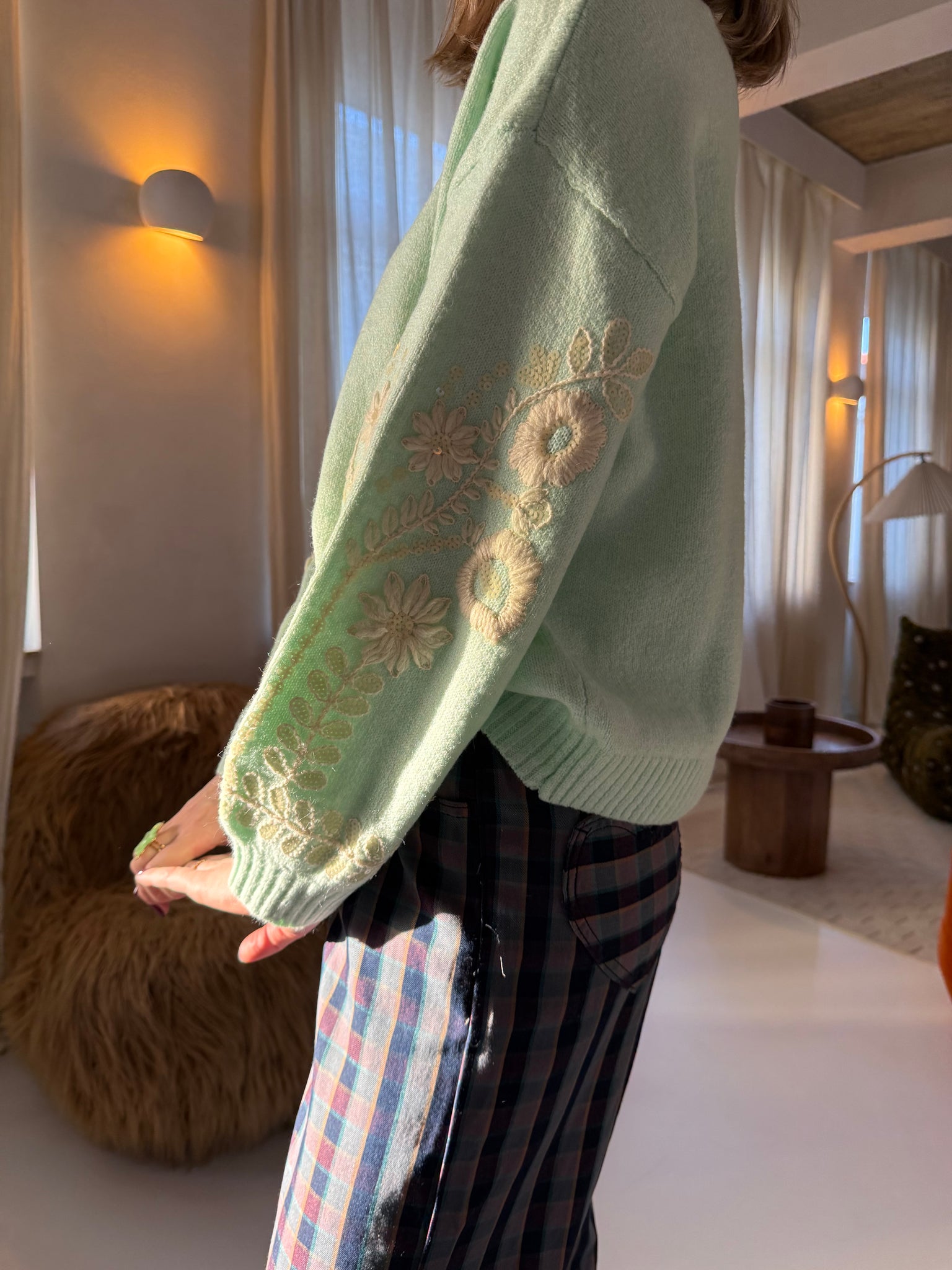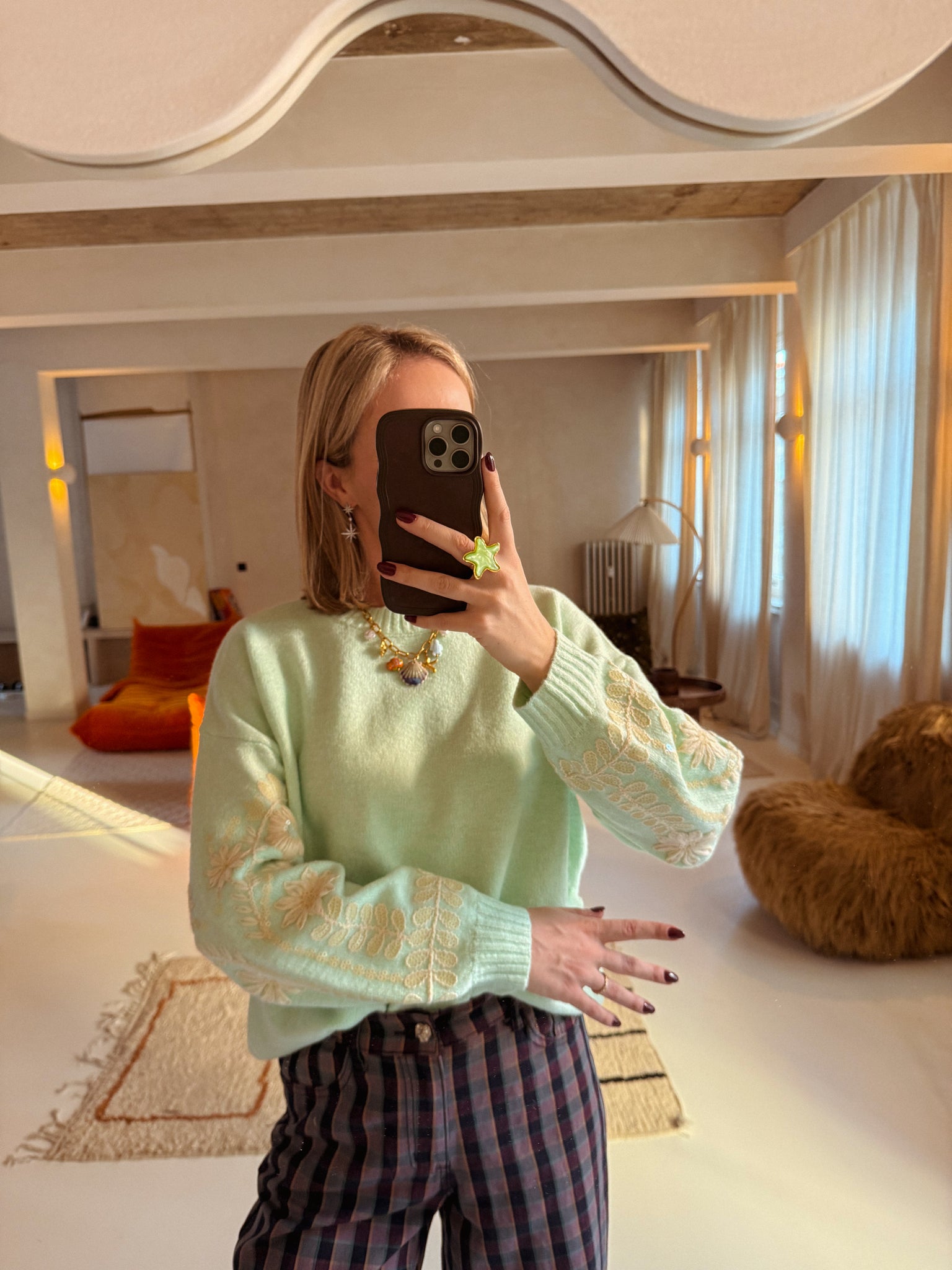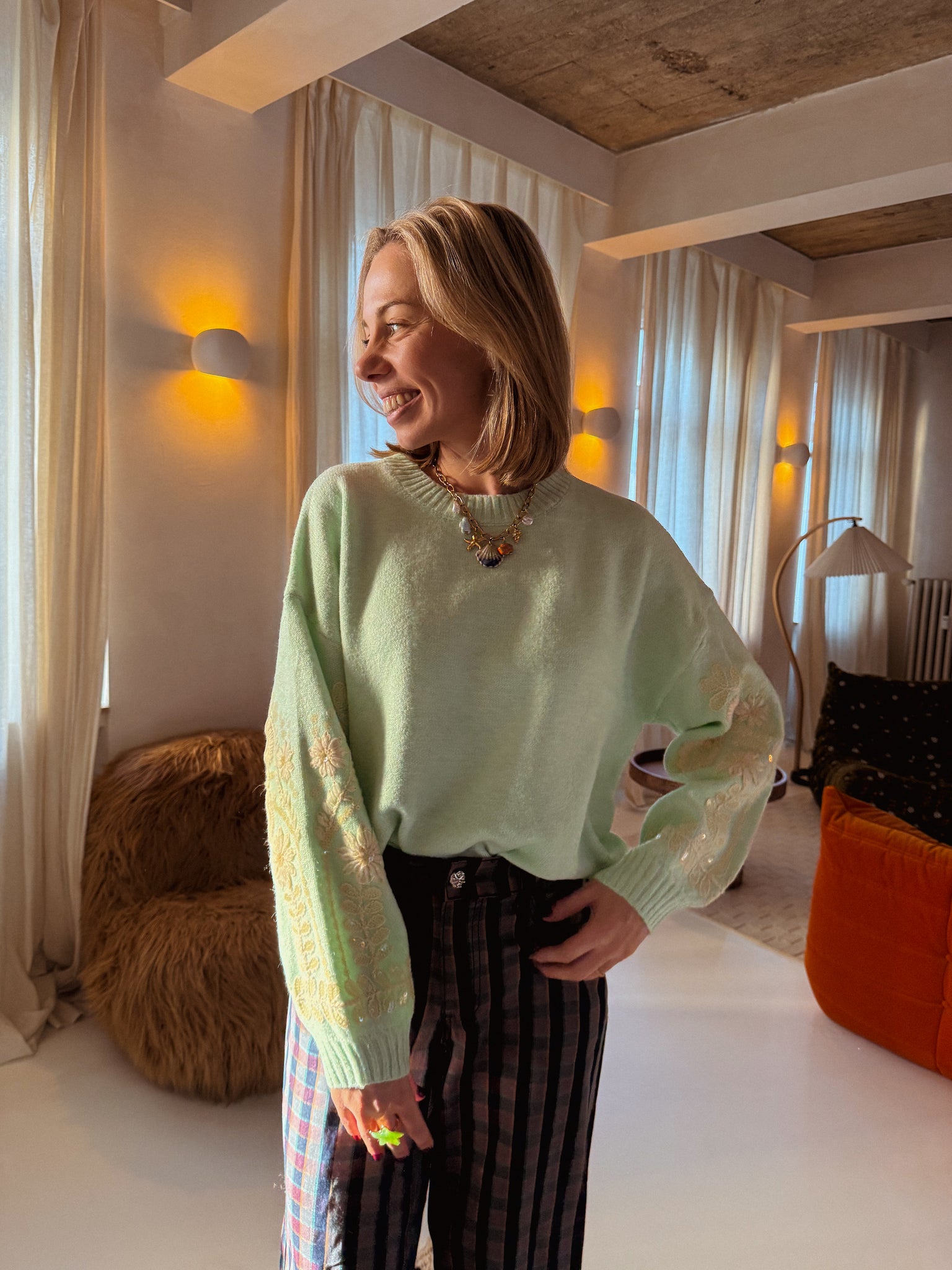 Voel je speels en vrouwelijk met deze zachte mintgroene trui! Subtiel geborduurde bloemen en fonkelende pailletjes geven de trui een elegante en vrolijke touch. Het zachte materiaal maakt ‘m heerlijk comfortabel voor elke dag, terwijl het lichte mintgroen een frisse uitstraling geeft.