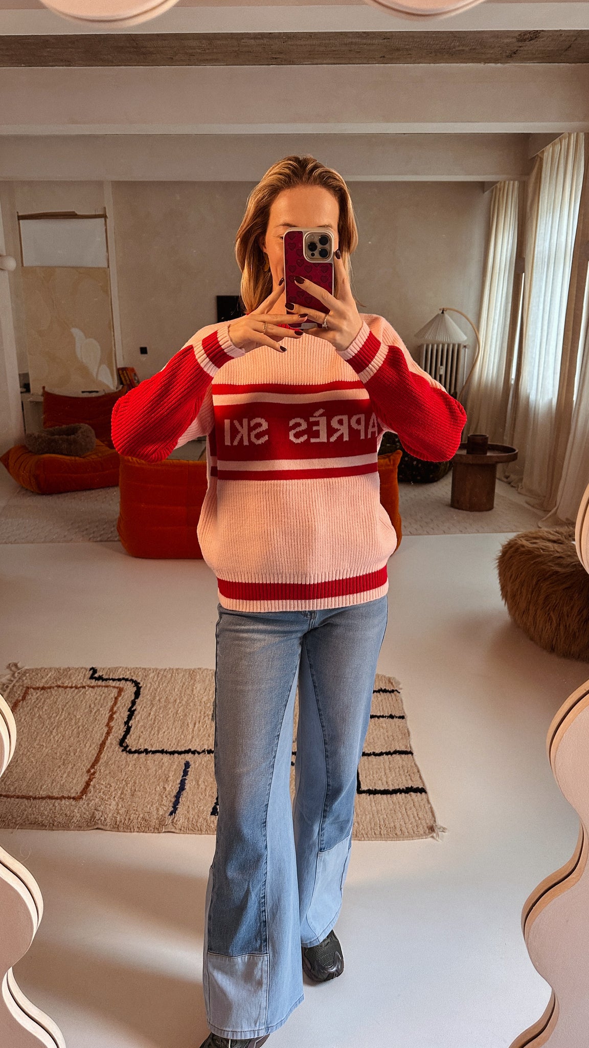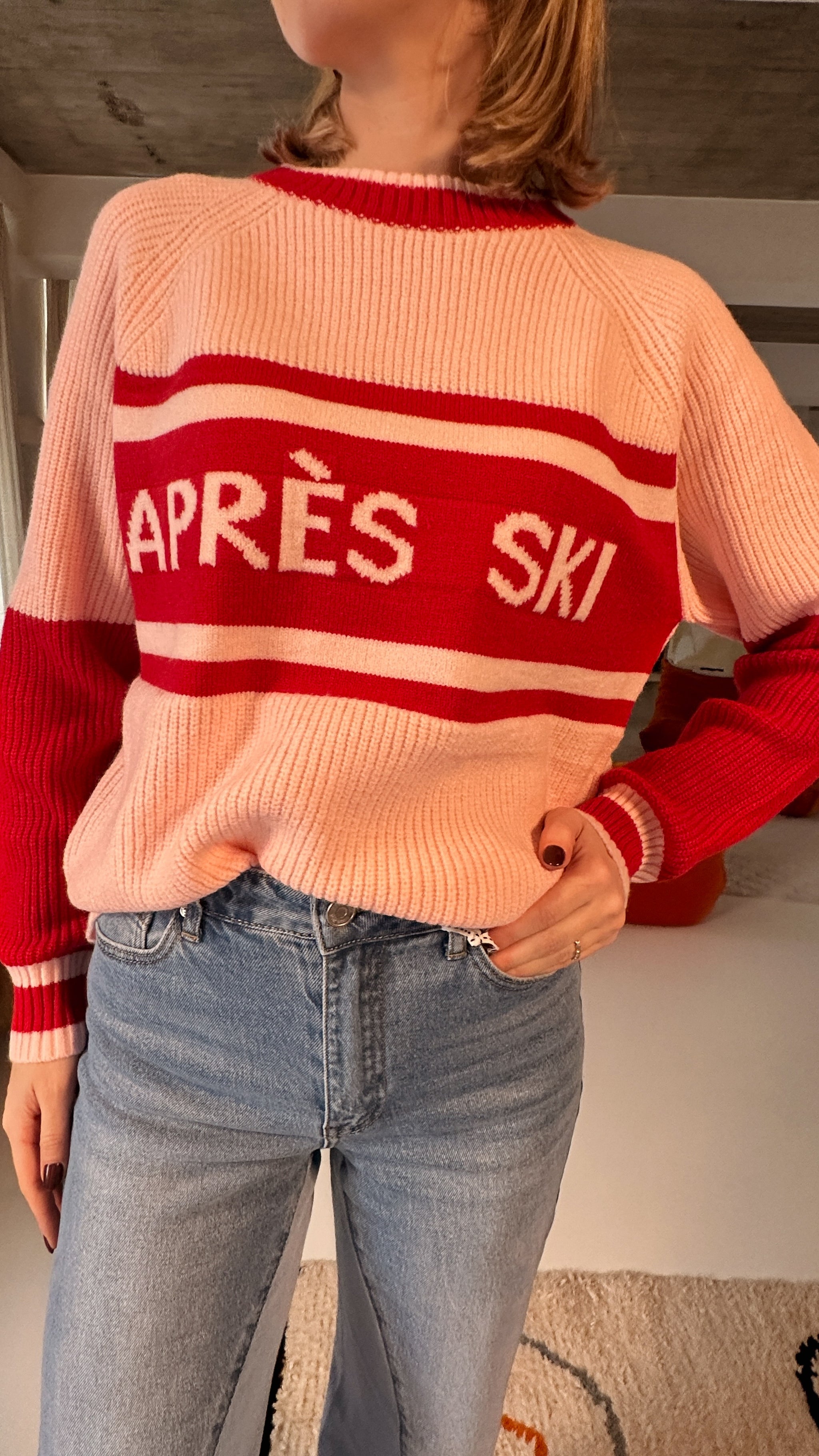 Deze roze trui met rode accenten ademt echte après-ski vibes. De “après ski” tekst op de voorkant maakt het speels en fun, terwijl de zachte stof en lange mouwen zorgen dat je heerlijk warm blijft, of je nu op het terras zit of langs de piste wandelt