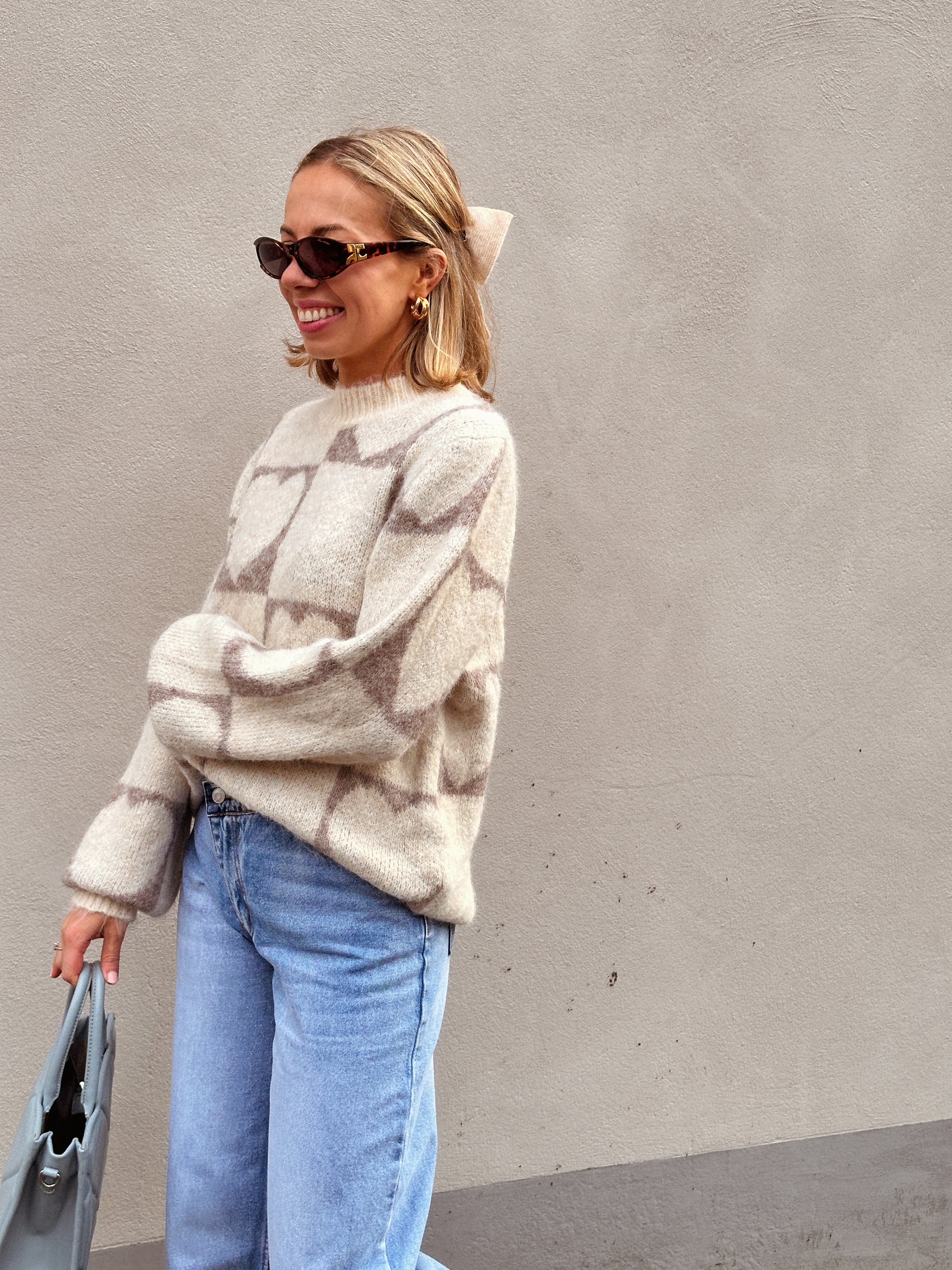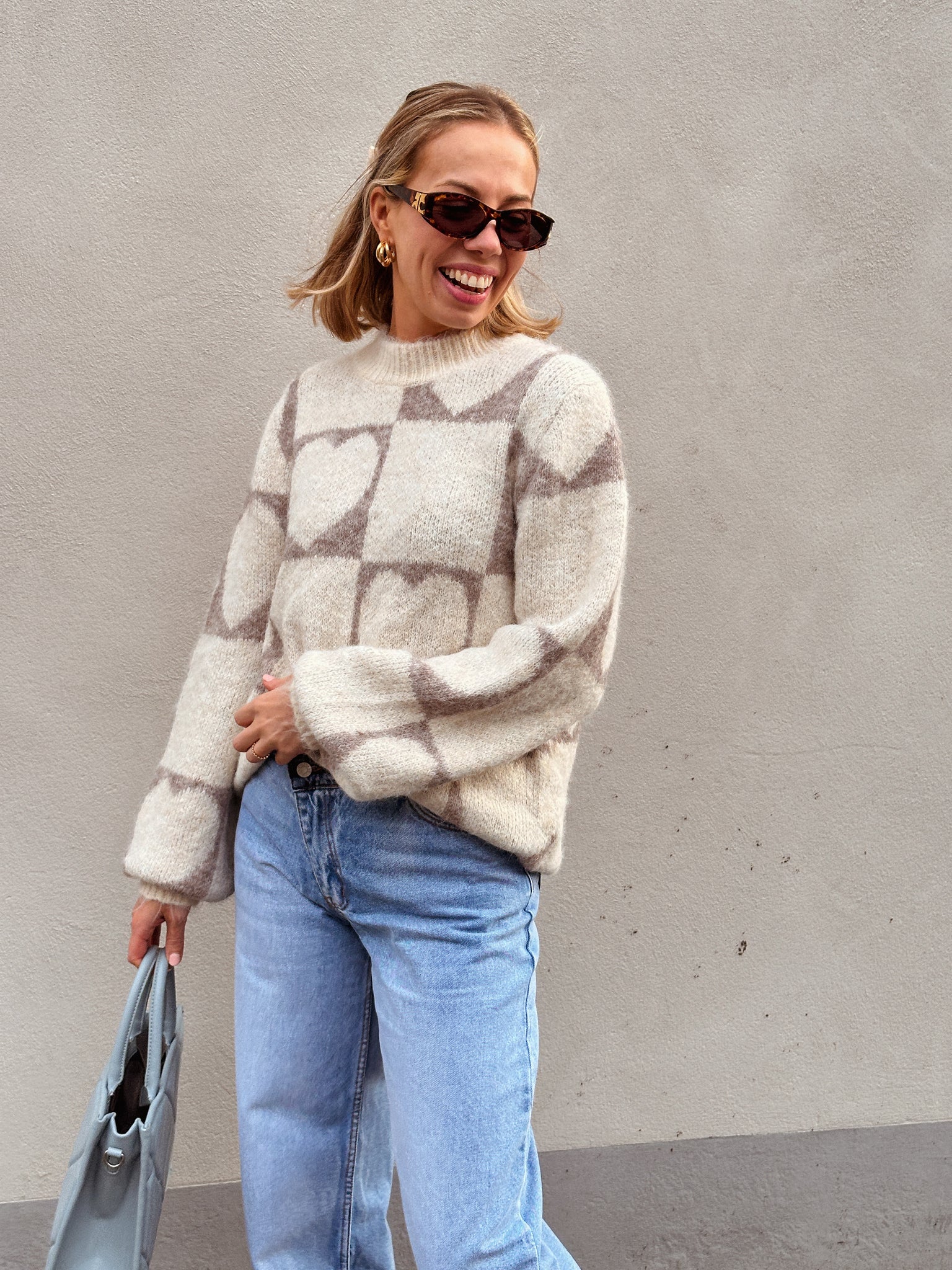 De Lise Trui is een ecru, oversized trui die comfort en stijl perfect combineert. De trui is dik, warm en superzacht – ideaal voor de koudere dagen. De hartjesprint zorgt voor een speelse, lieve touch.