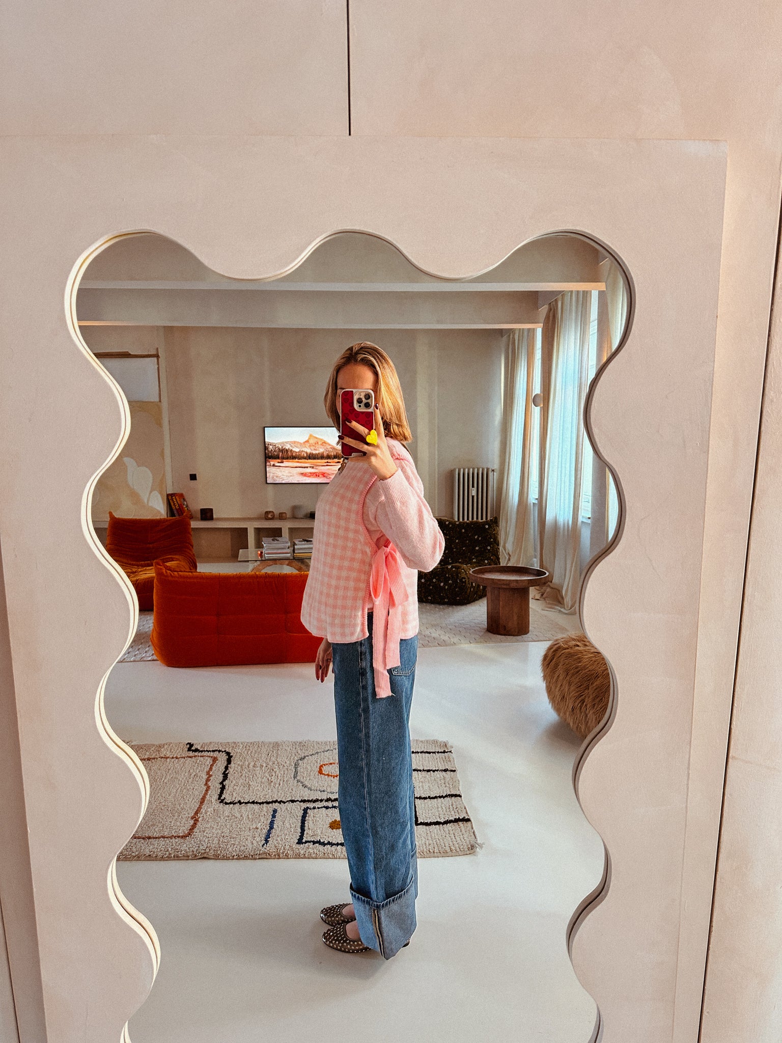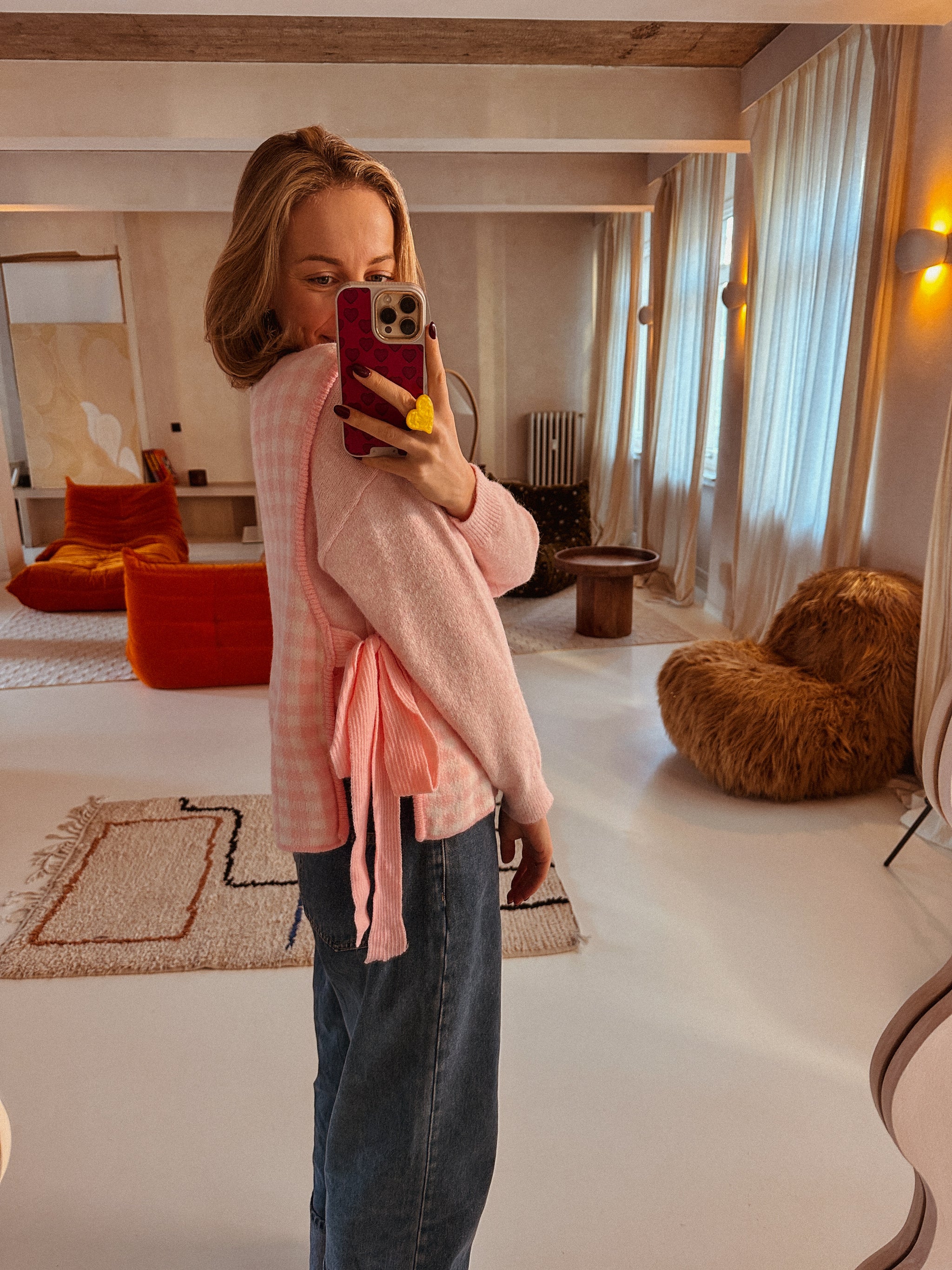 Het zachte roze ruitpatroon geeft je outfit meteen een vrolijke twist, terwijl de striksluiting aan de zijkant zorgt voor nét dat beetje extra flair. Draag ’m over een basic sweater of blouse en je bent in één keer effortlessly stylish.