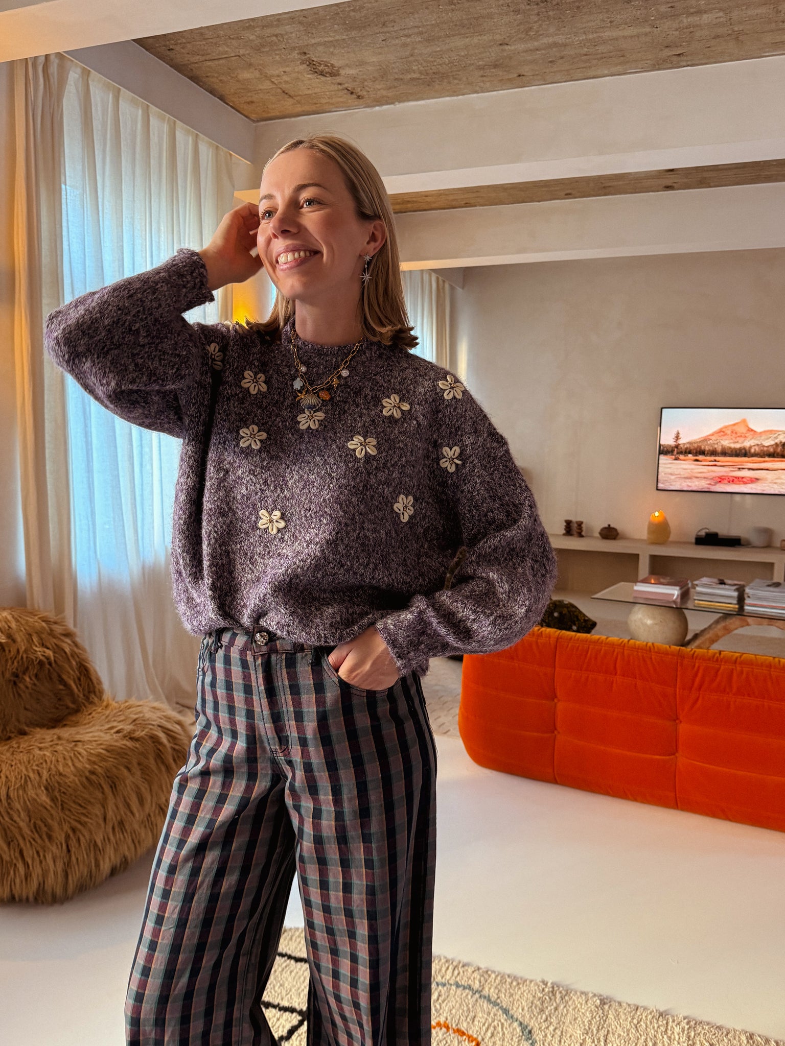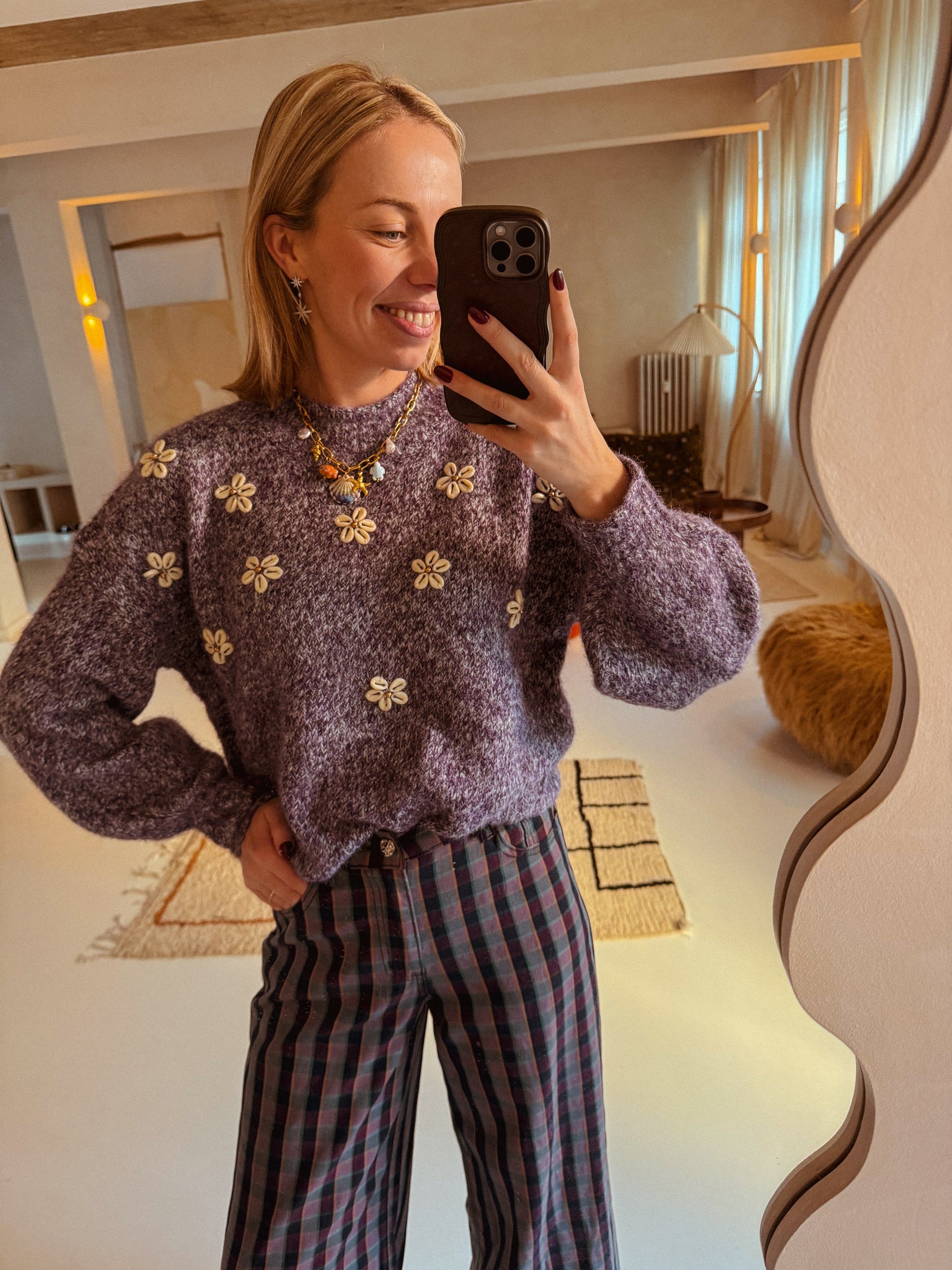 Deze paarse trui voelt als een warme omhelzing! De zachte stof maakt ’m perfect voor relaxte dagen, terwijl de delicate bloemetjes in beige schelpjes een speels en elegant detail toevoegen. Een comfy trui die je outfit meteen een vrolijke twist geeft.