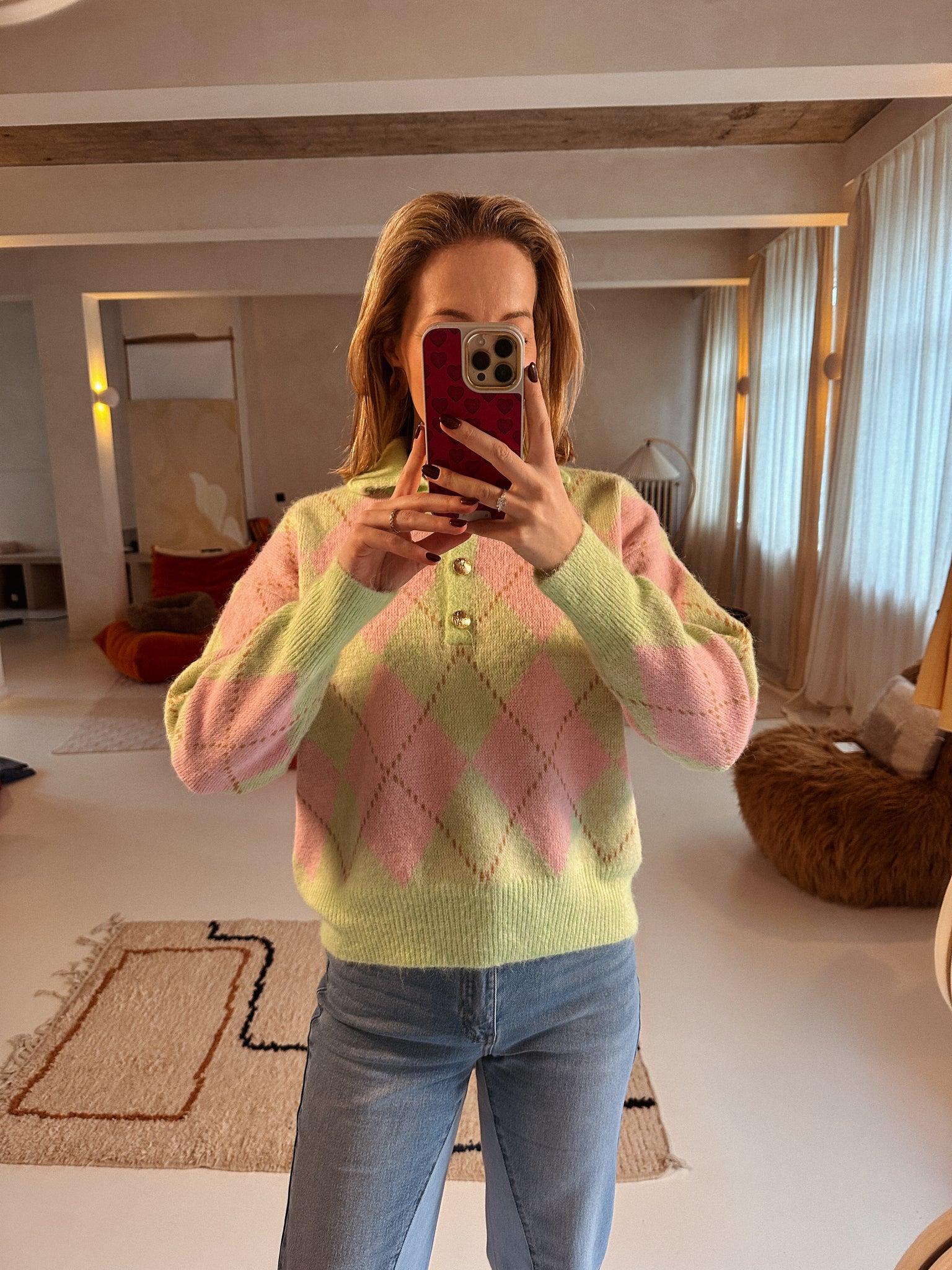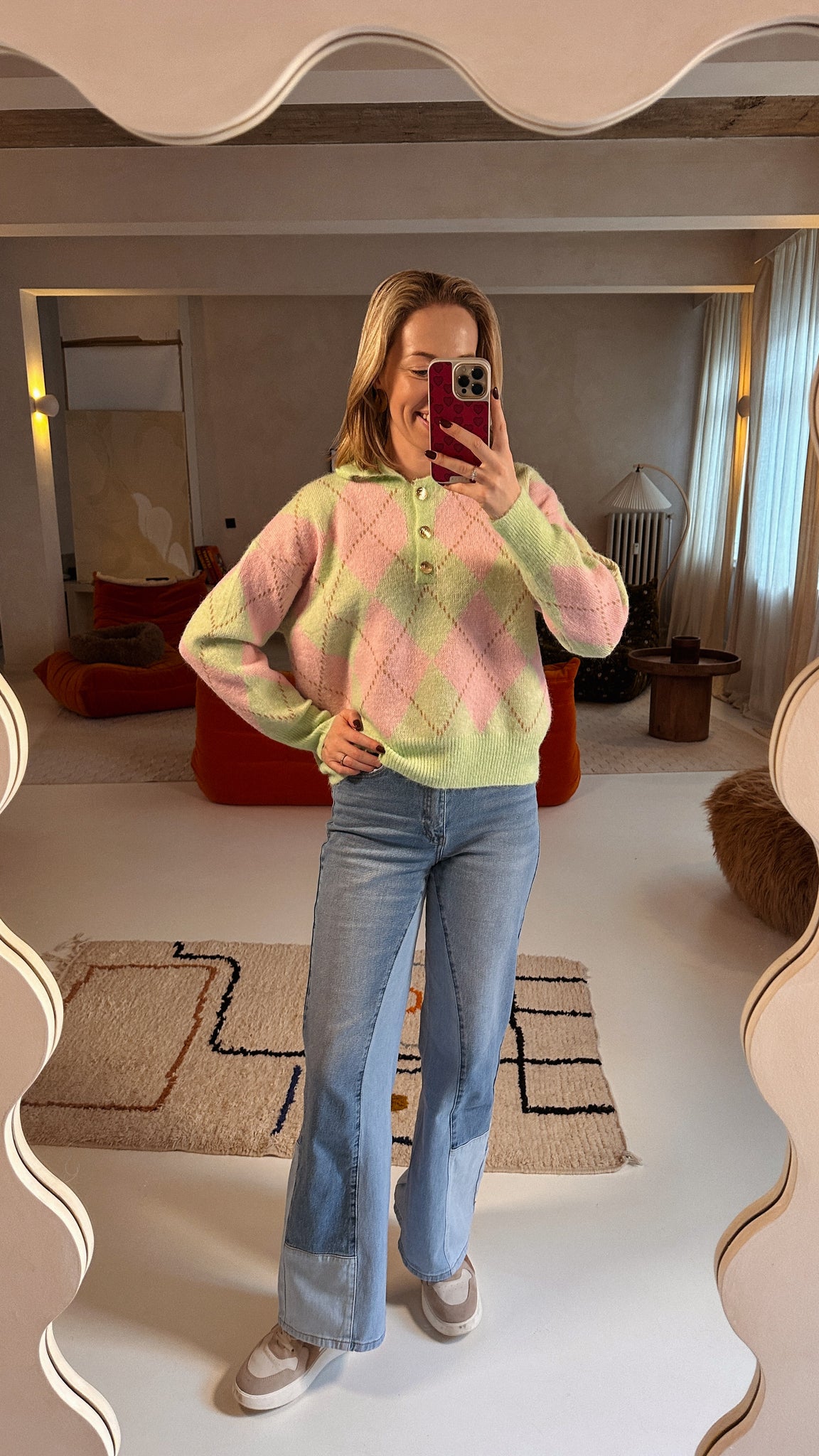 Deze polo trui krijgt een frisse uitstraling dankzij de lichtgroene tint en het speelse ruitpatroon in roze. De gouden knoopjes aan de hals voegen een subtiel stijlvol detail toe. Een veelzijdig item dat zowel relaxed gedragen kan worden als gecombineerd voor een meer geklede, preppy look.