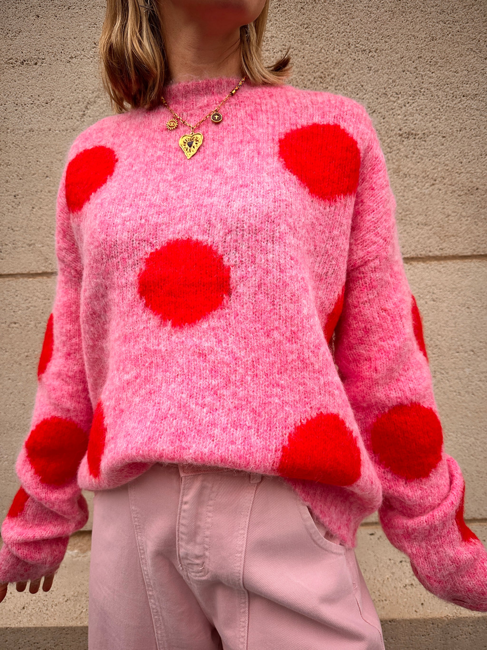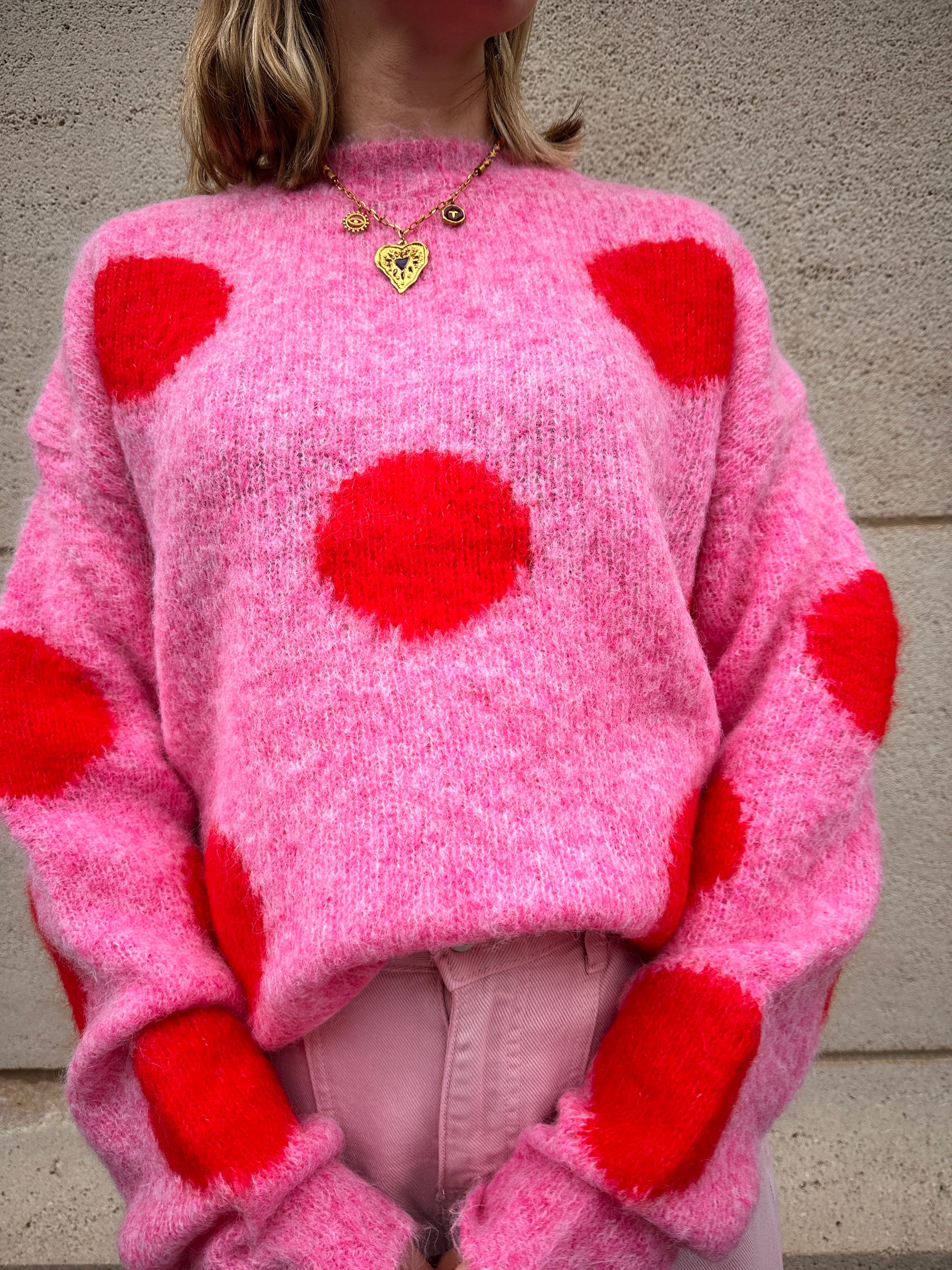 Onze roze trui met rode bollen voelt als een zachte knuffel en ziet er minstens zo vrolijk uit. Perfect voor zonnige ochtenden, koele zomeravonden en een flinke dosis good mood.