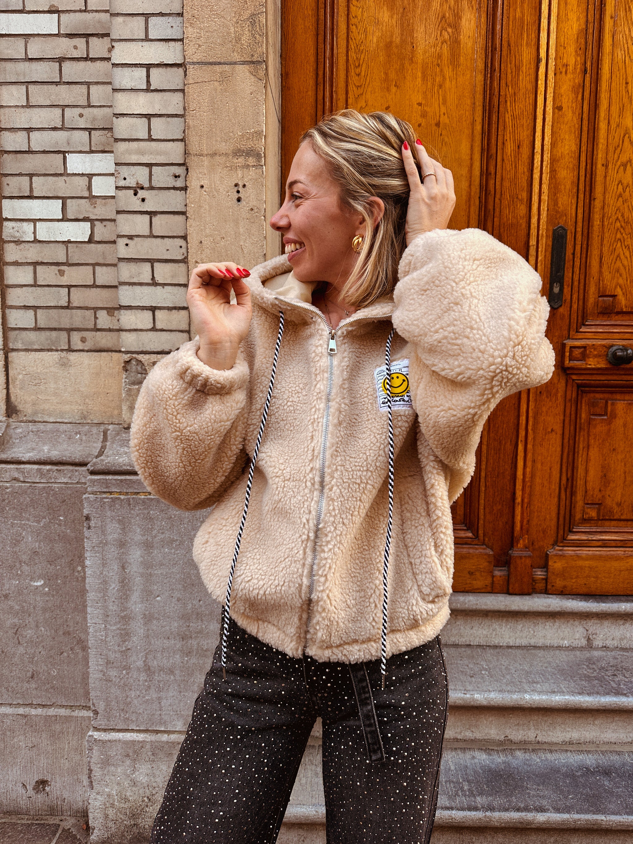 Deze zalige teddy jas ga je nooit meer willen uitdoen! Ik zocht al een tijdje naar een Maison Pomme teddy jasje en bij deze gevonden! De smiley zorgt voor de vrolijke, speelse vibe en de snit voor de nonchalante look. Lekker warm, zacht en cosy met de kap. Aan de mouwen en onderaan een beetje opgestroopt voor de stoere look.