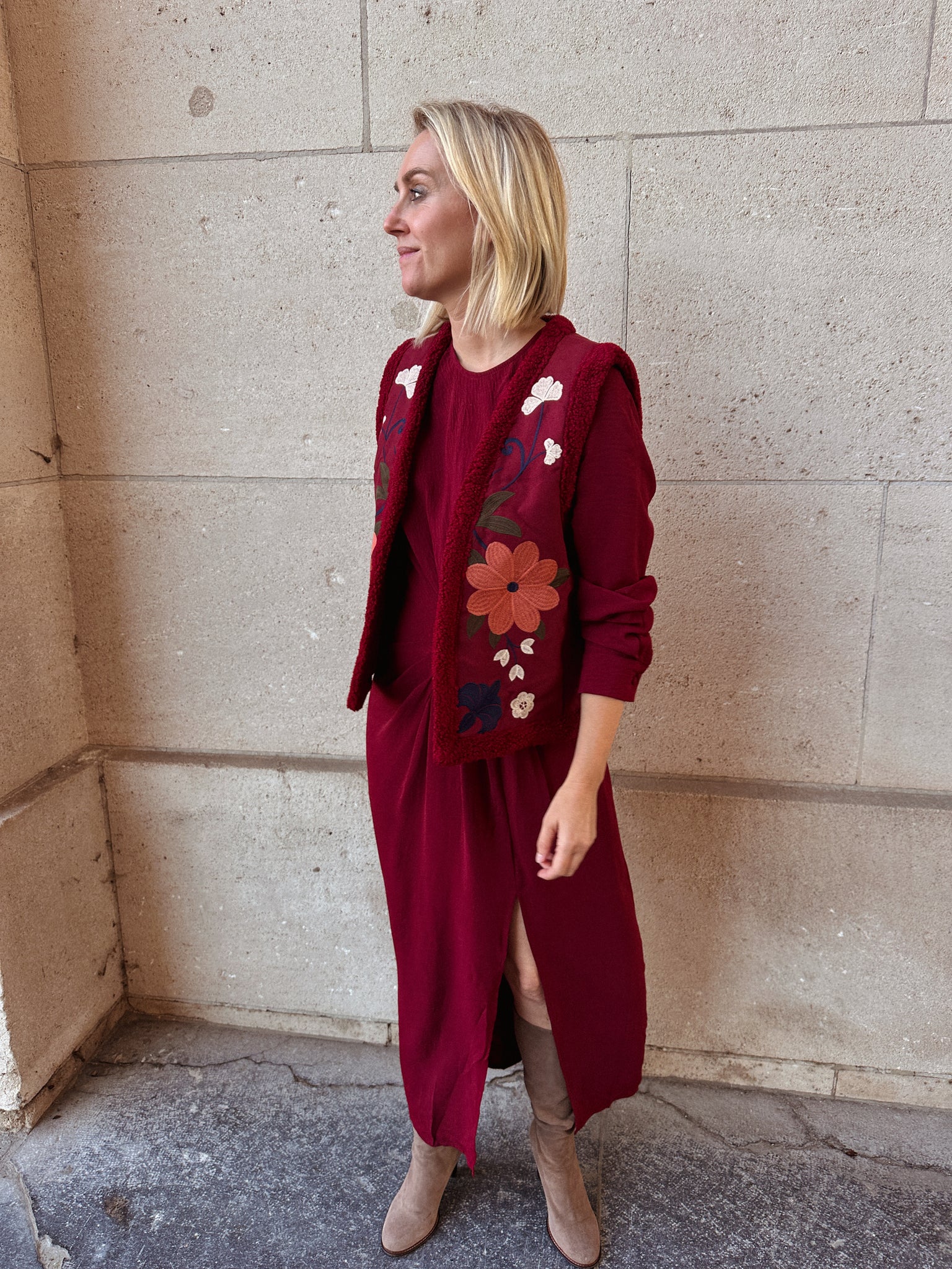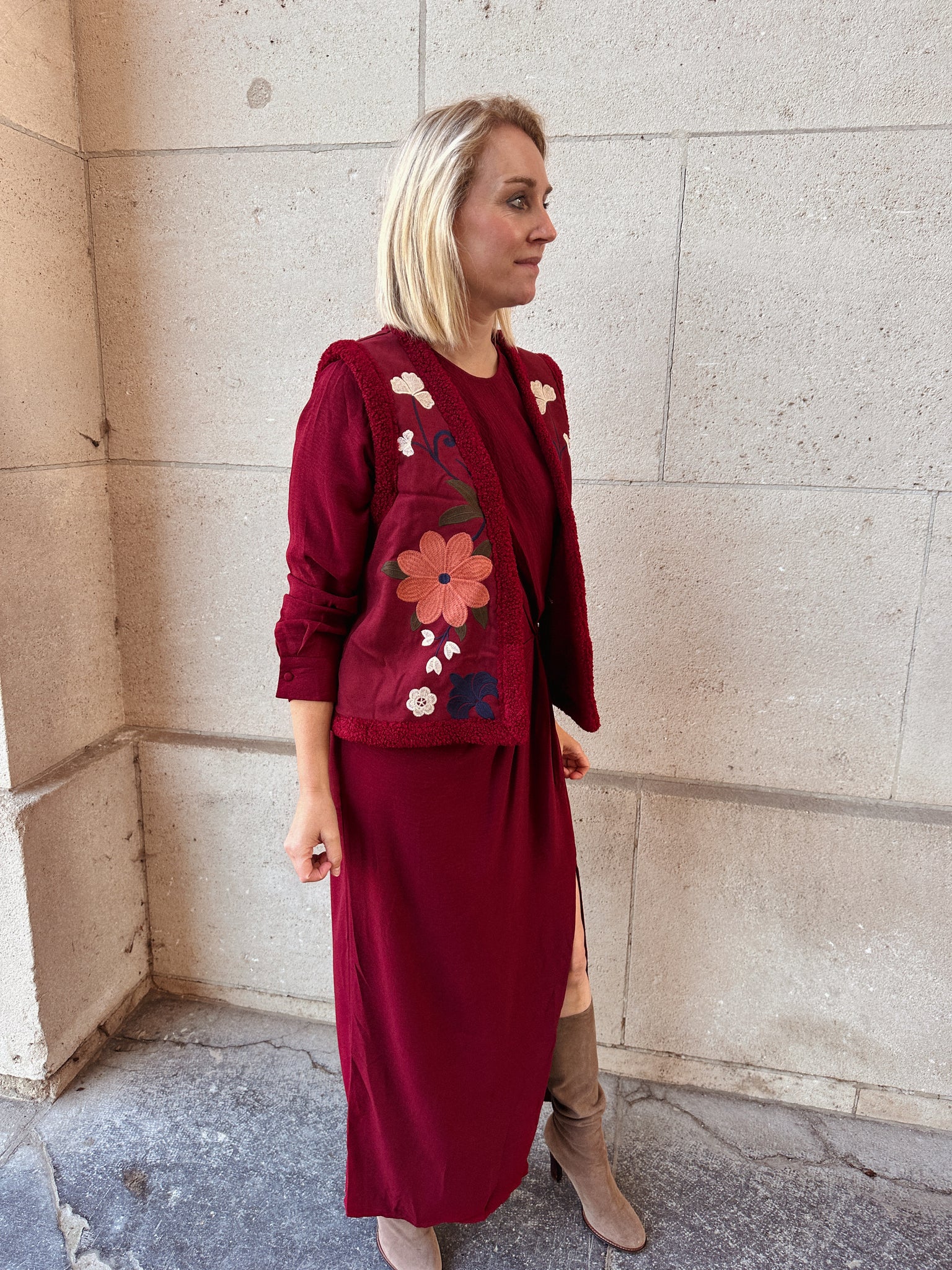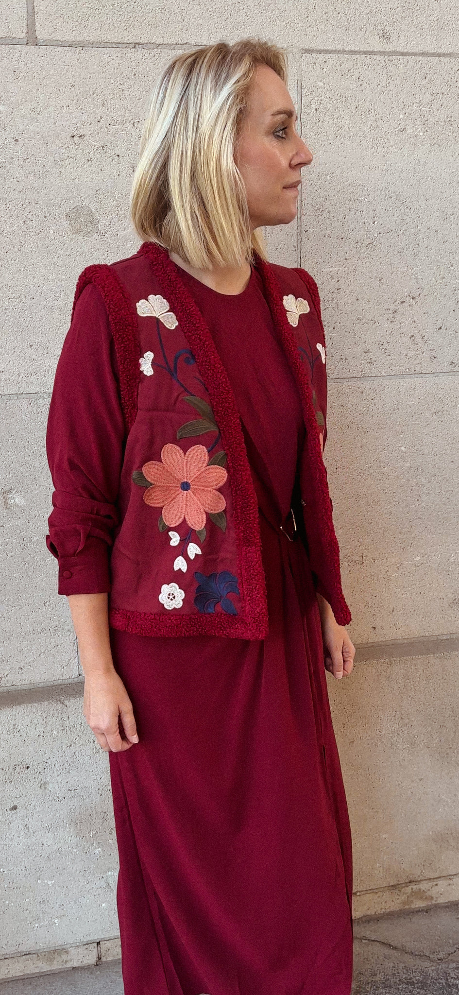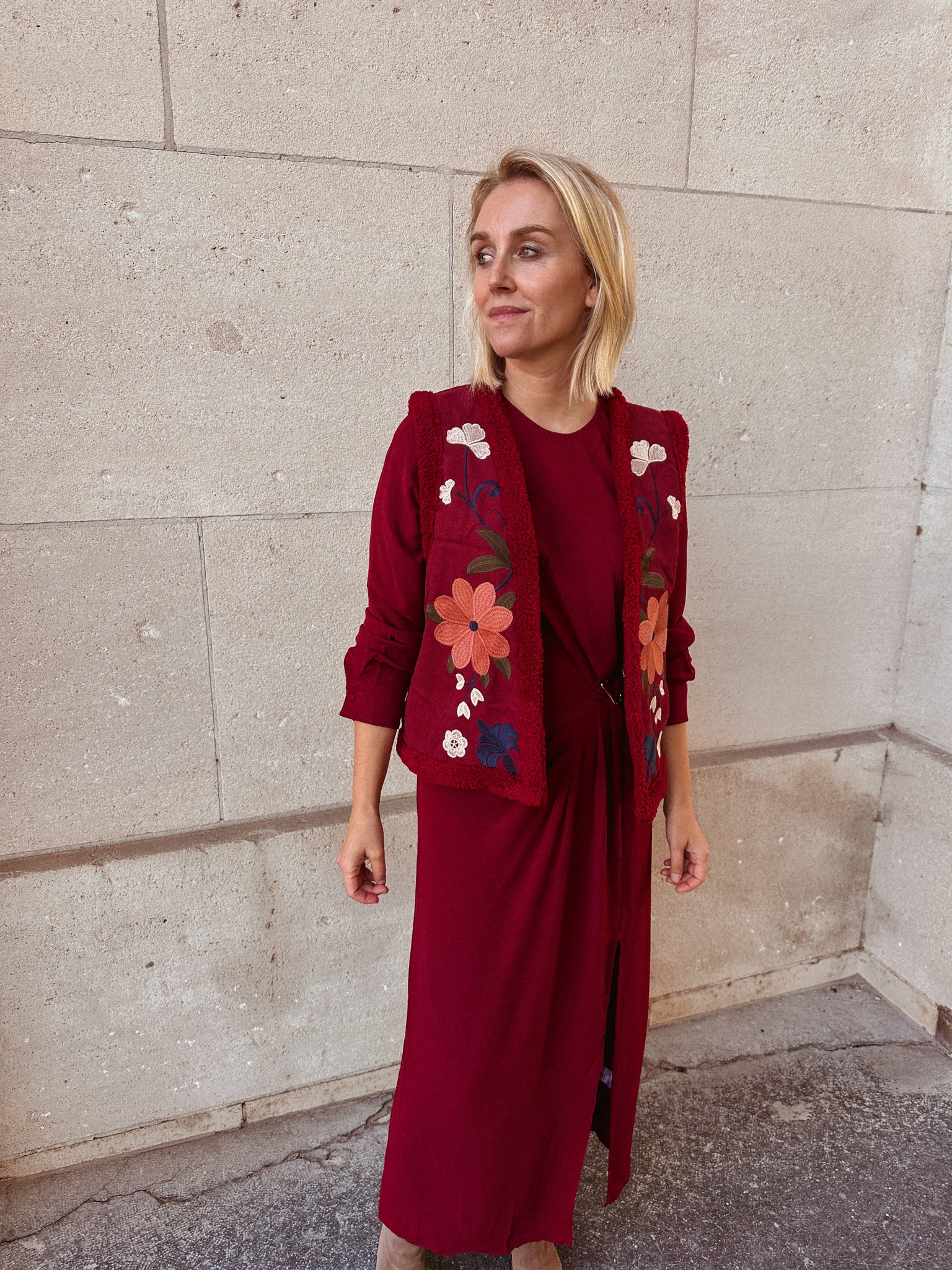 Leuk te dragen op een kleedje zoals hier gecombineerd met ons Nina bordeaux jurkje. Deze gilet maakt je outfit instant af, moeiteloos en chic.