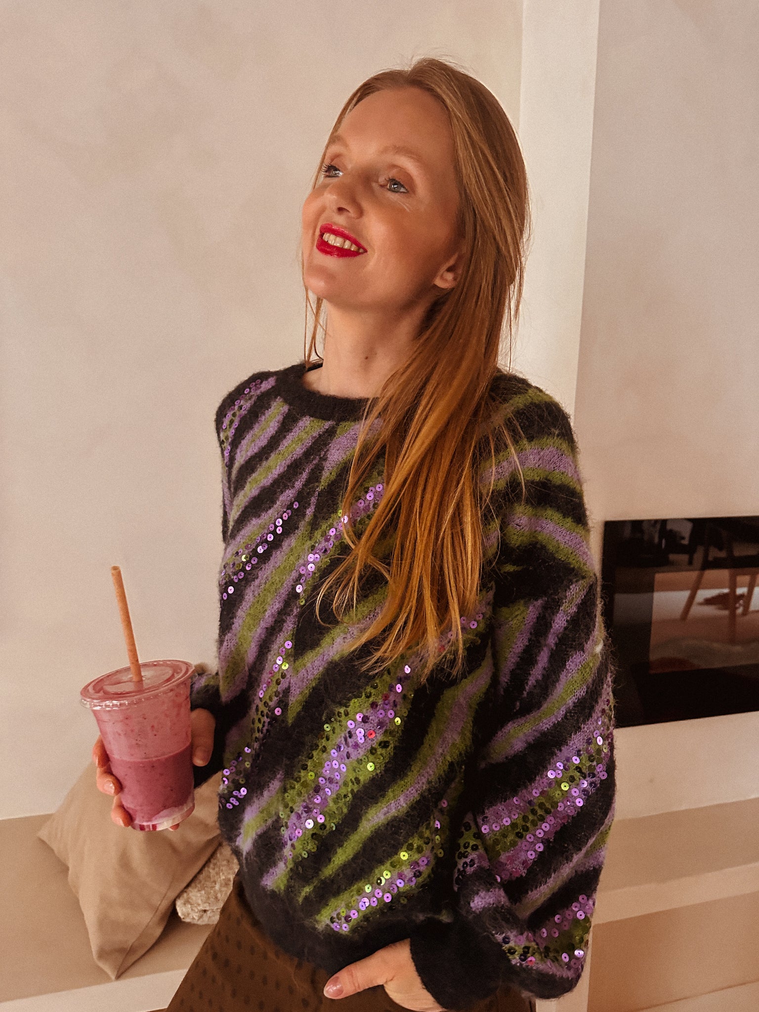Wie zegt dat je niet comfy én fabulous tegelijk kunt zijn? Deze zachte trui in zwart, paars en groen brengt kleur en karakter in je look, terwijl de paarse pailletjes bij elke beweging fonkelen. Perfect voor cozy dagen of een casual night out met een subtiele sparkle.