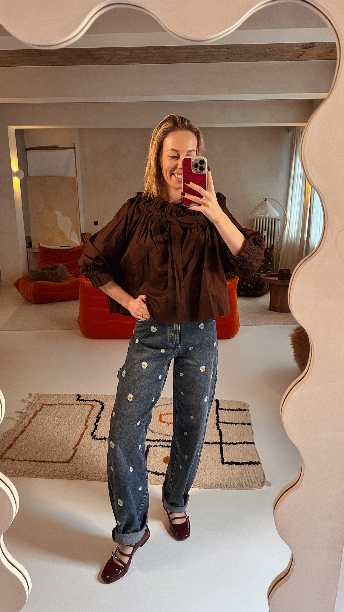 Deze bruine blouse met ruches is een echte eyecatcher. De sierlijke ruches aan de mouwen en hals geven een vrouwelijke uitstraling, terwijl de strik bij de hals zorgt voor een elegante finishing touch. Perfect te combineren met een jeans voor een casual look of met een rok voor een chique outfit.
