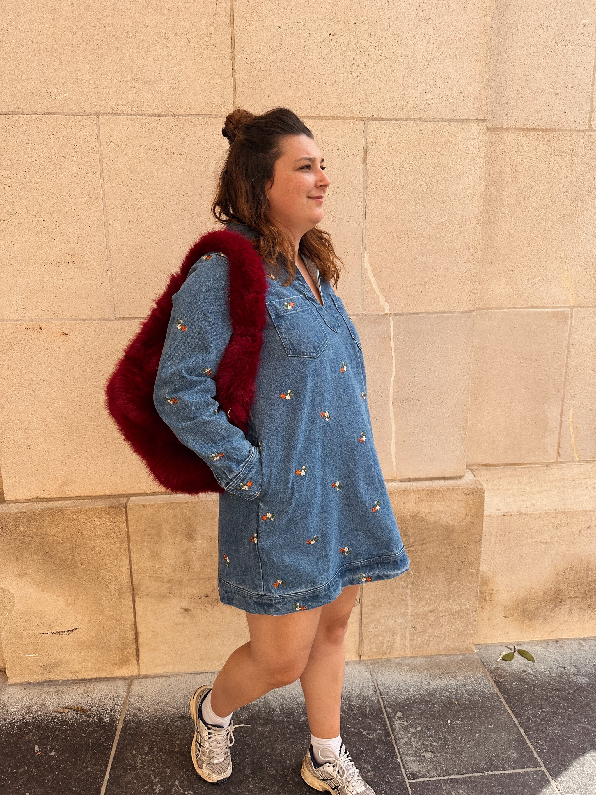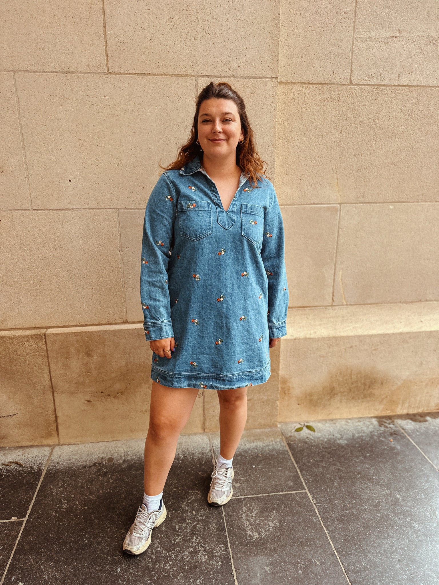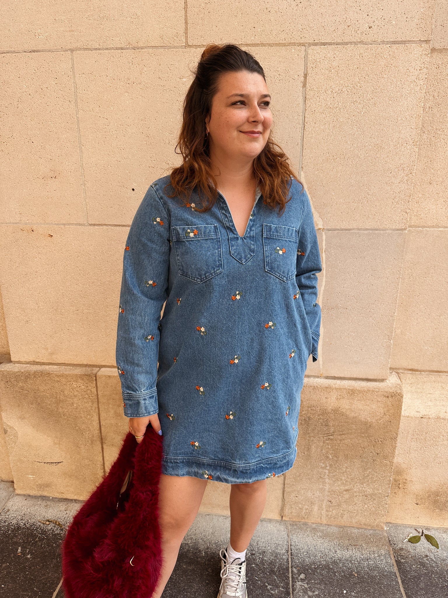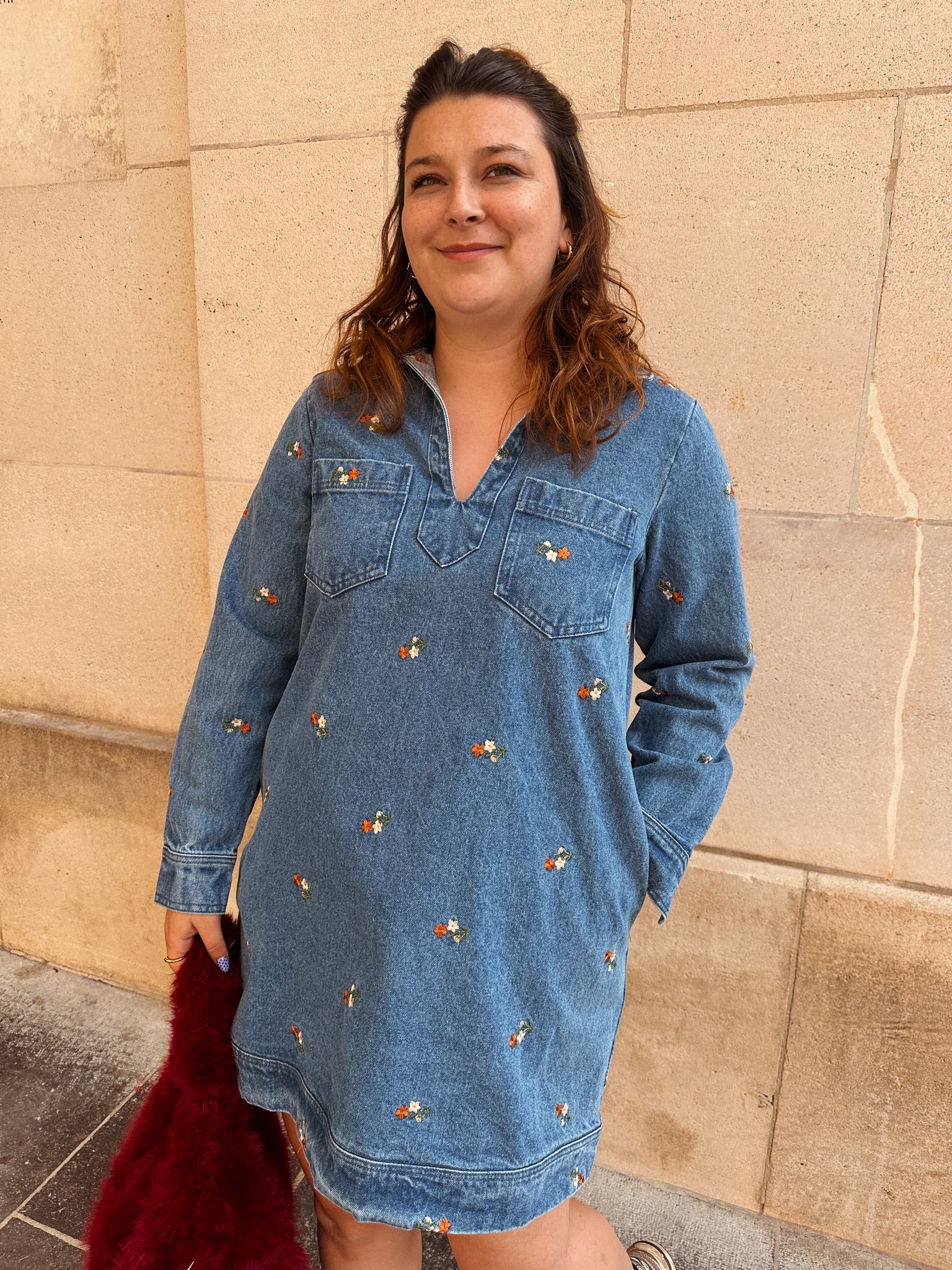 Dit donker jeanskleed in 100% katoen combineert stoer en vrouwelijk op z’n best. De geborduurde bloemen in warme herfstkleuren geven een romantische touch, terwijl de stevige denim stof zorgt voor een mooie structuur.