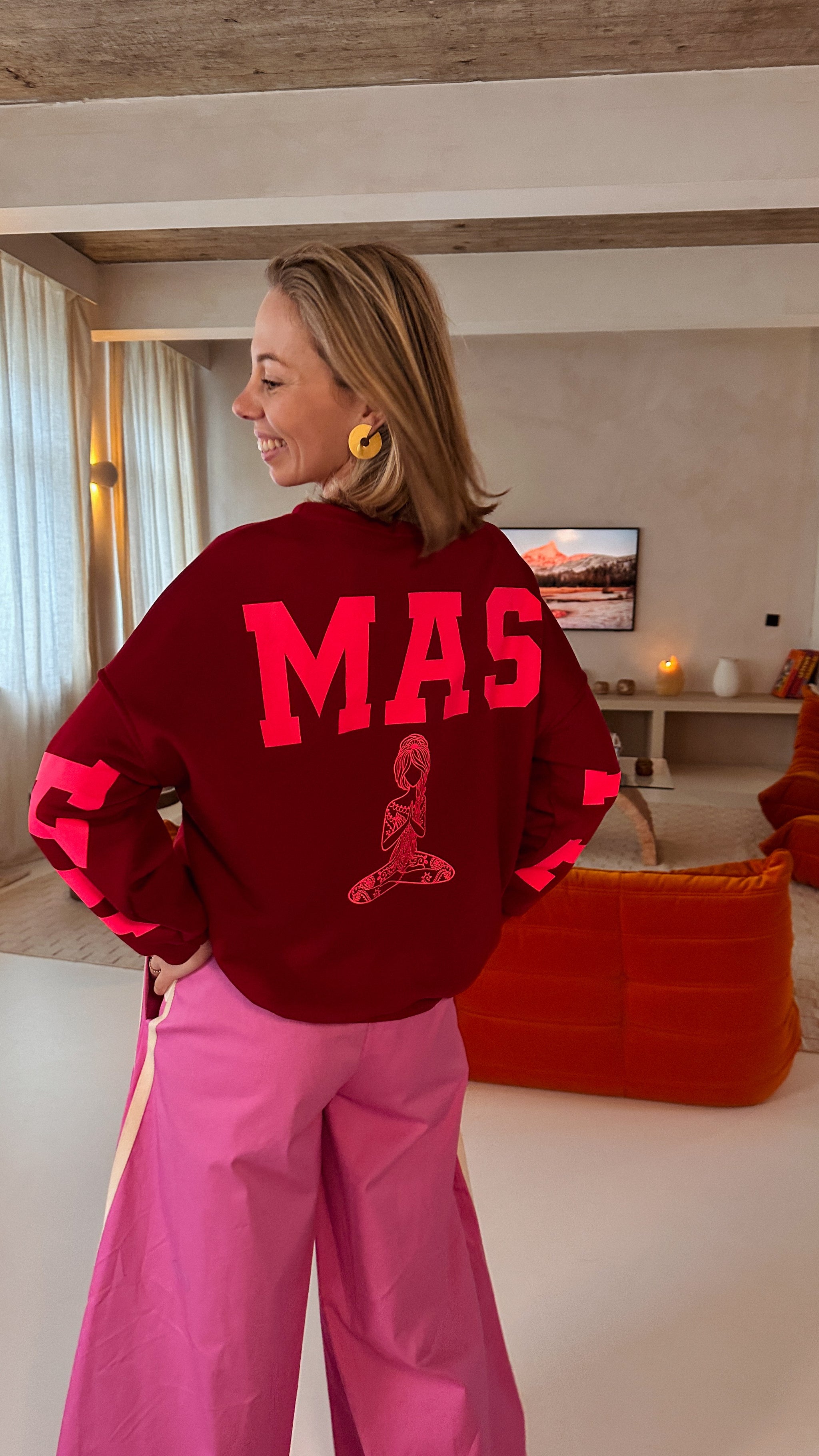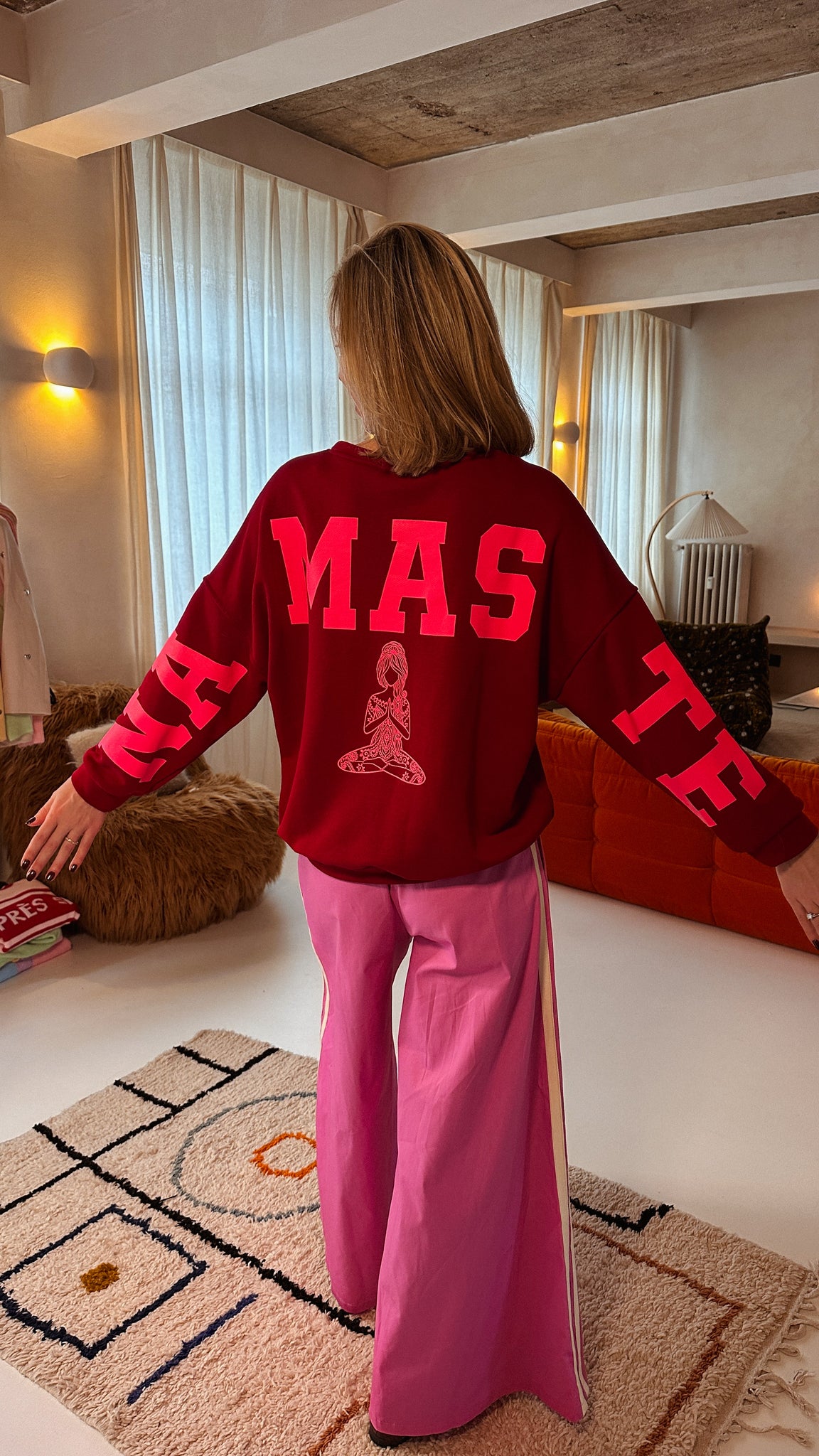 Deze bordeaux trui straalt rust en balans uit. Op de rug en mouwen staat de tekst “namaste”, terwijl de illustratie van een mediterende vrouw op de rug zorgt voor een serene en krachtige uitstraling. De warme bordeauxkleur maken deze trui perfect voor wie stijl en innerlijke rust wil combineren.