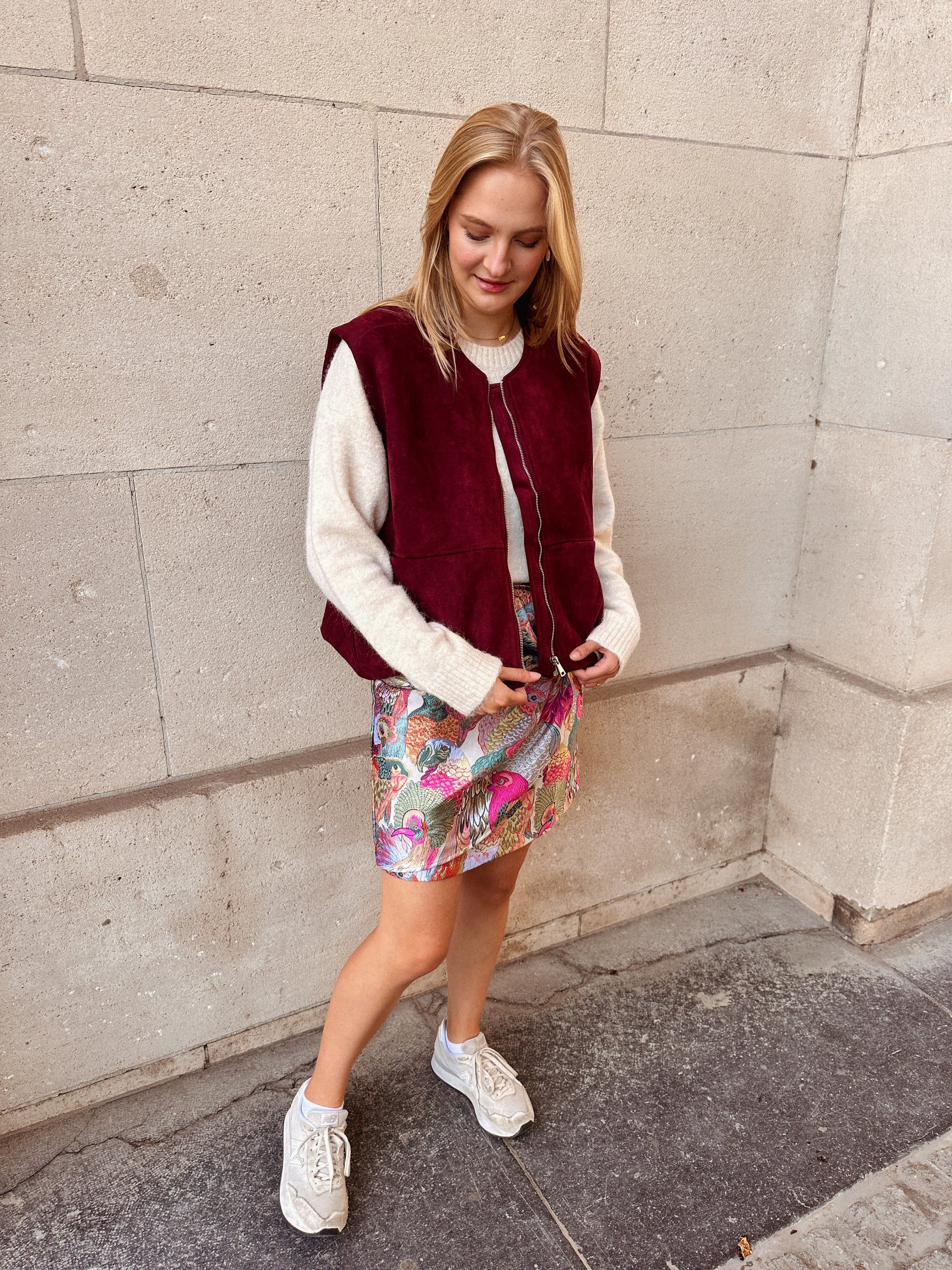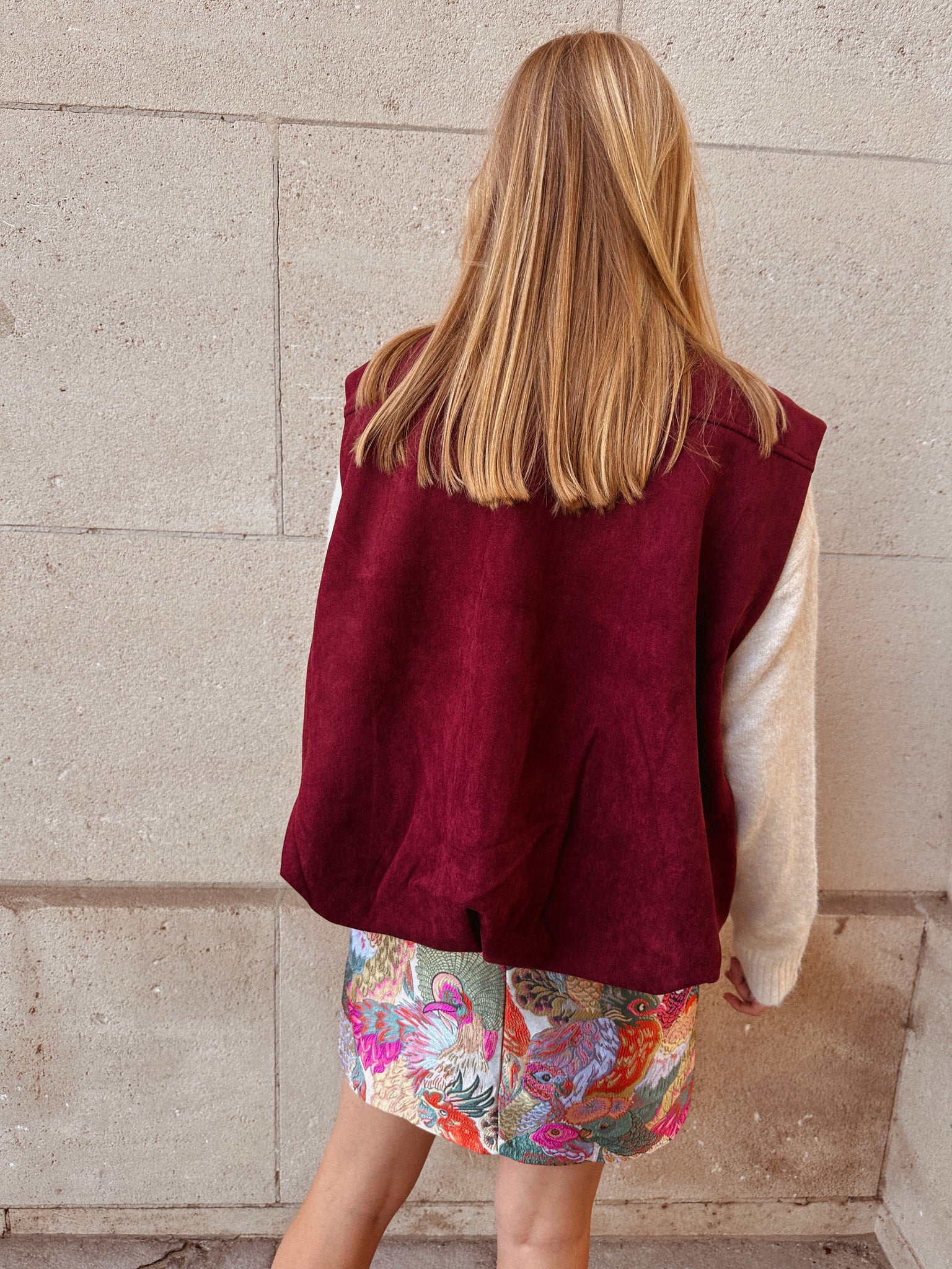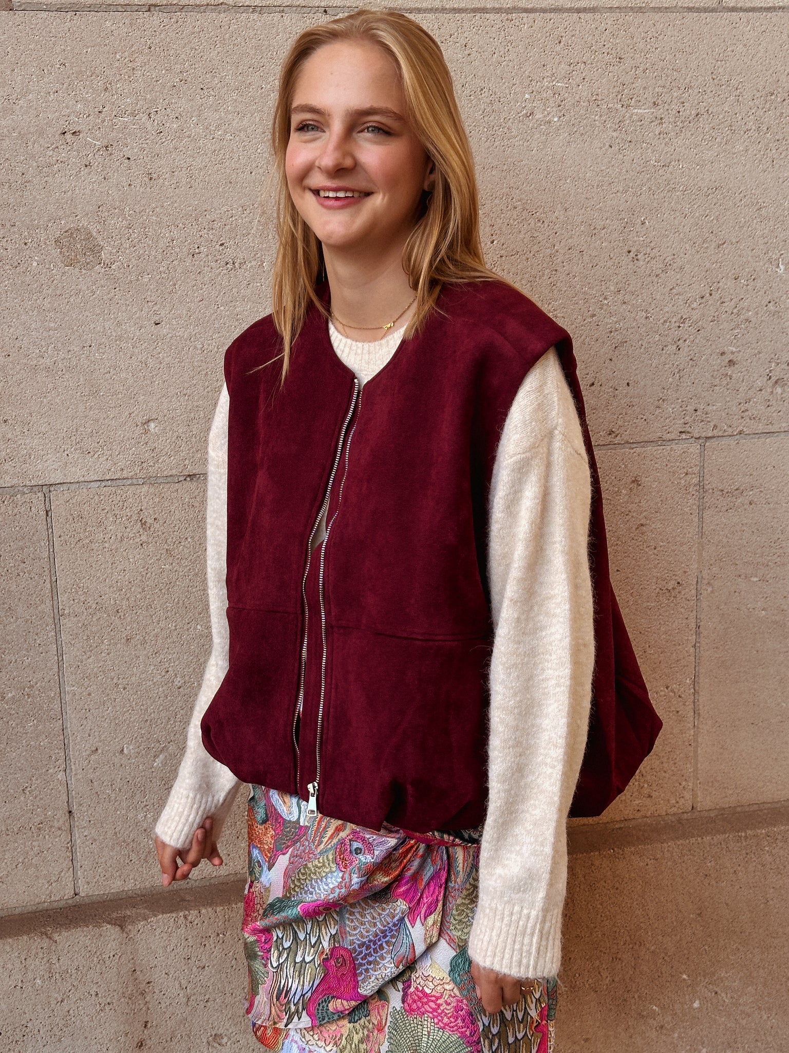 De Noé jas is luxe en stijl in één: dit mouwloze bomber jasje van soepel suède in diepe bordeaux is dé eyecatcher voor elke outfit. Perfect als laagje over een trui of shirt en past perfect in de herfst. Comfortabel, tijdloos en moeiteloos stijlvol.