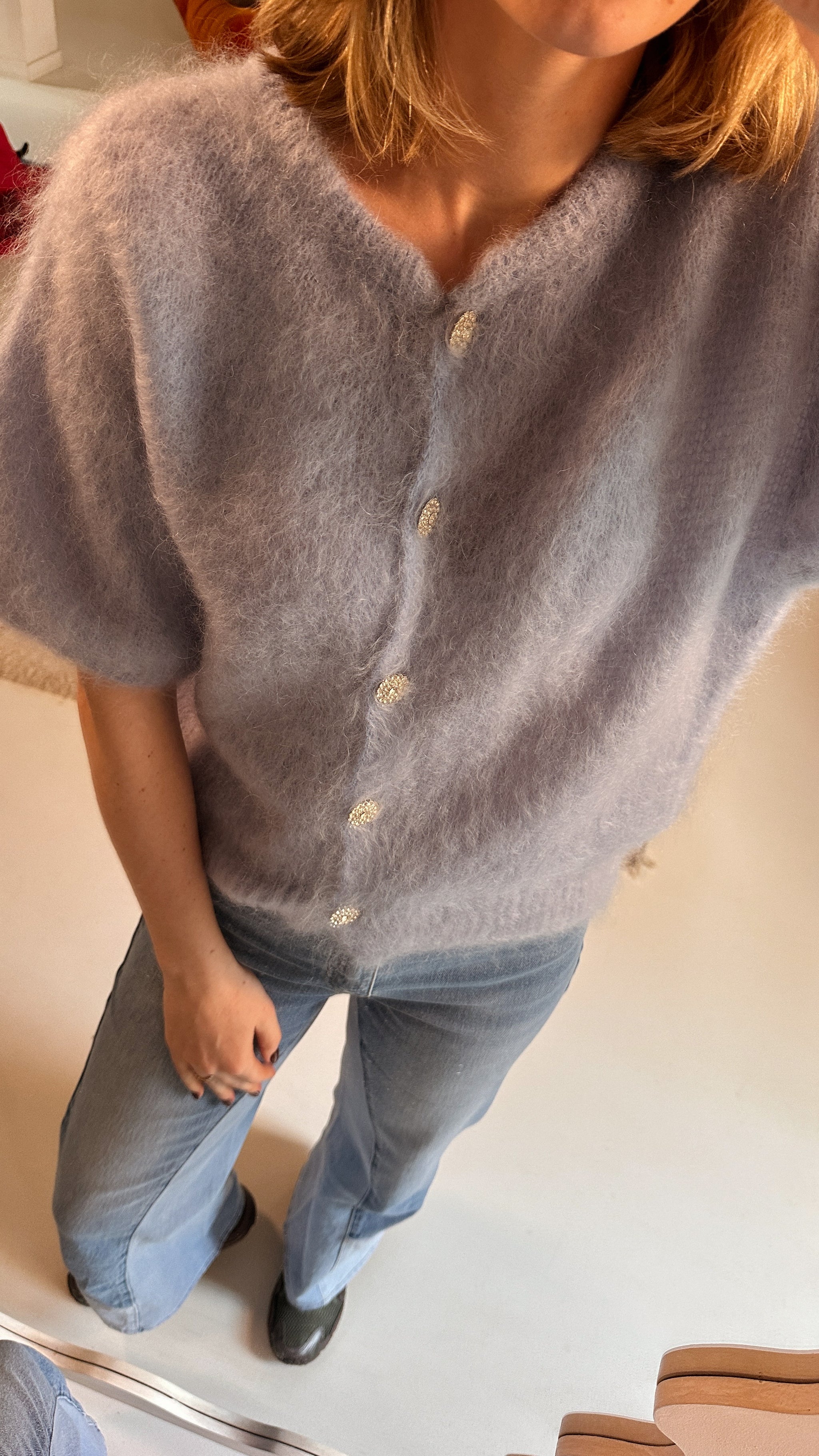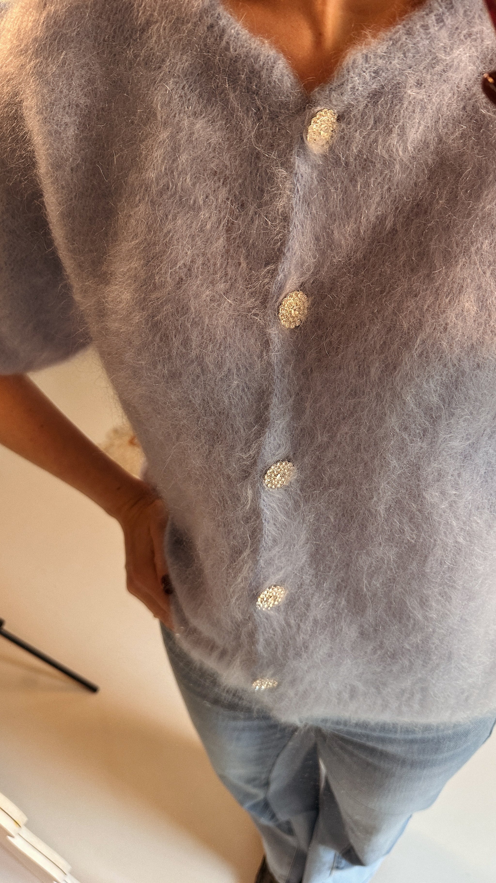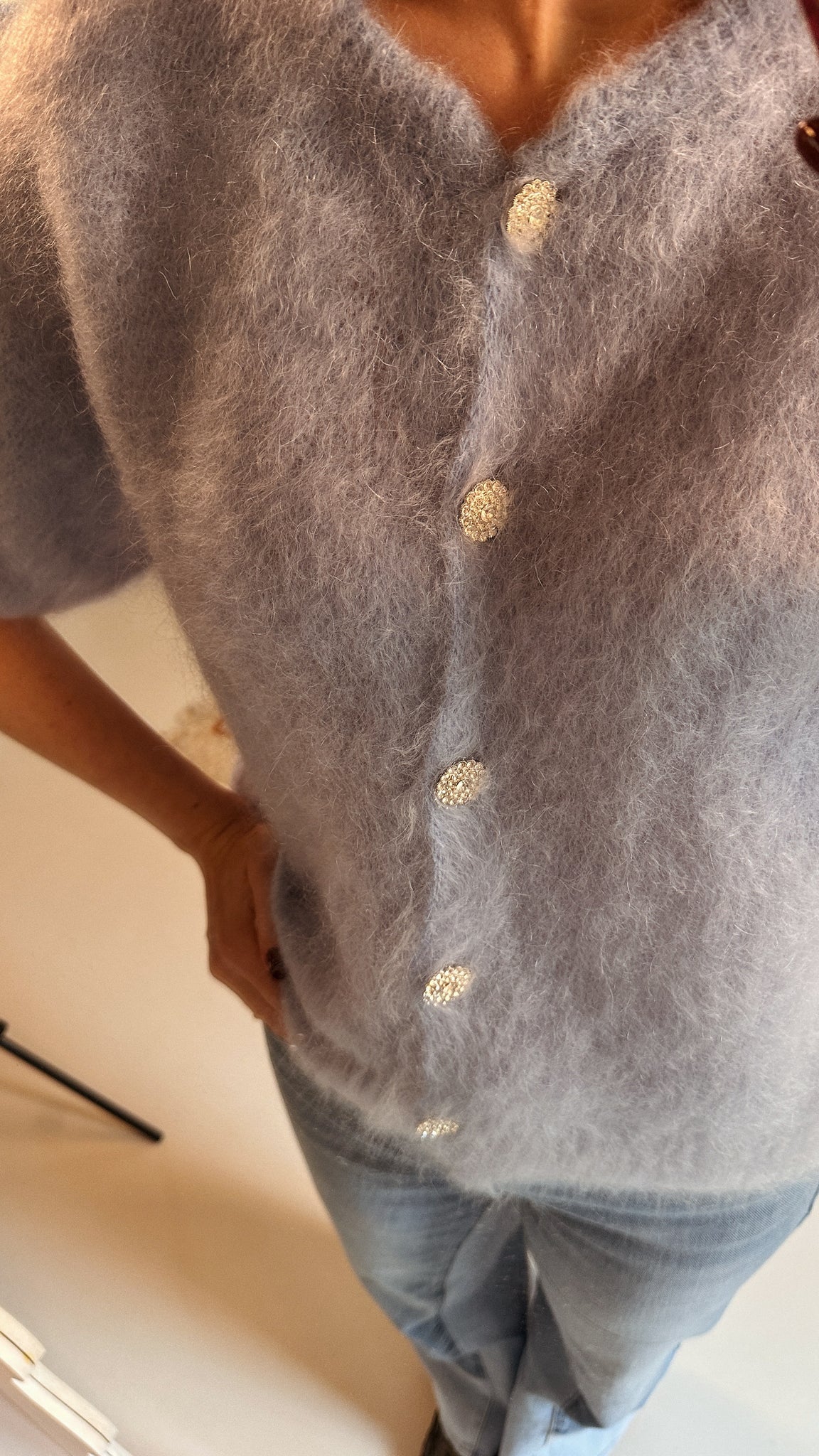 Deze zachte wollen trui met 80% kid-mohair  in lichtblauw combineert comfort met verfijnde details. De korte mouwen maken het een perfect tussenseizoensitem, terwijl de mooie knopen met sprankelende strass-steentjes een subtiele, luxe touch geven. Een tijdloos en chic kledingstuk dat moeiteloos casual en elegant kan worden gestyled.