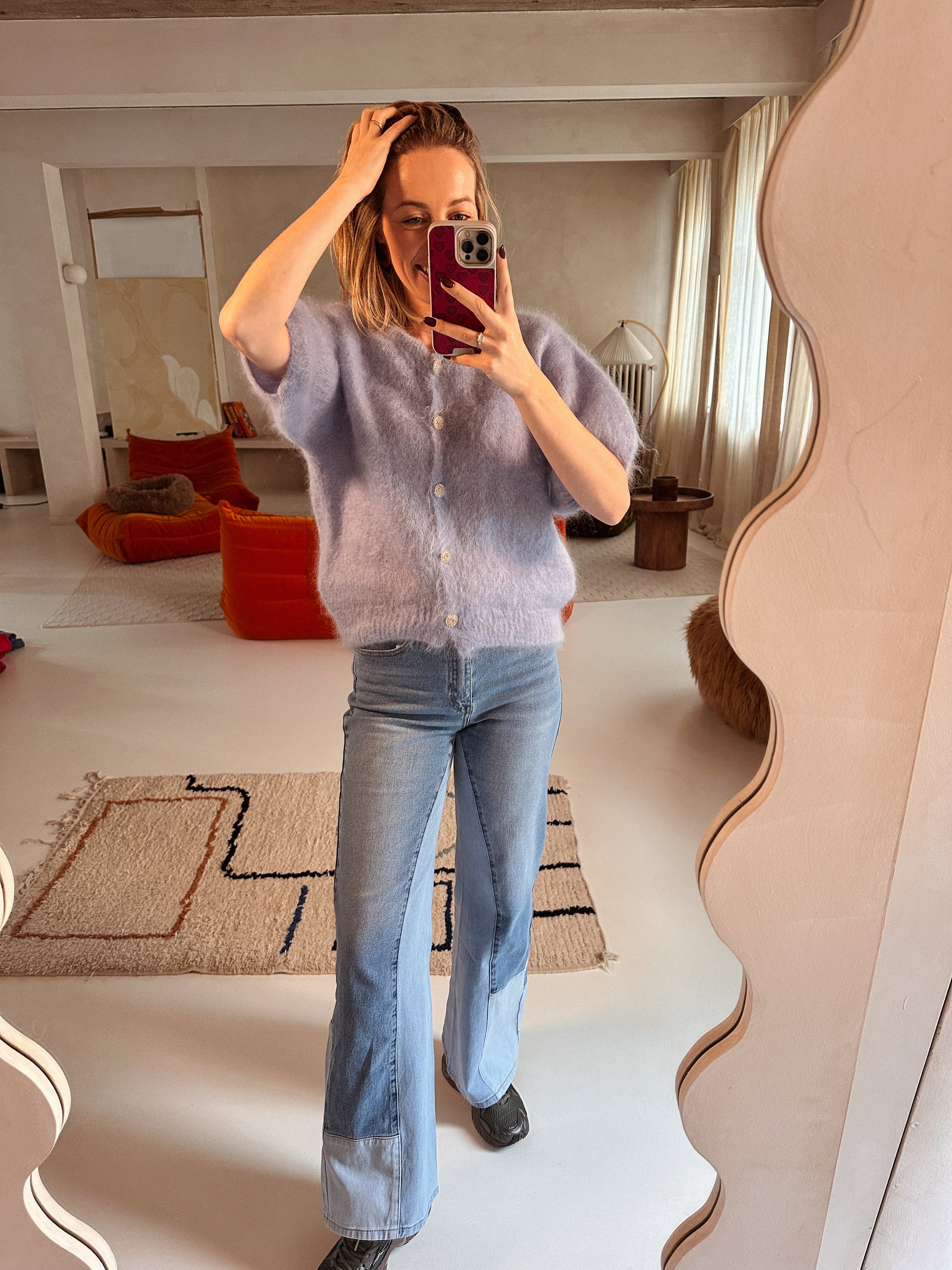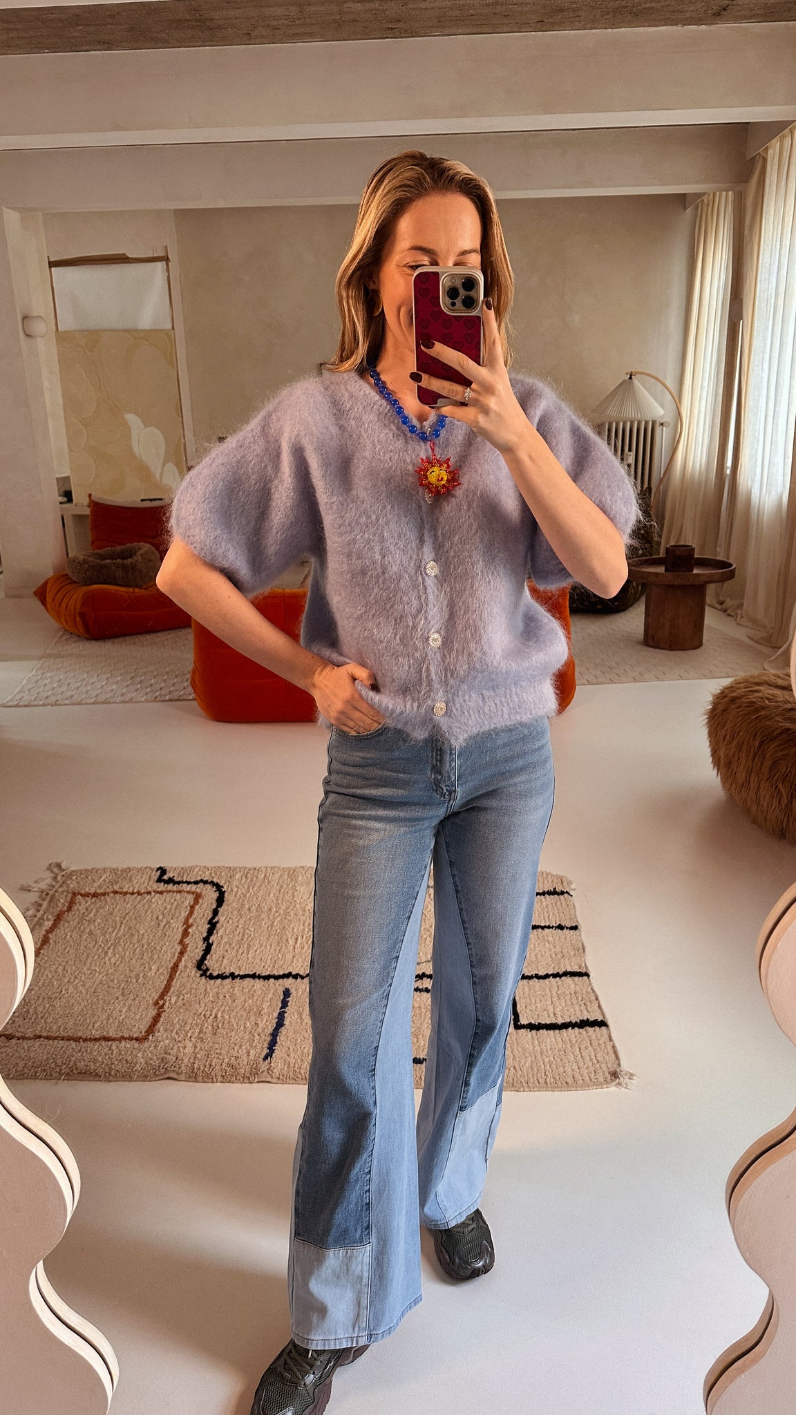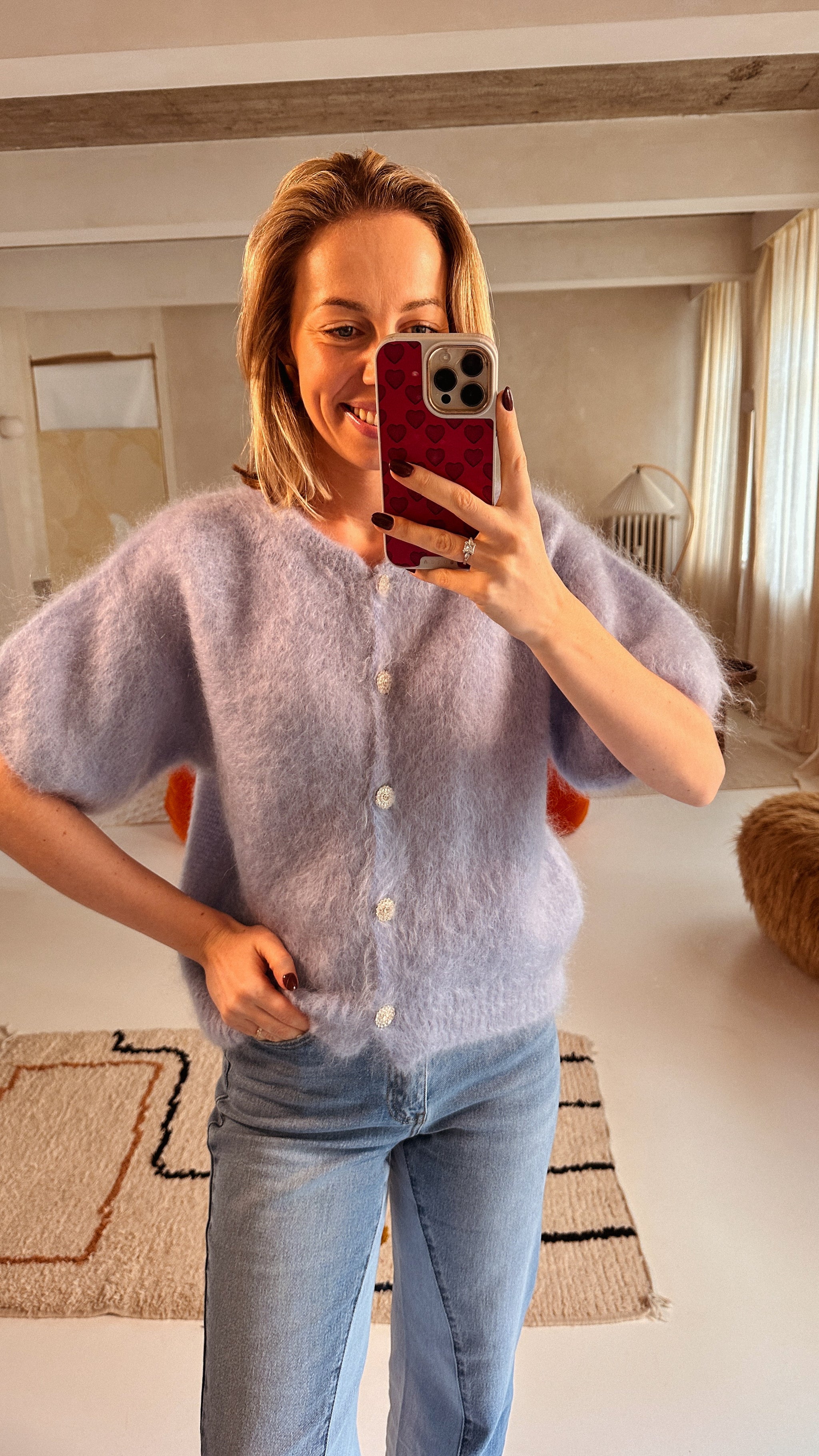 Deze zachte wollen trui met 80% kid-mohair  in lichtblauw combineert comfort met verfijnde details. De korte mouwen maken het een perfect tussenseizoensitem, terwijl de mooie knopen met sprankelende strass-steentjes een subtiele, luxe touch geven. Een tijdloos en chic kledingstuk dat moeiteloos casual en elegant kan worden gestyled.
