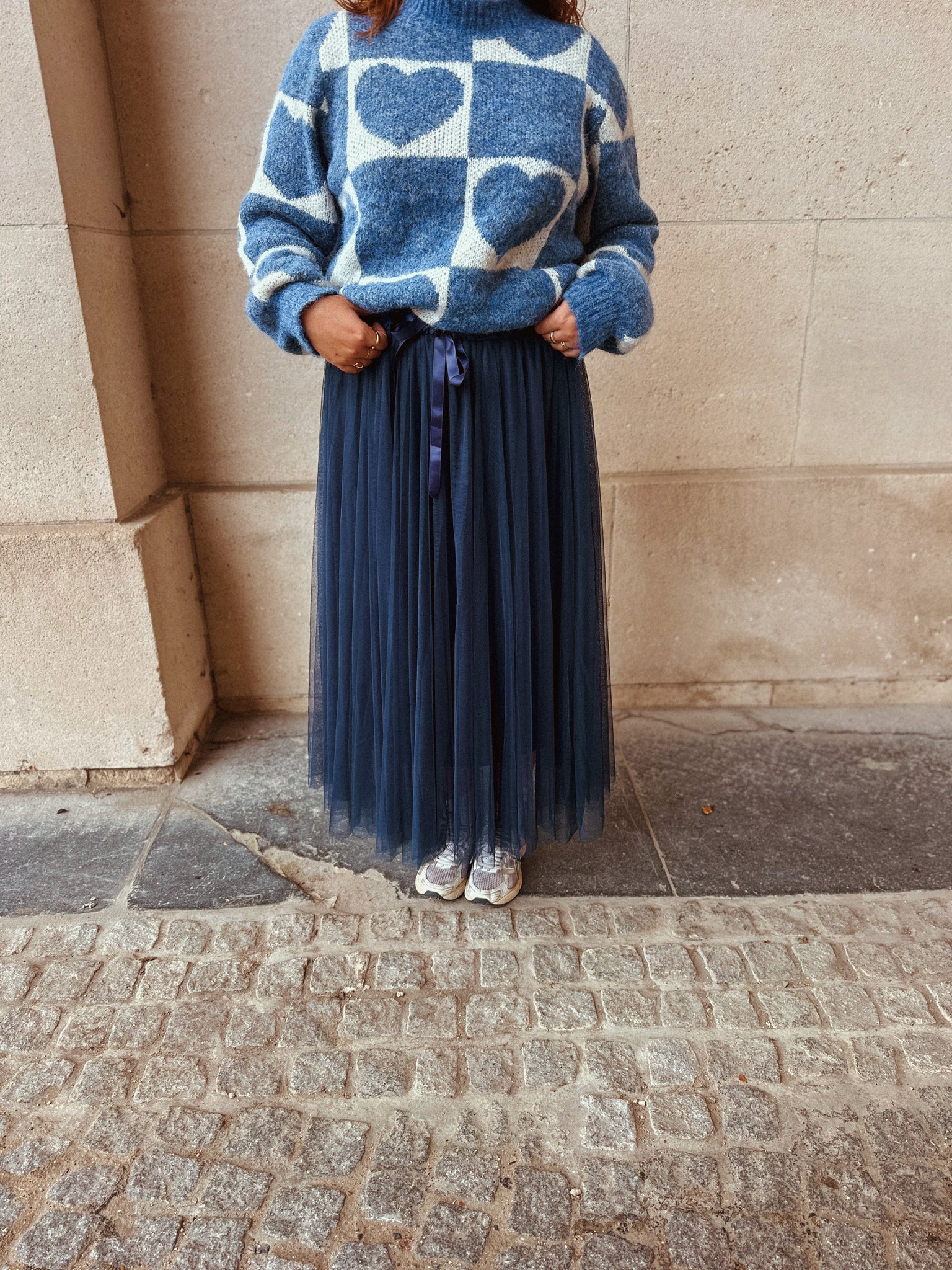Deze prachtige tule rok in een diepe blauwe kleur brengt beweging en elegantie in elke stap. De elastische tailleband zorgt voor extra comfort, met vooraan een lintje dat je sierlijk kan dichtknopen. Draag hem chic met een top of blouse, of ga voor een casual look met een cozy knit. Eindeloos combineerbaar!