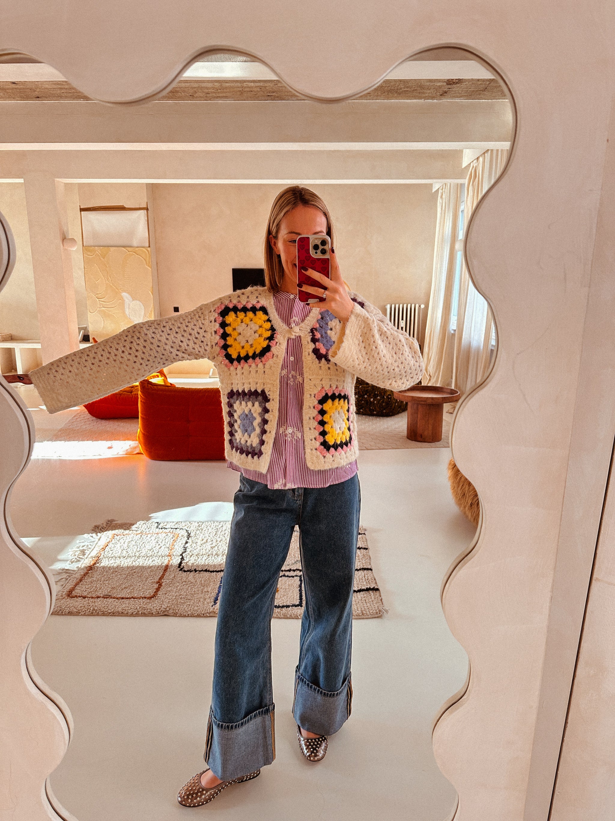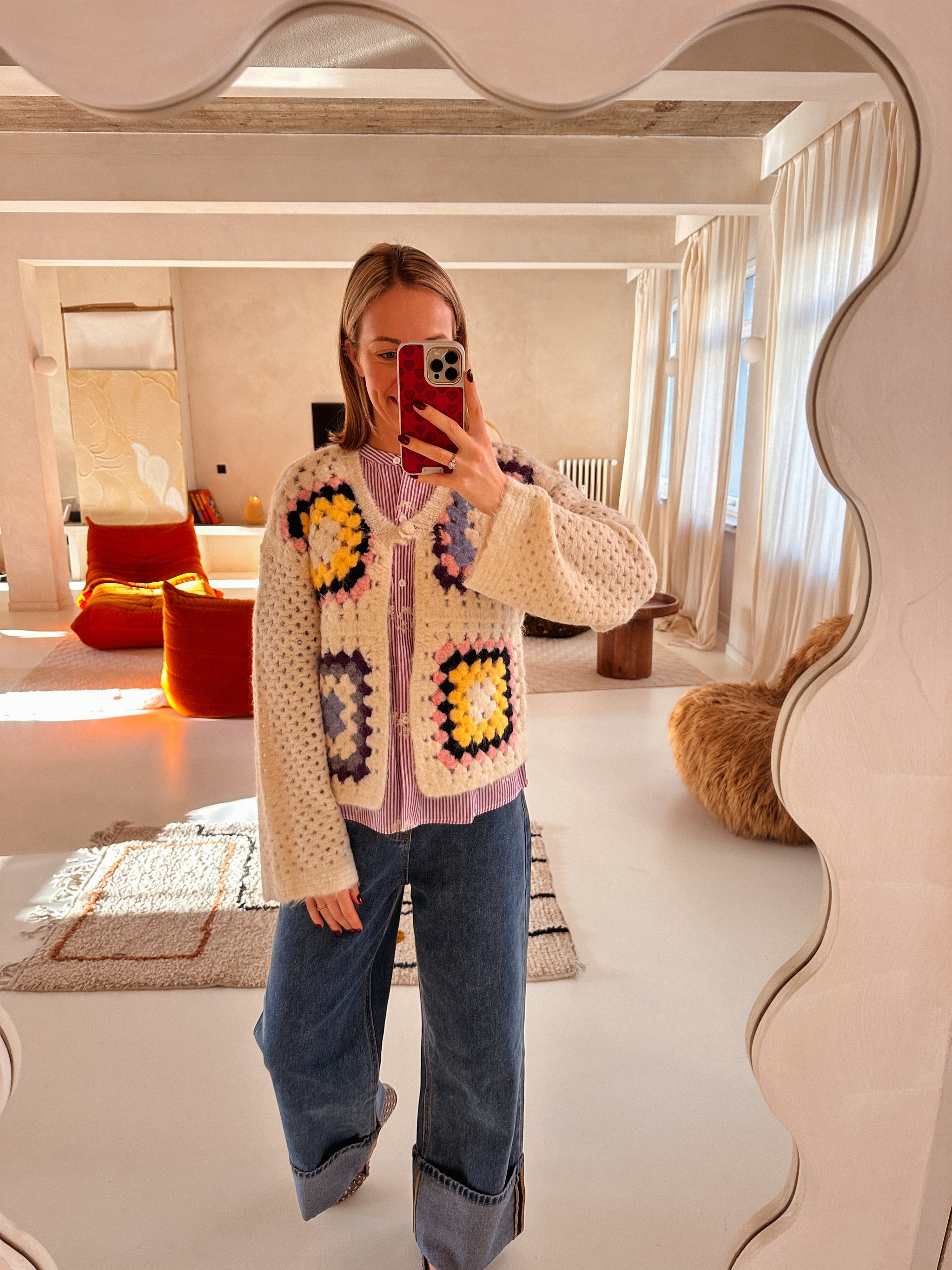 Dit gehaakte gilet is zacht, licht en helemaal klaar om je outfit een speelse touch te geven. Het ene knoopje houdt ‘m charmant subtiel dicht, terwijl de mix van pastelkleuren zorgt voor een vrolijke, dromerige look. Perfect om over een basic top of jurkje te dragen en je look meteen op te fleuren!
