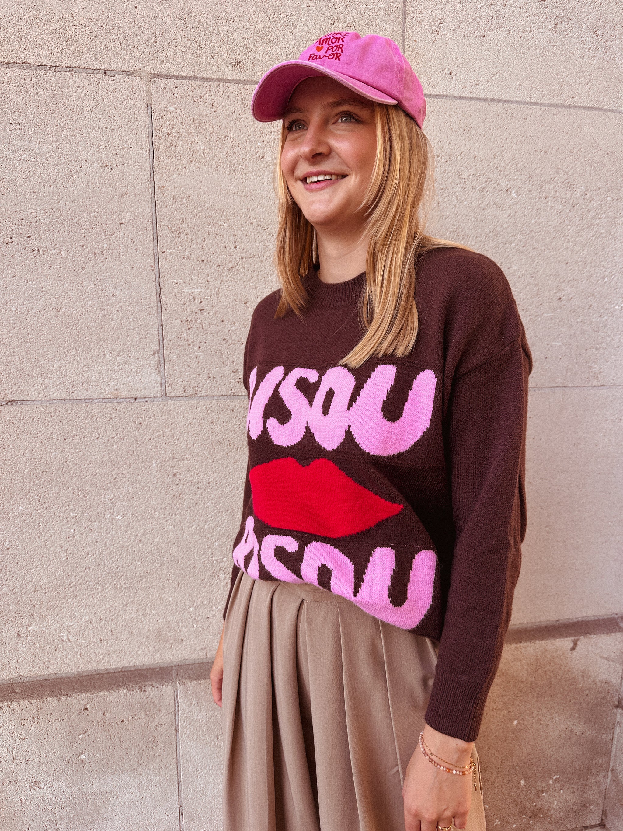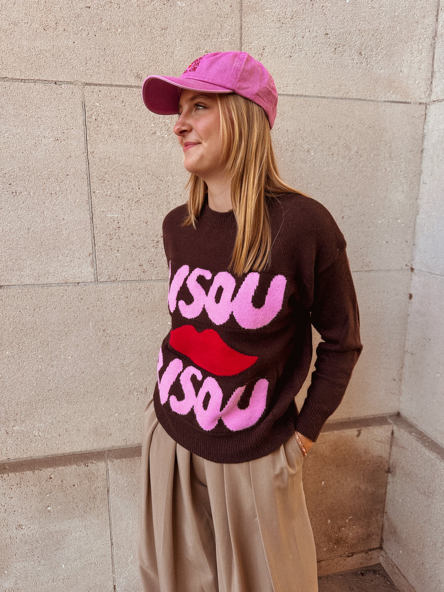 De Bisou Trui is een donkerbruine trui met lange mouwen die warmte en stijl perfect combineert. Op de voorkant staat “Bisou”, een kus, en nog eens “Bisou” — een speelse print die zorgt voor een charmante, romantische touch.