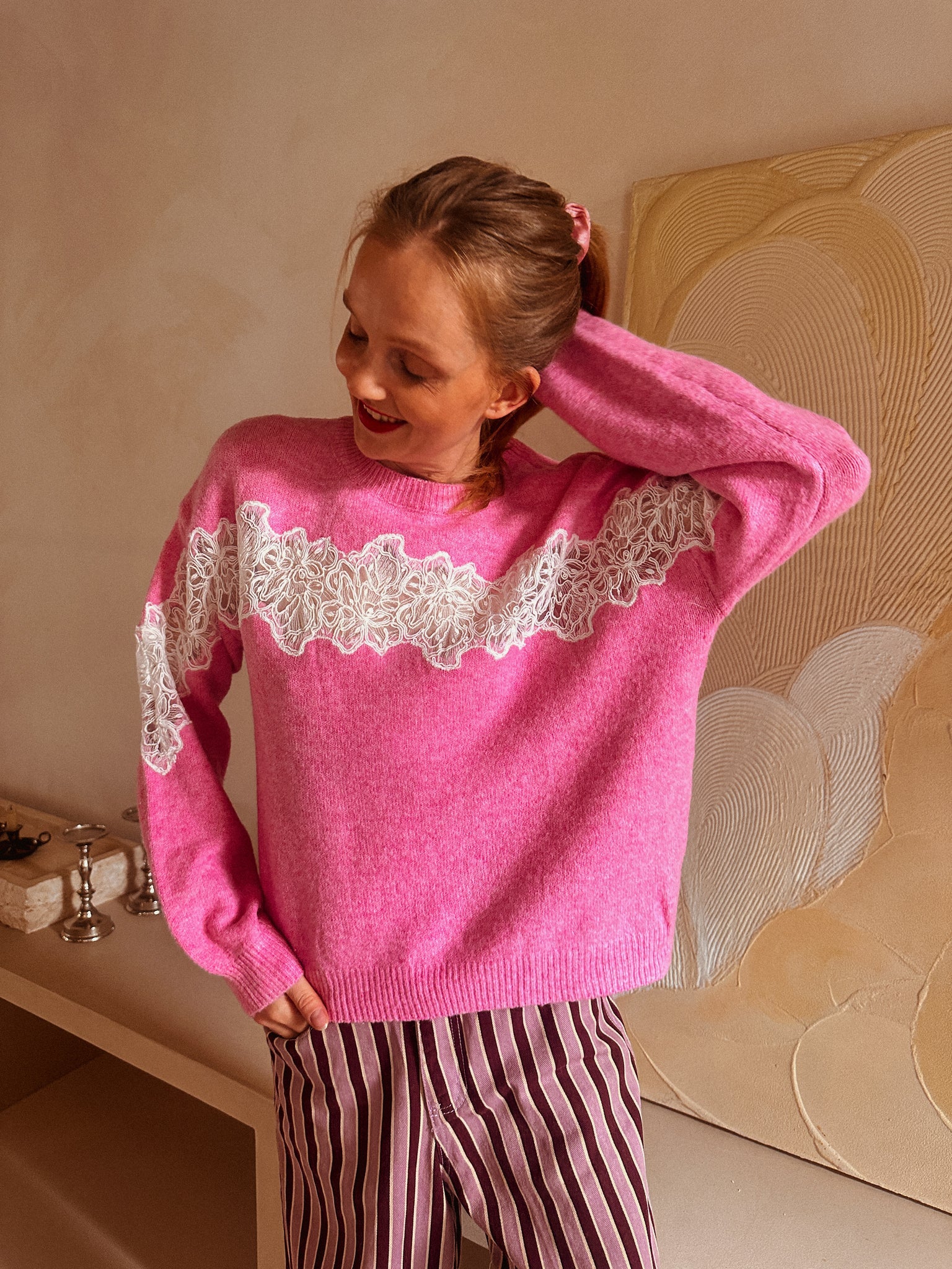 Zeg hallo tegen feminine charm in z’n mooiste vorm. Deze roze trui met subtiele witte kanten details is pure dromerigheid in textiel .