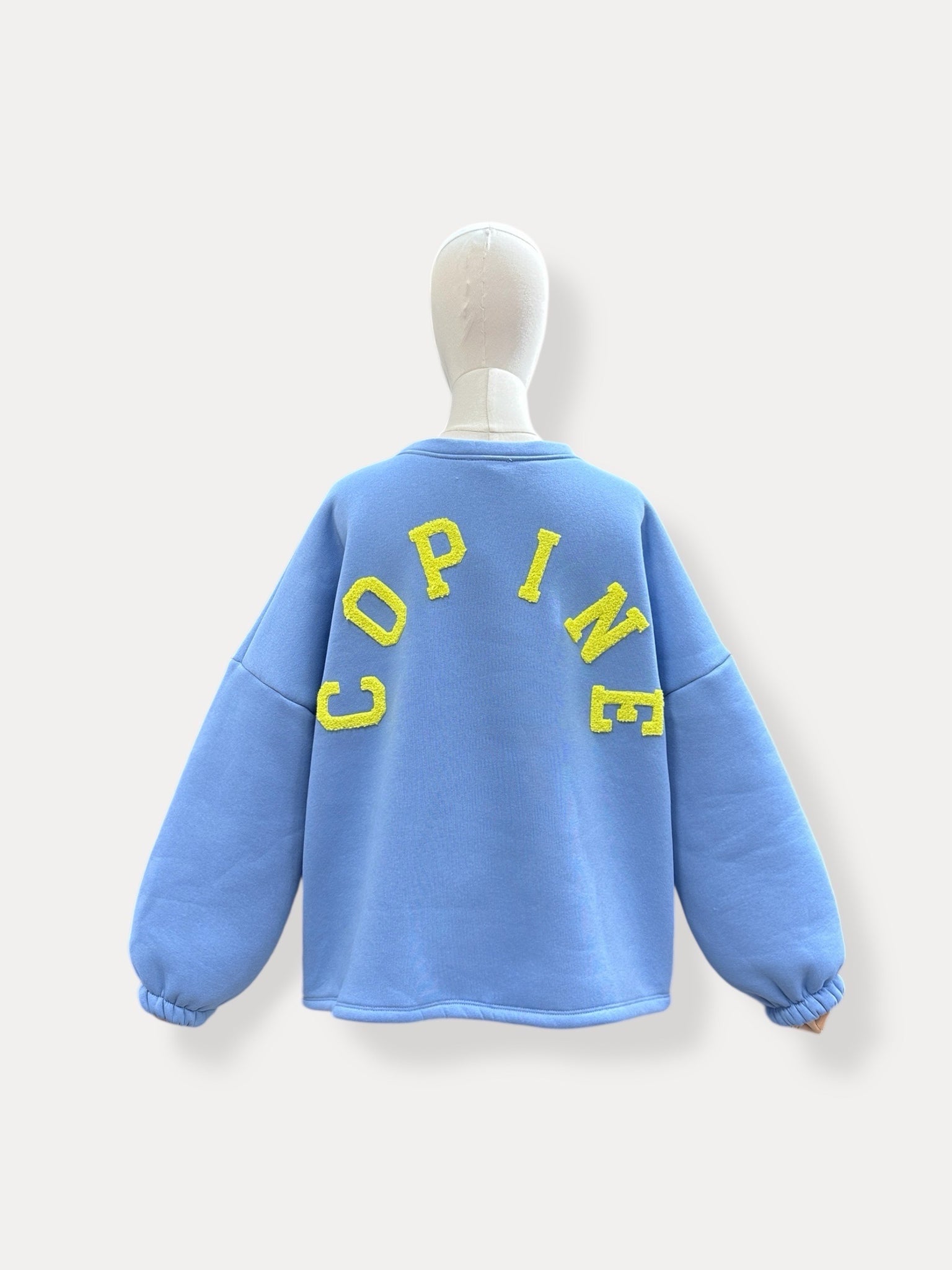 Deze oversized blauwe sweater met gele “copine”-letters is pure cozy vibes.