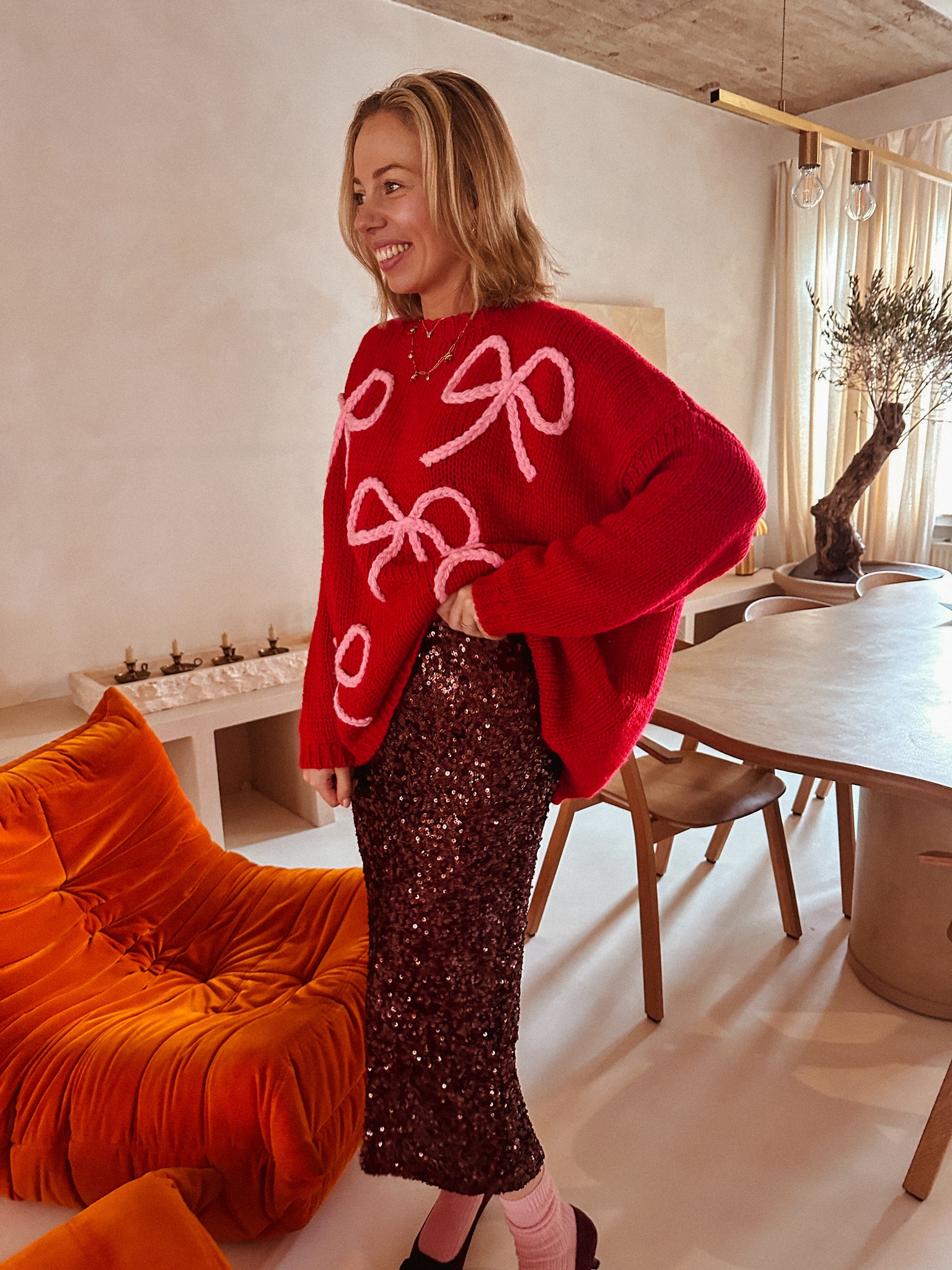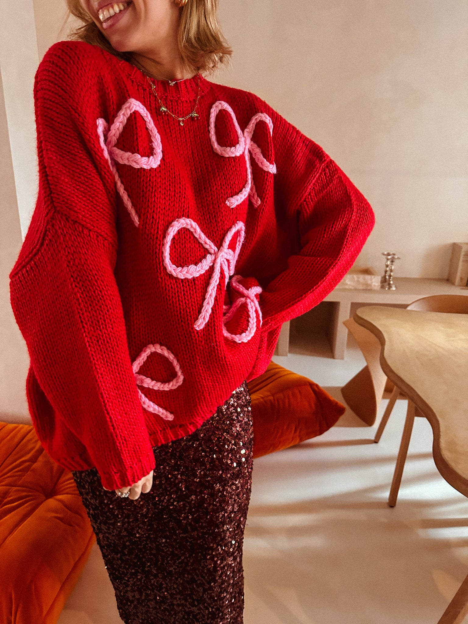 Ready to turn heads? Deze felrode oversized trui met zachte roze strikdetails is pure fashion joy! 🎀 Warm, zacht en een tikje over the top — precies zoals we het willen dit seizoen.