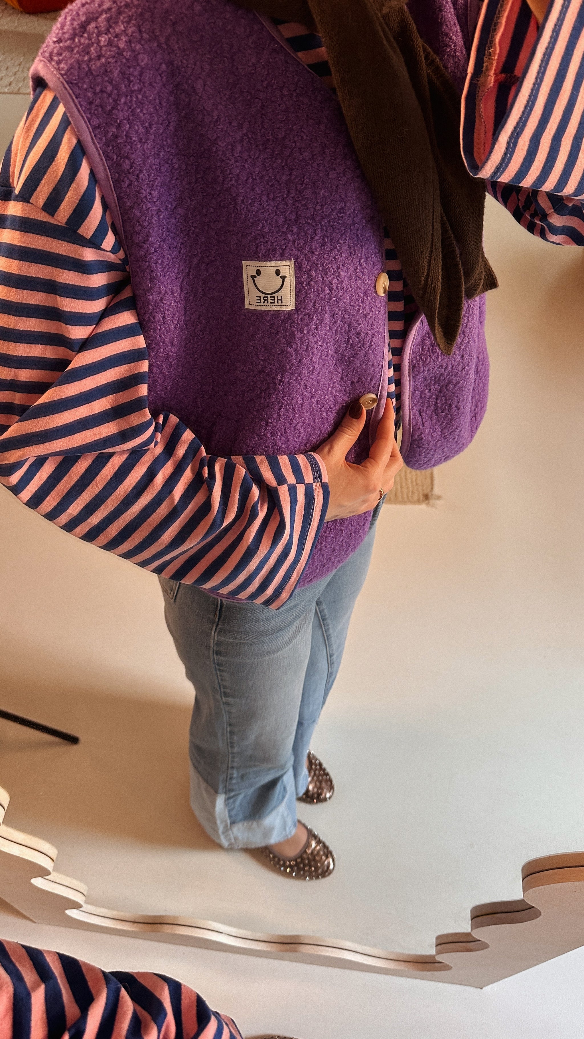 Ontdek onze Fie teddy bodywarmer. Warm, zacht en stijlvol: onze paarse teddy bodywarmer houdt je comfortabel én fashionable op frisse dagen. Praktische steekzakjes en drukknoopjes maken het ook nog eens super functioneel. 🧸