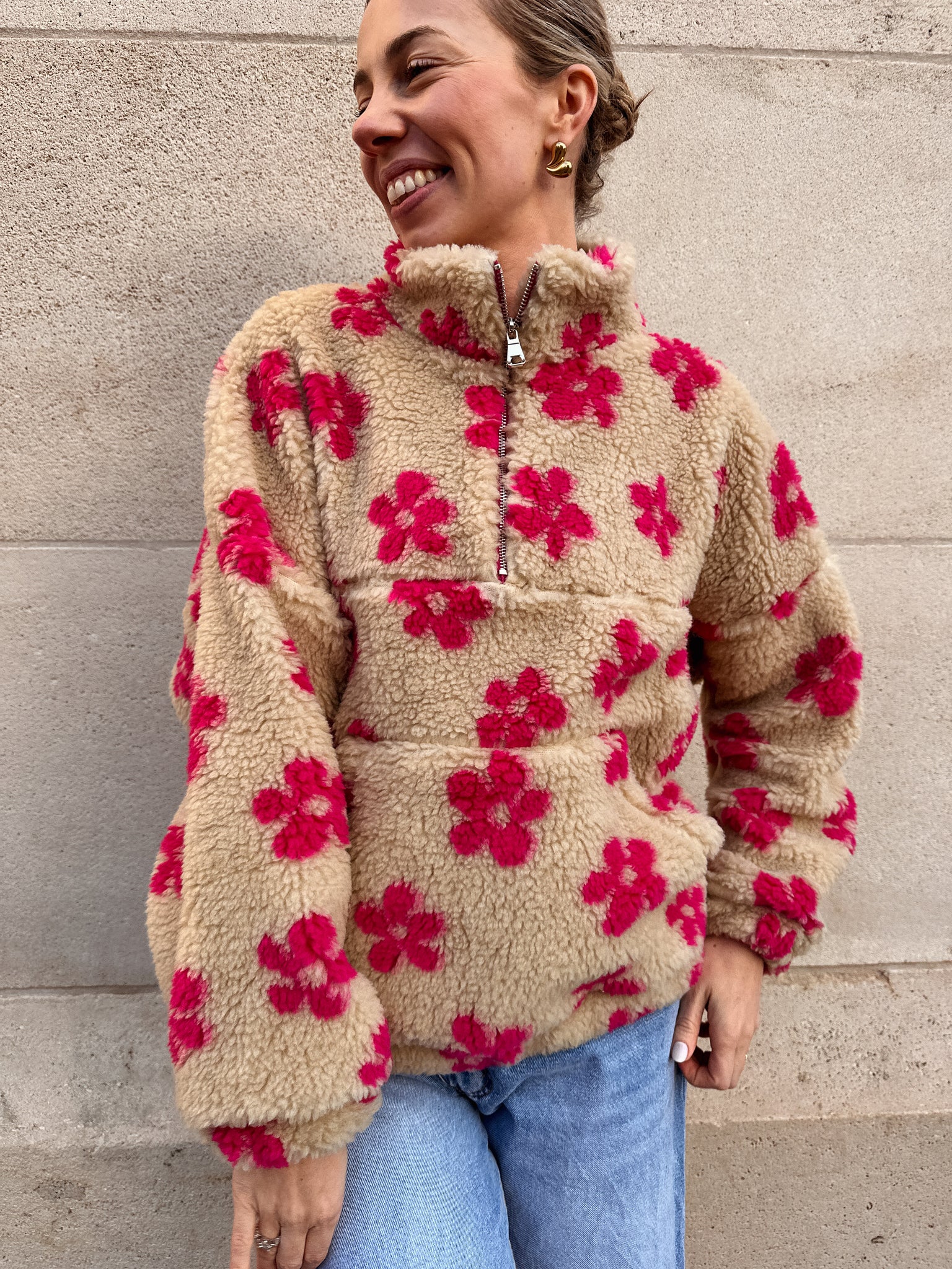 Deze fleece burgundy trui met beige bloemen is heerlijk zacht en perfect voor een warme, vrouwelijke look.