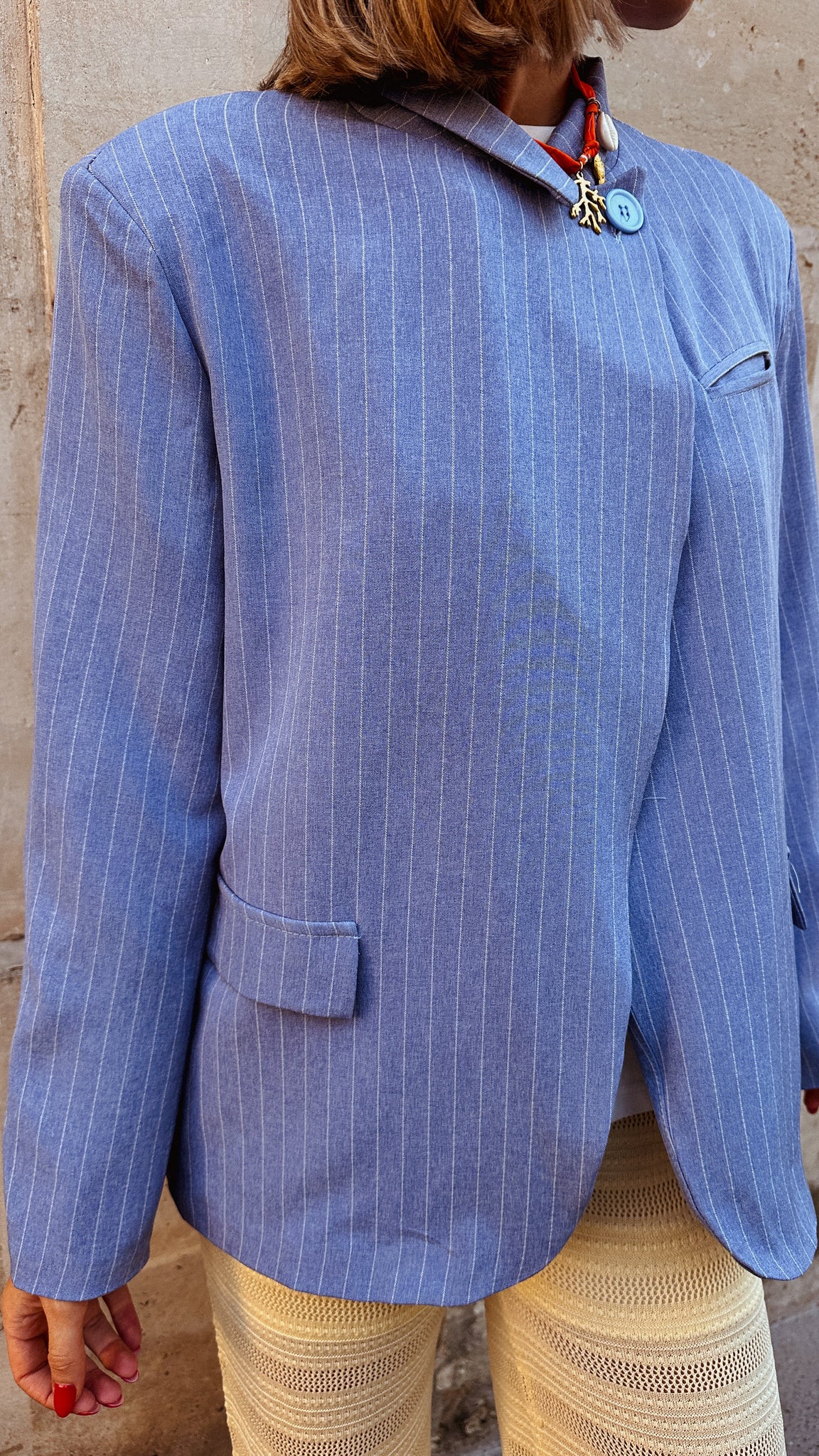 Wrap blazer in denim look. Deze blazer is een echte musthave voor jouw kast. Het is een elegant model met maar 1 knoop aan de hals. Het assymetrische design zorgt voor een trendy uitstraling.